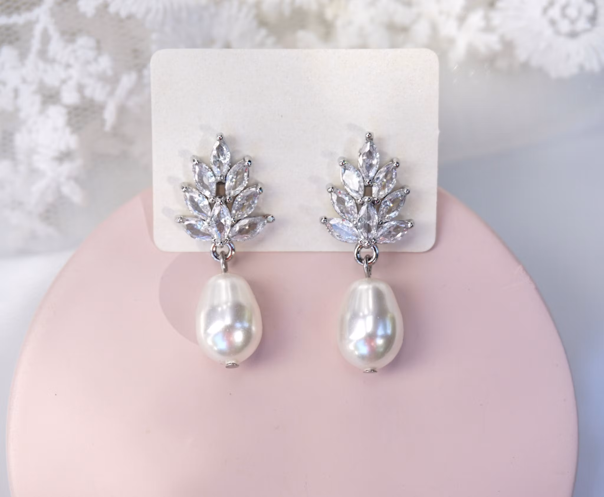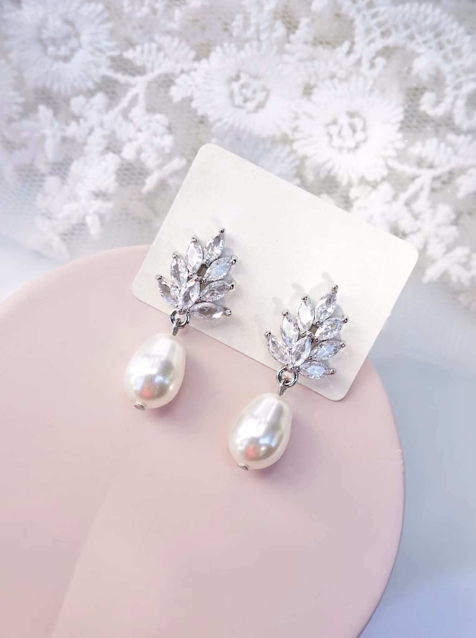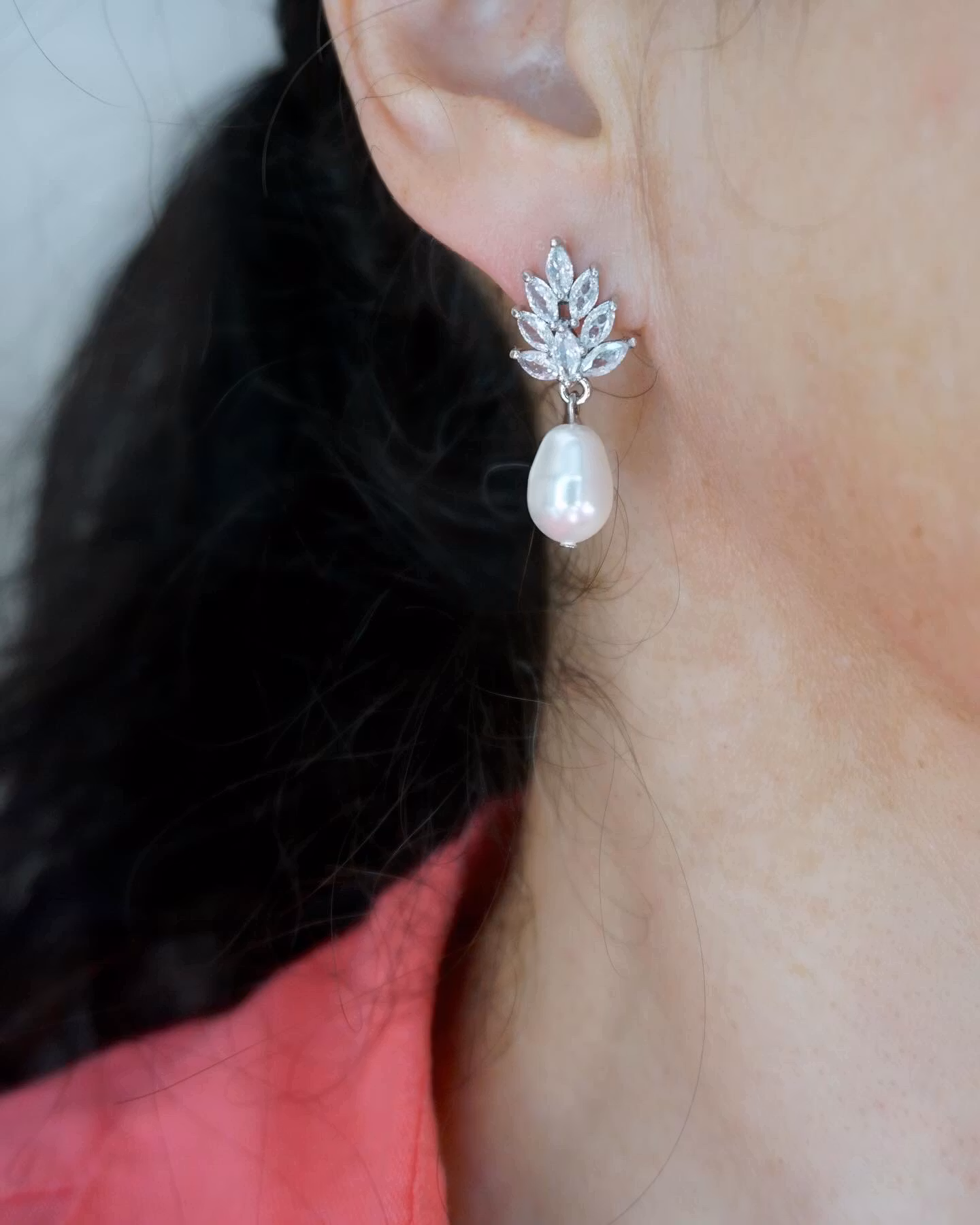 Søte øredobber med zirconia i toppen og hvit krystallperle under.