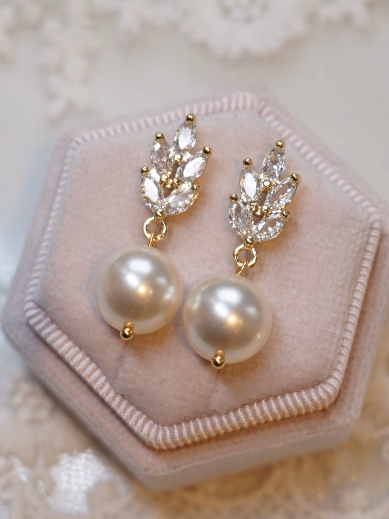 Søt øredobb med zirconia i toppdelen og en østerriksk krystallperle (12mm) under. Gullfarget metall. Piggen har 925 sølv i seg.
