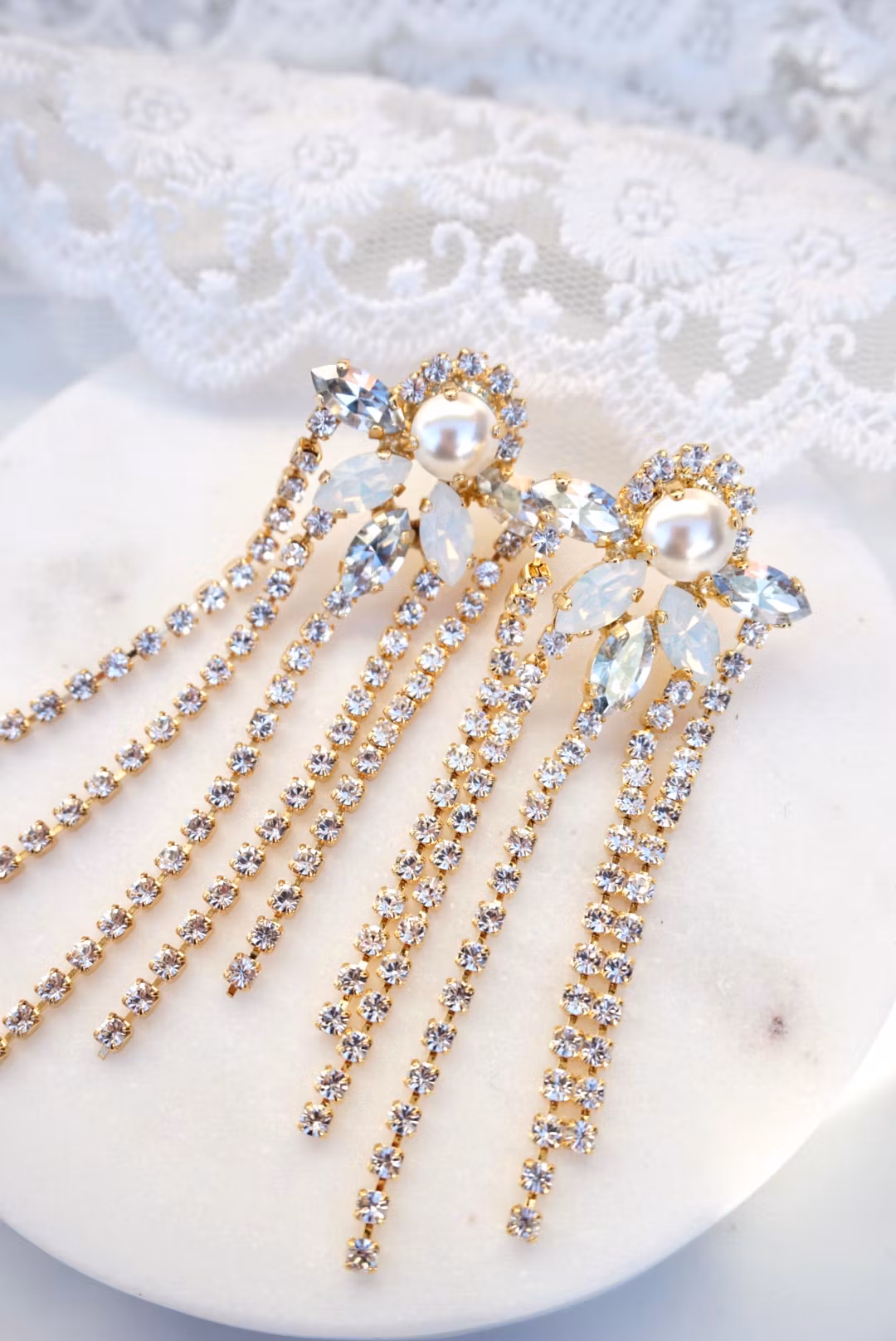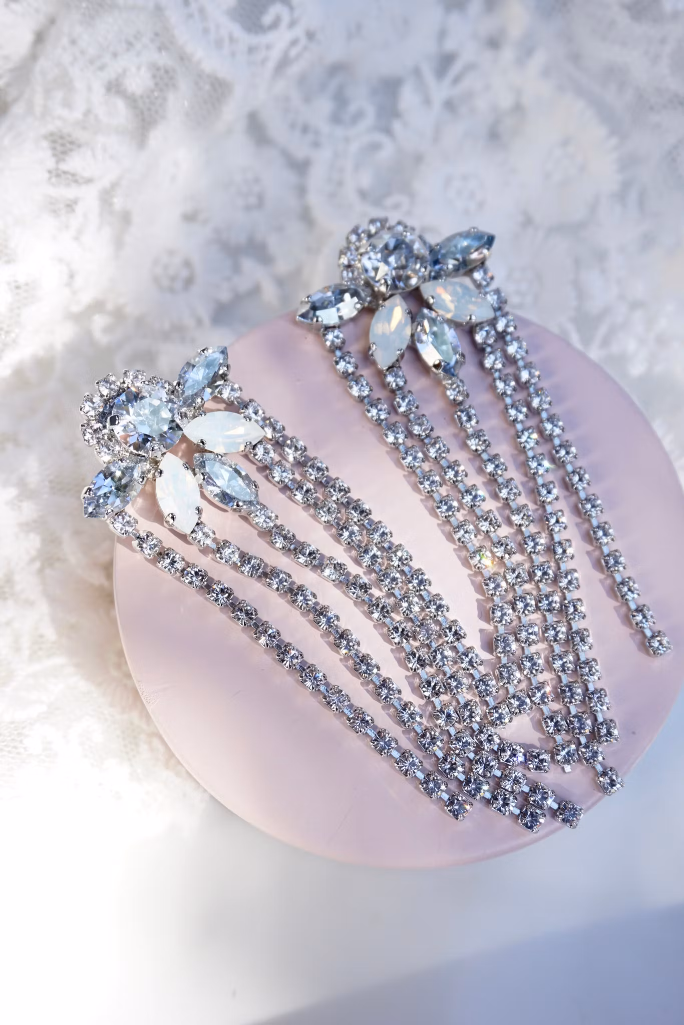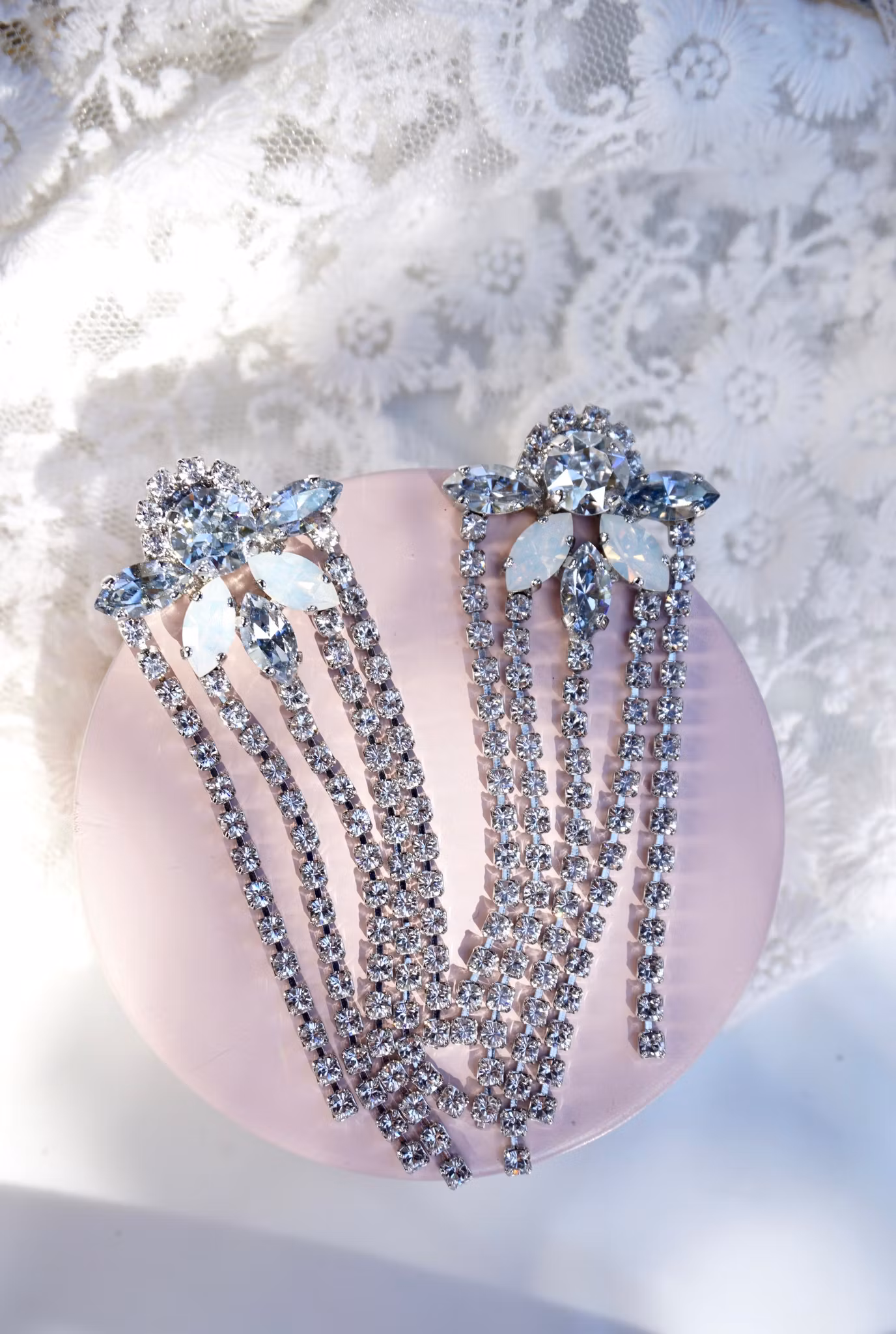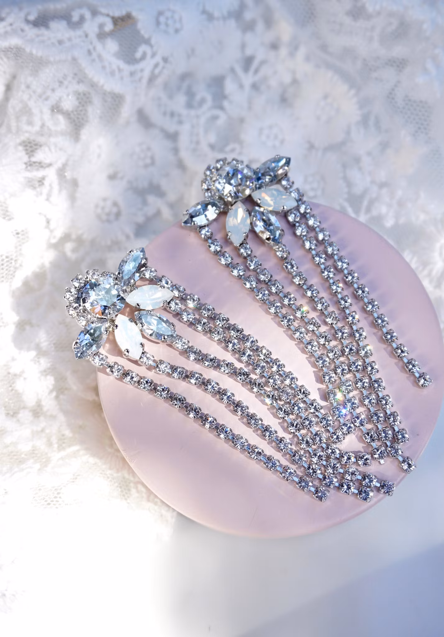 Absolutt spektakulære øredobber med krystaller fra bunn til topp! Nydelige og skinnende tynne krystalltråder danser ned fra toppen, som har en blanding av lys isblått (Crystal Blue Shade) og White Opal.