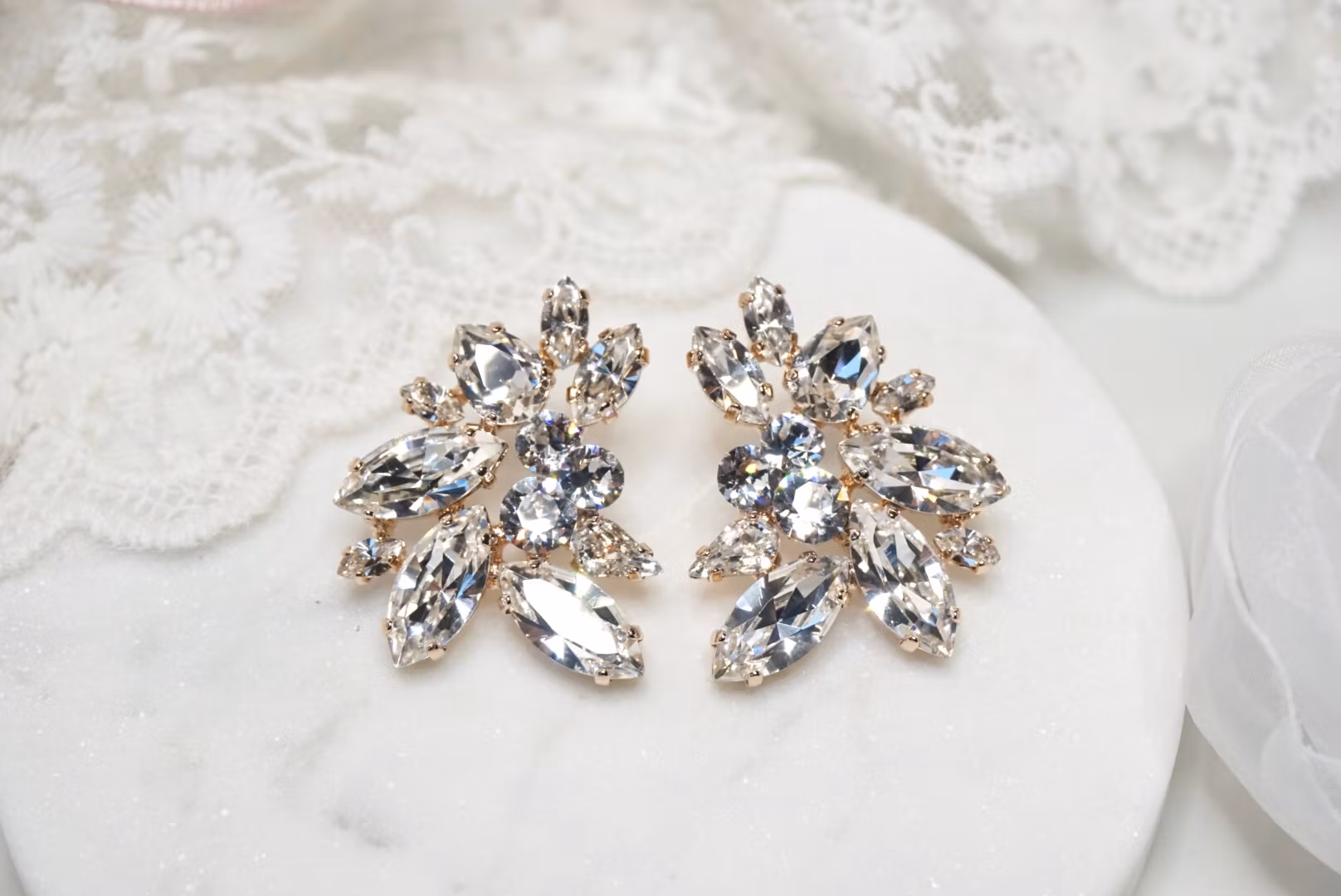 De vakreste, mest staselige og detaljerte øredobbene! Ubeskrivelig skinnende. Rhodium, gull (ikke avbildet) eller rosegull med blanke krystaller.