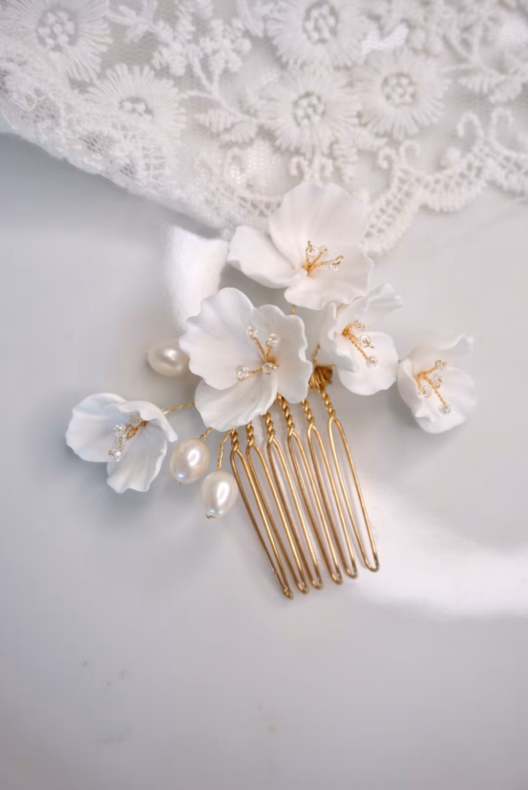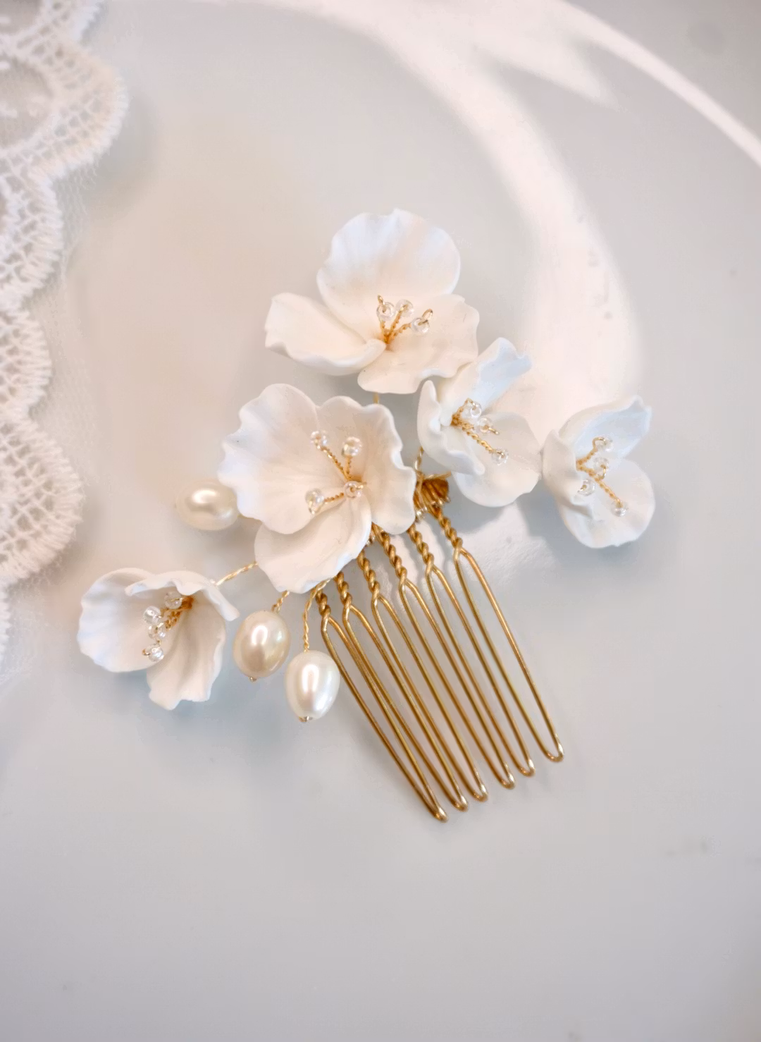 Vakker og klassisk hårkam med hvite, håndlagede blomster i polymerleire og 3 perfekte ferskvannsperler.