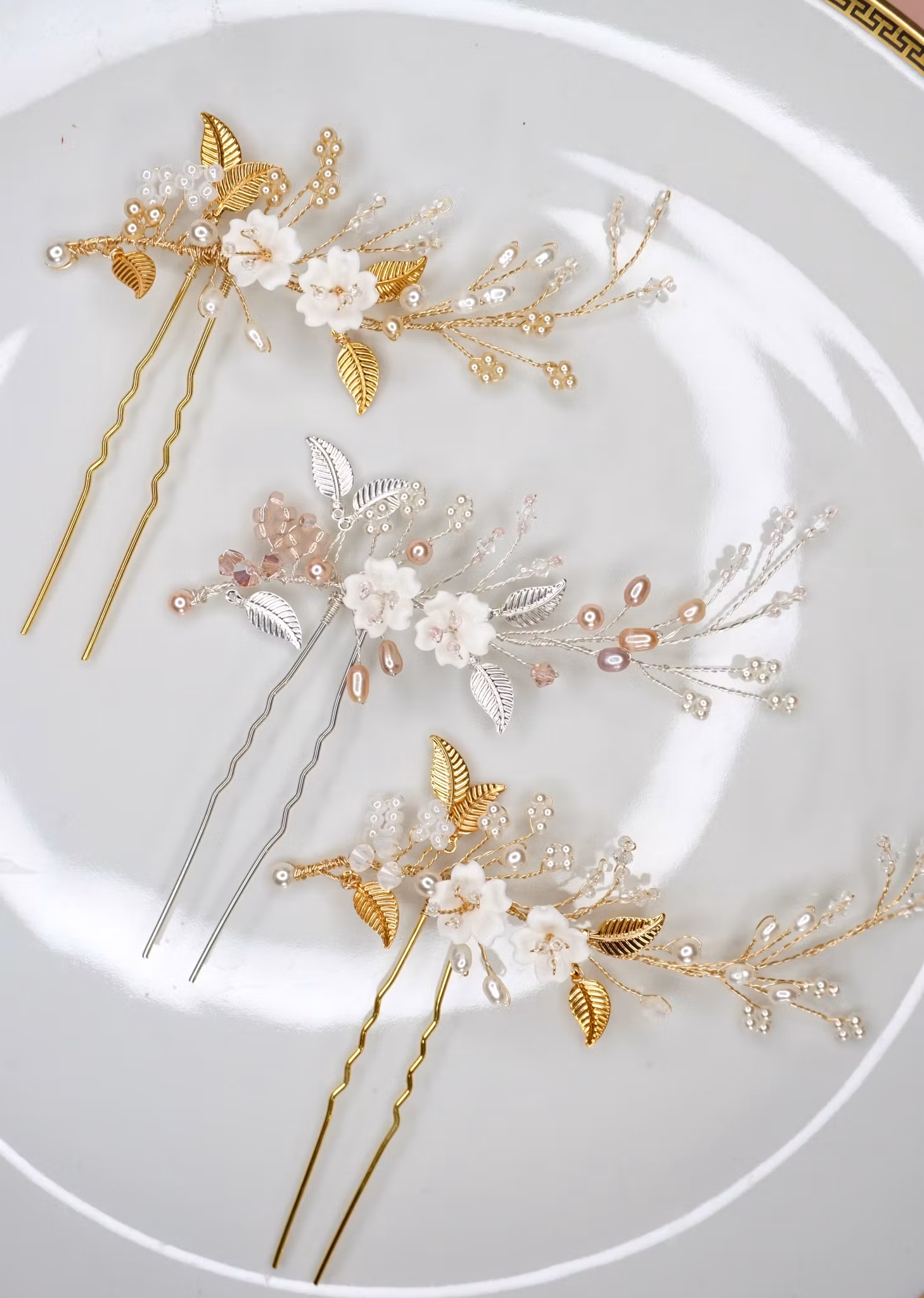 Søt og lett hårnål med et dryss av små krystallperler, ferskvannsperler og håndlagede blomster i polymerleire. Denne måler ca 10 cm.