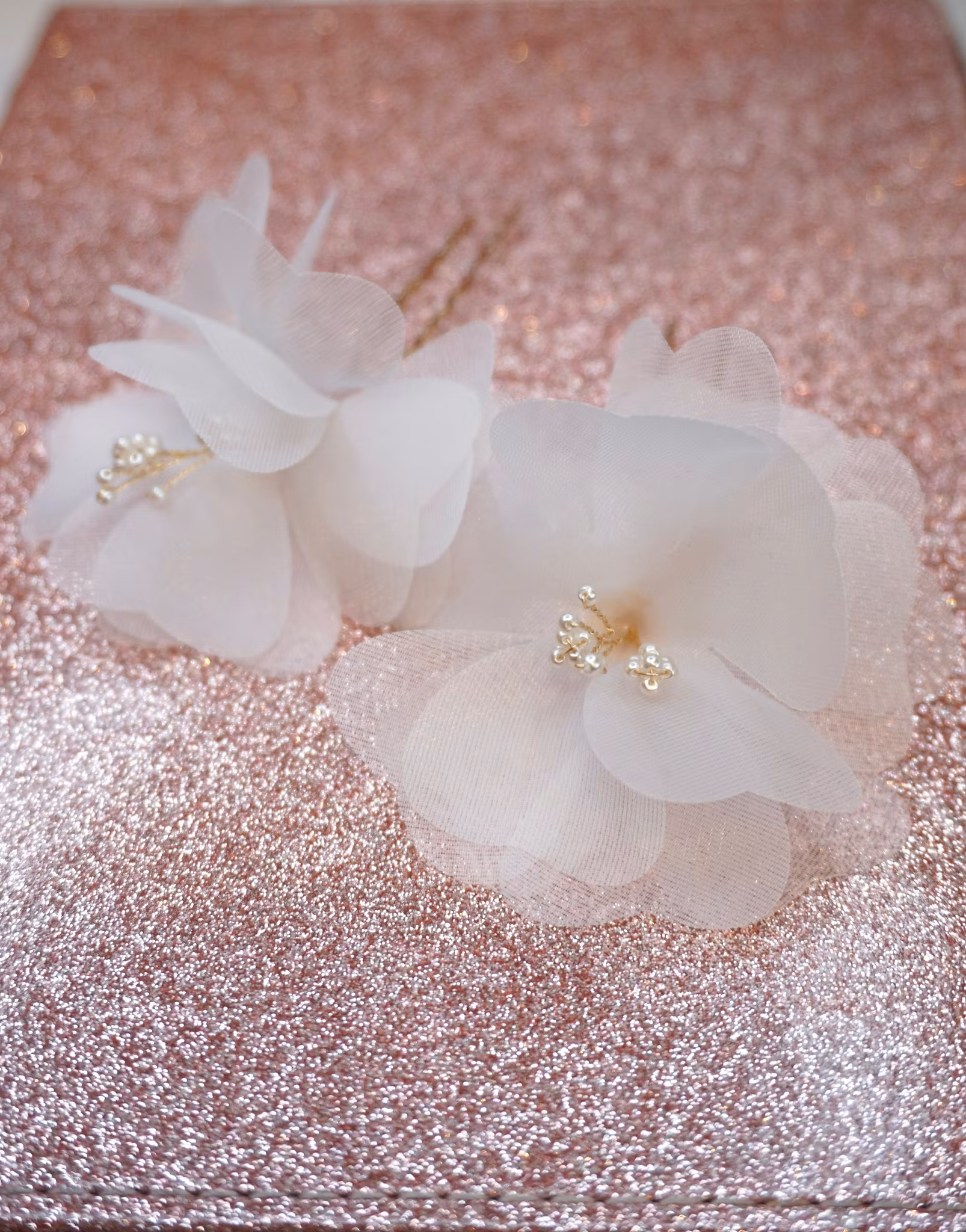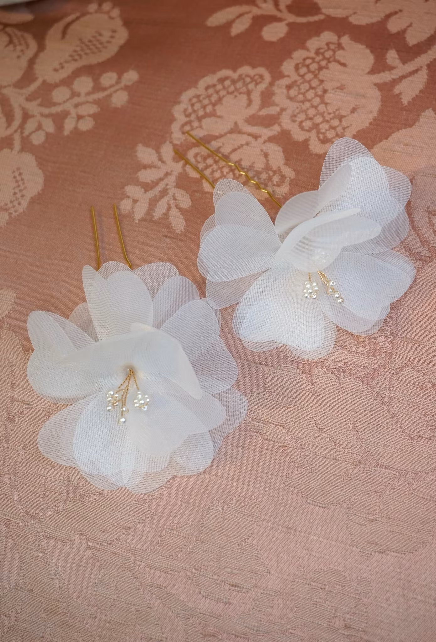 To store hvite chiffonblomster satt på hårnåler. Lange støvbærere med små hvite krystallperler.