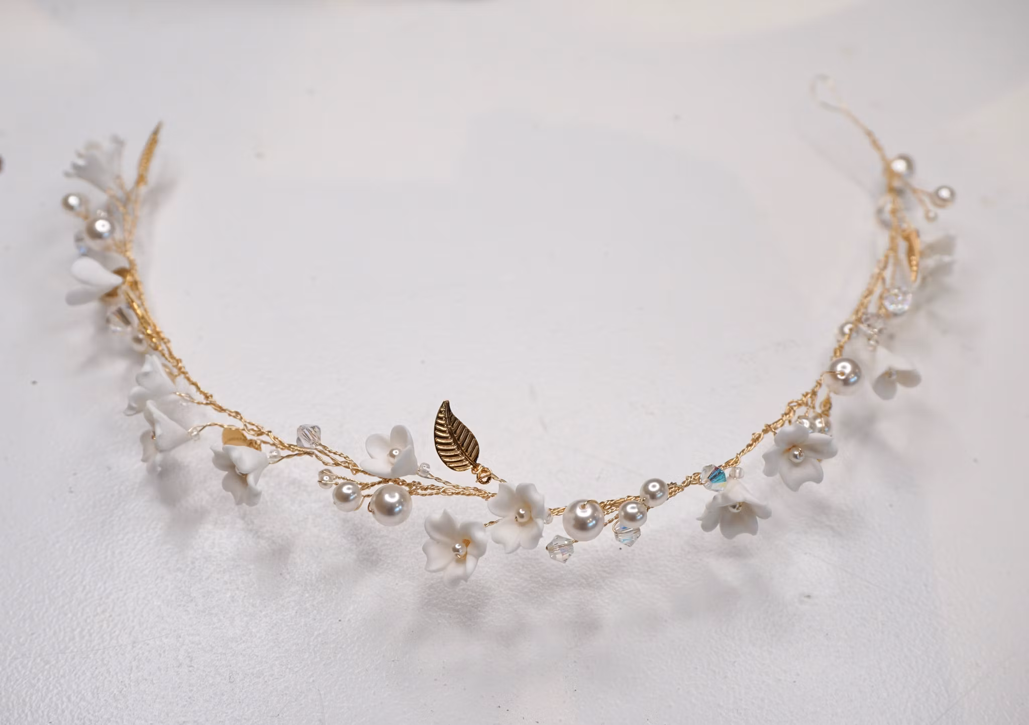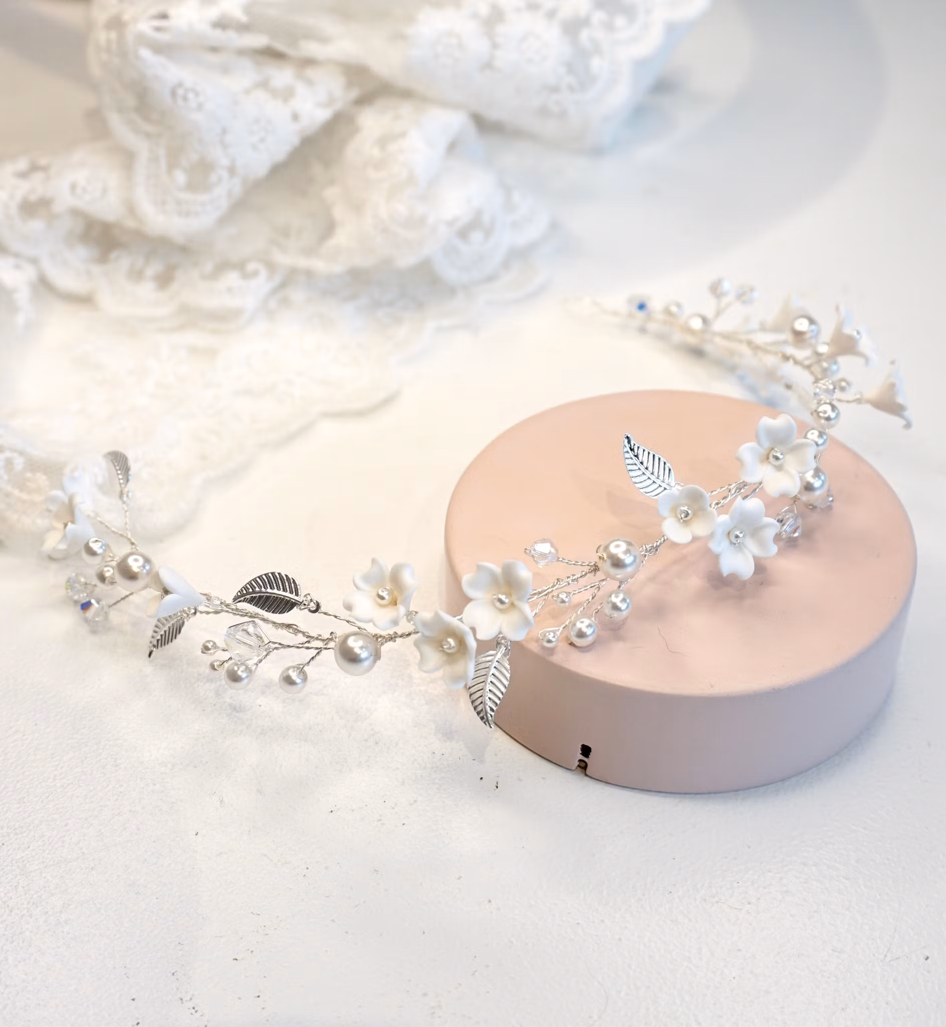 Et lite dryss av skinnende krystallperler, noen få glitrende krystaller for et snev av bling, og nydelige små blomster i hvit polymerleire (håndlaget i Ukraina).
