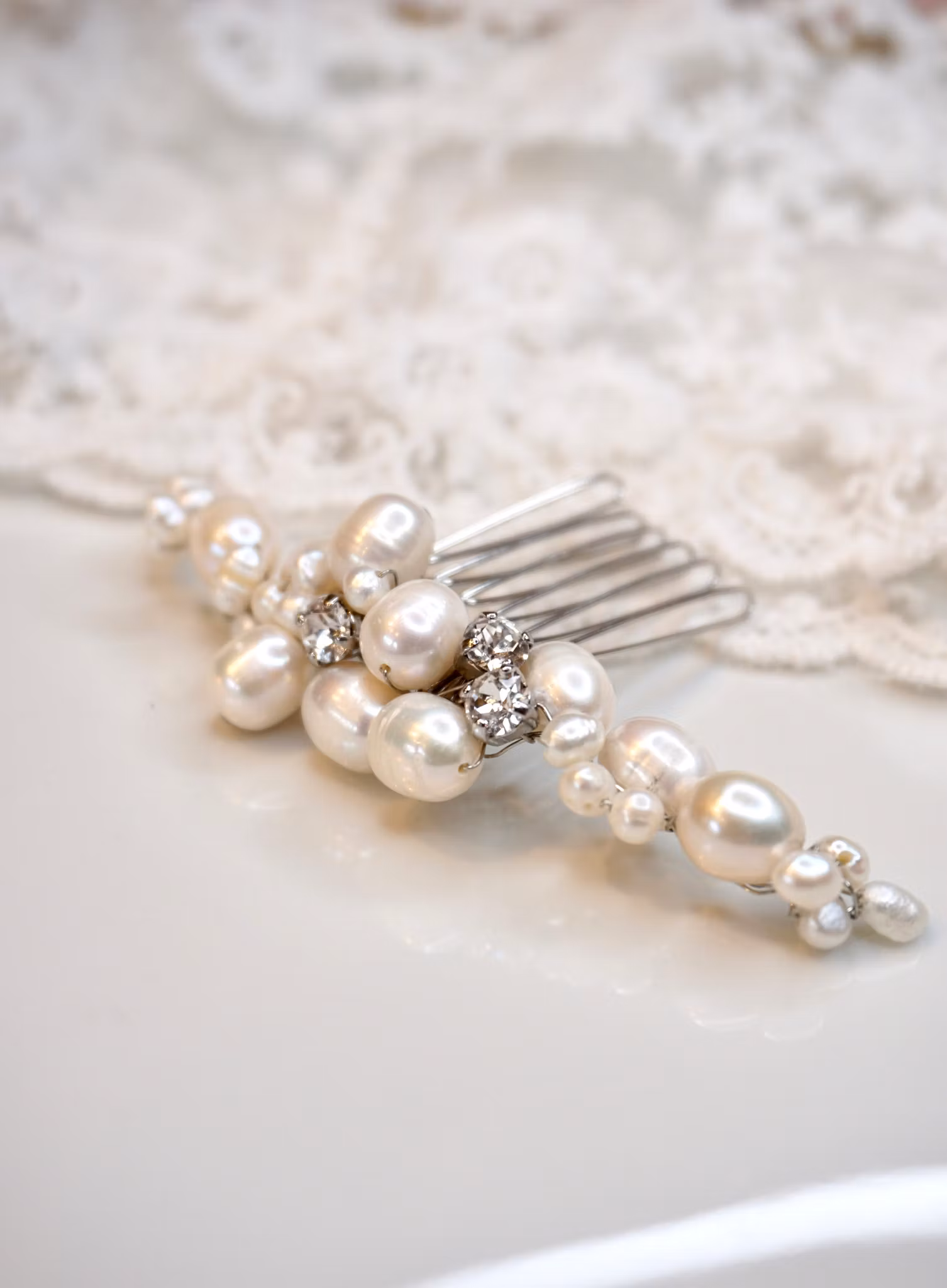 Klassisk hårpynt med hvite nydelige ferskvannsperler (de store er ca 11mm) og tre små krystaller. Kammen måler ca 8-9 cm fra side til side og er tvinnet med tynn wire i sølvfinish. Kammen vil ikke være helt identisk som på bildet, men så lik som mulig.