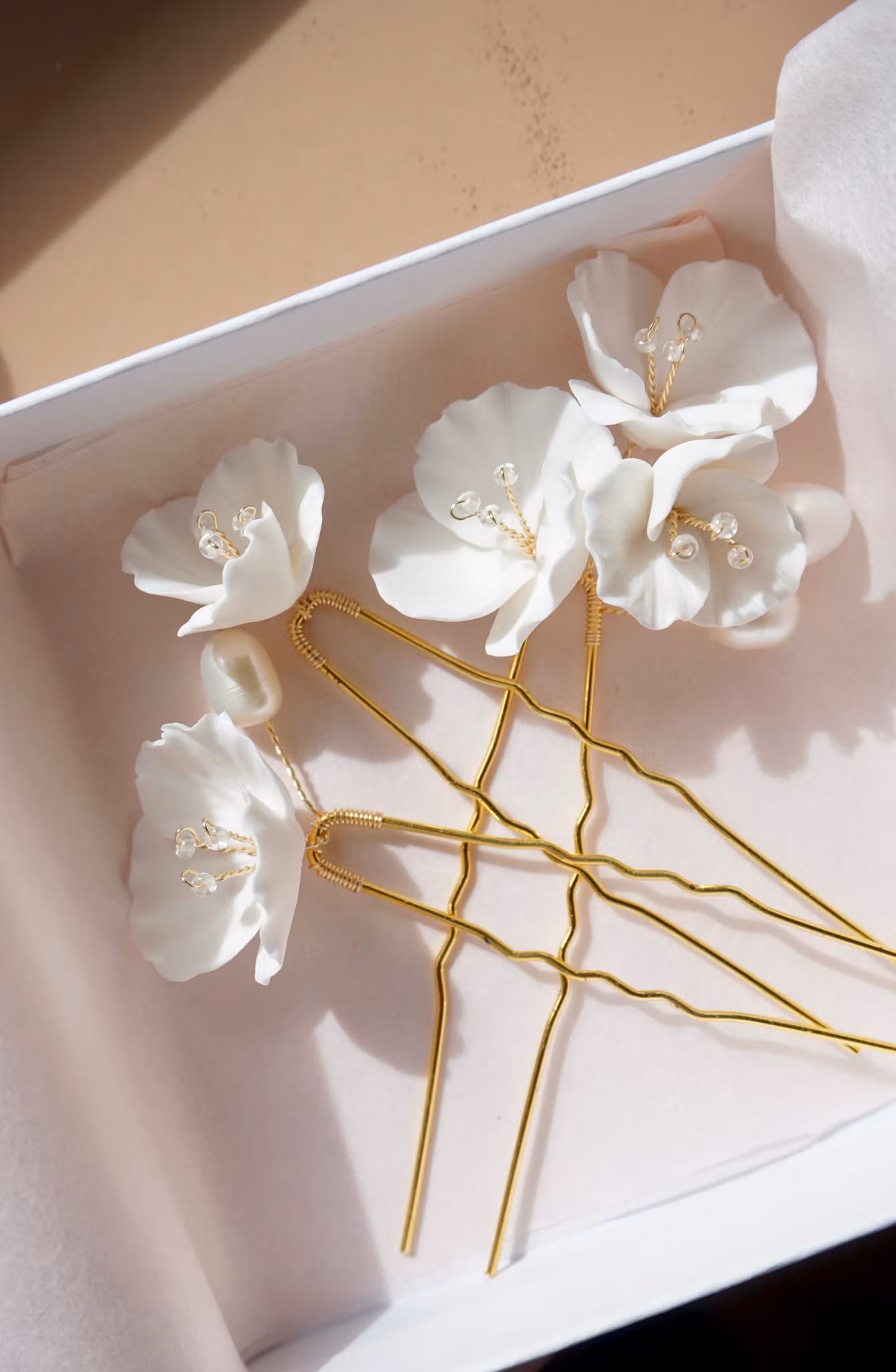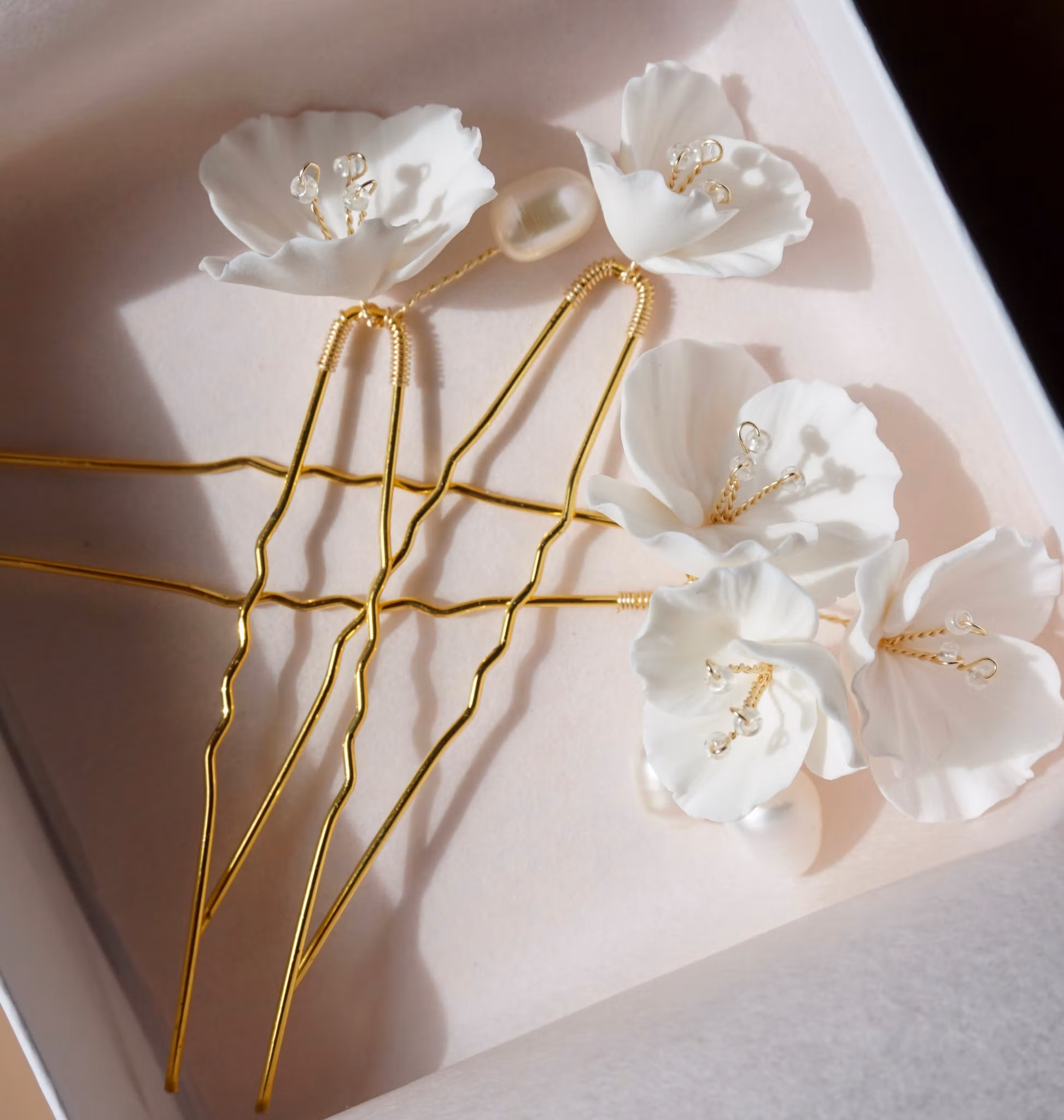 Utsøkte håndlagede hvite blomster i polymerleire med noen få vakre ferskvannsperler til, en utrolig vakker detalj å ha i håret!