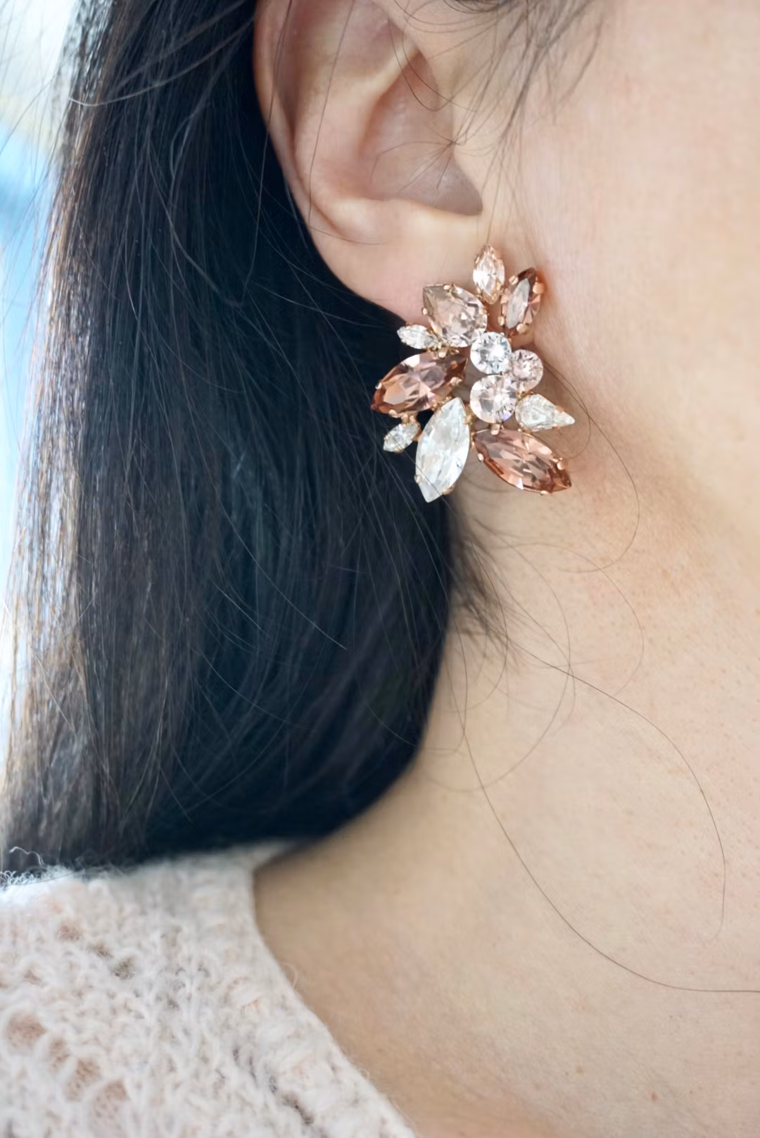 De vakreste, mest staselige og detaljerte øredobbene! Ubeskrivelig skinnende. Gull med krystallfargemix i champagne og perle.