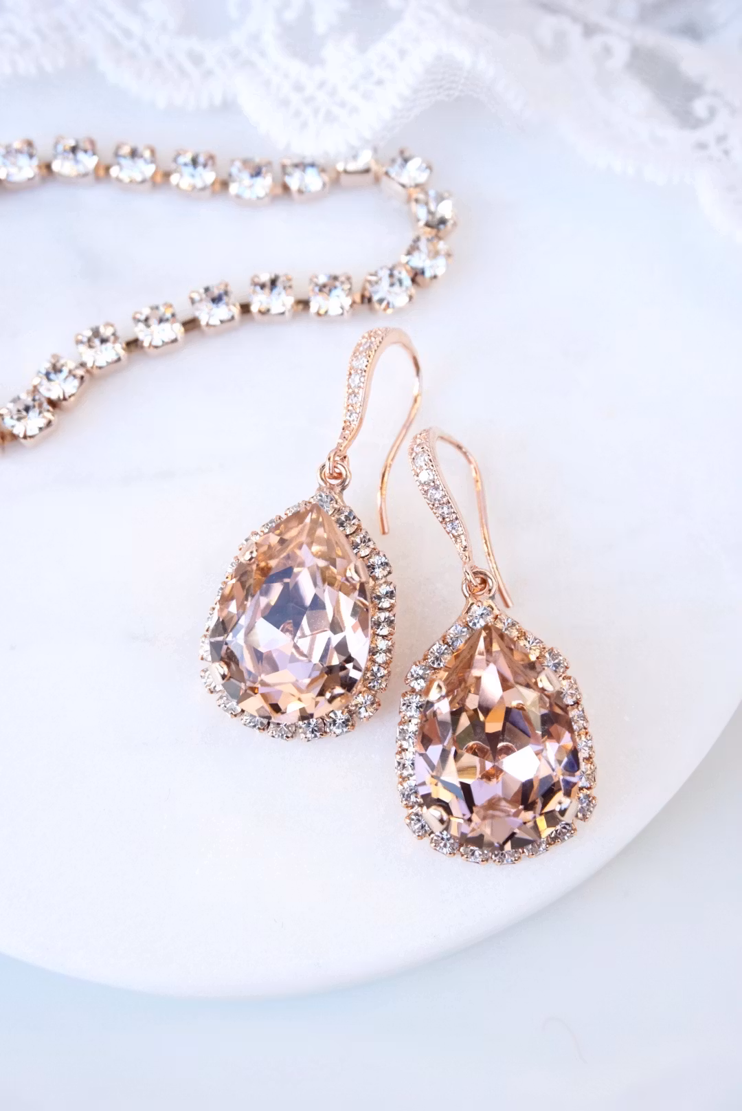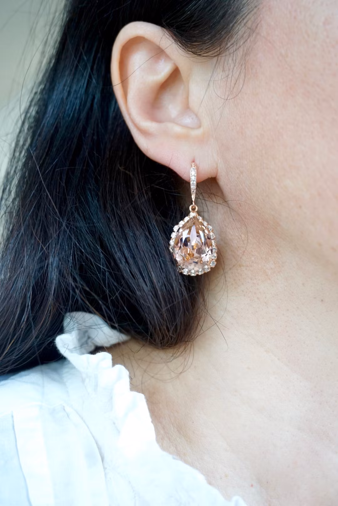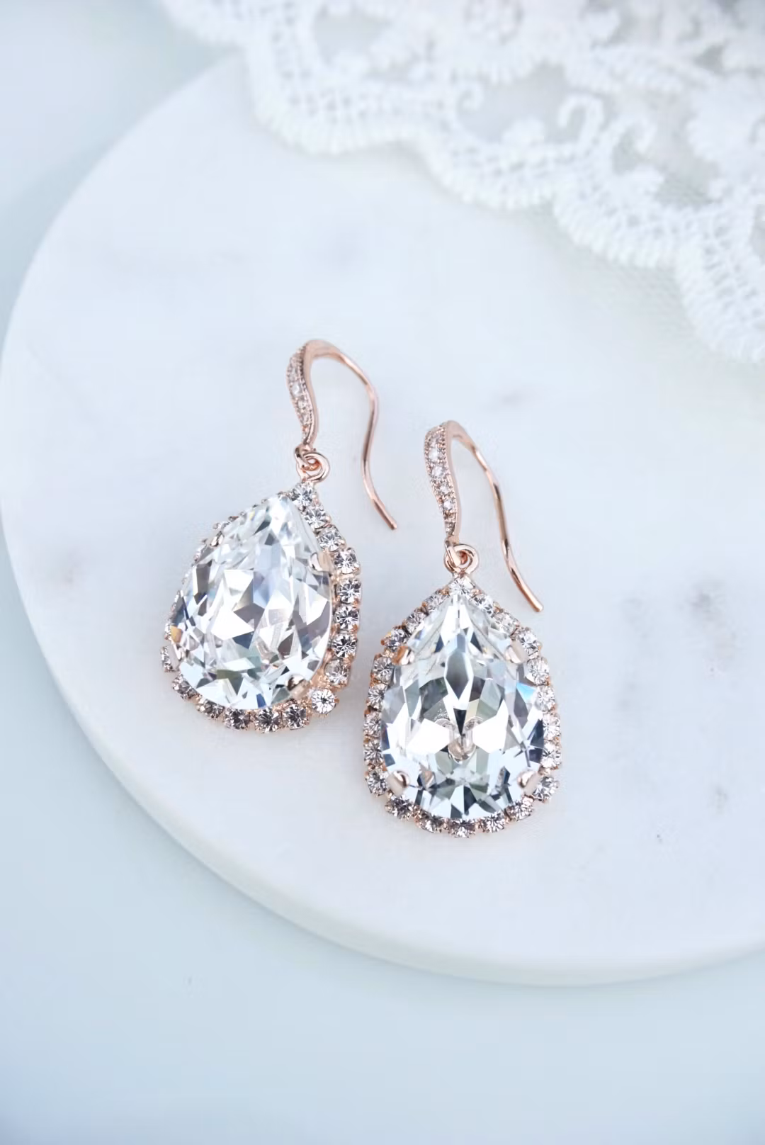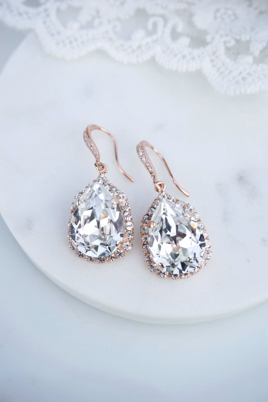De flotteste øredobbene, passer til anledningene når du virkelig vil skinne! Her i rosegull, og kanten rundt dråpen består av bittesmå blanke krystaller. I midten er en 18x13mm stor dråpekrystall av beste klasse. Alt er håndlaget.
