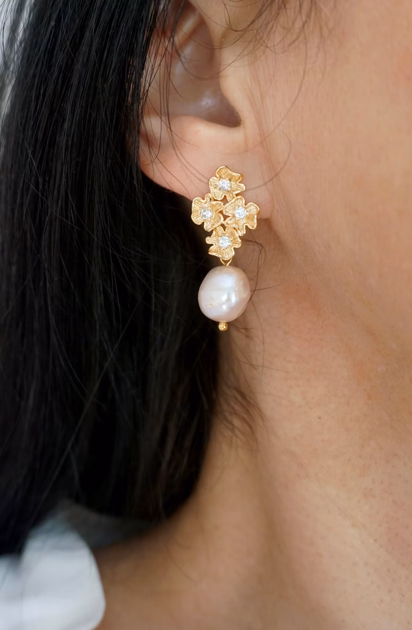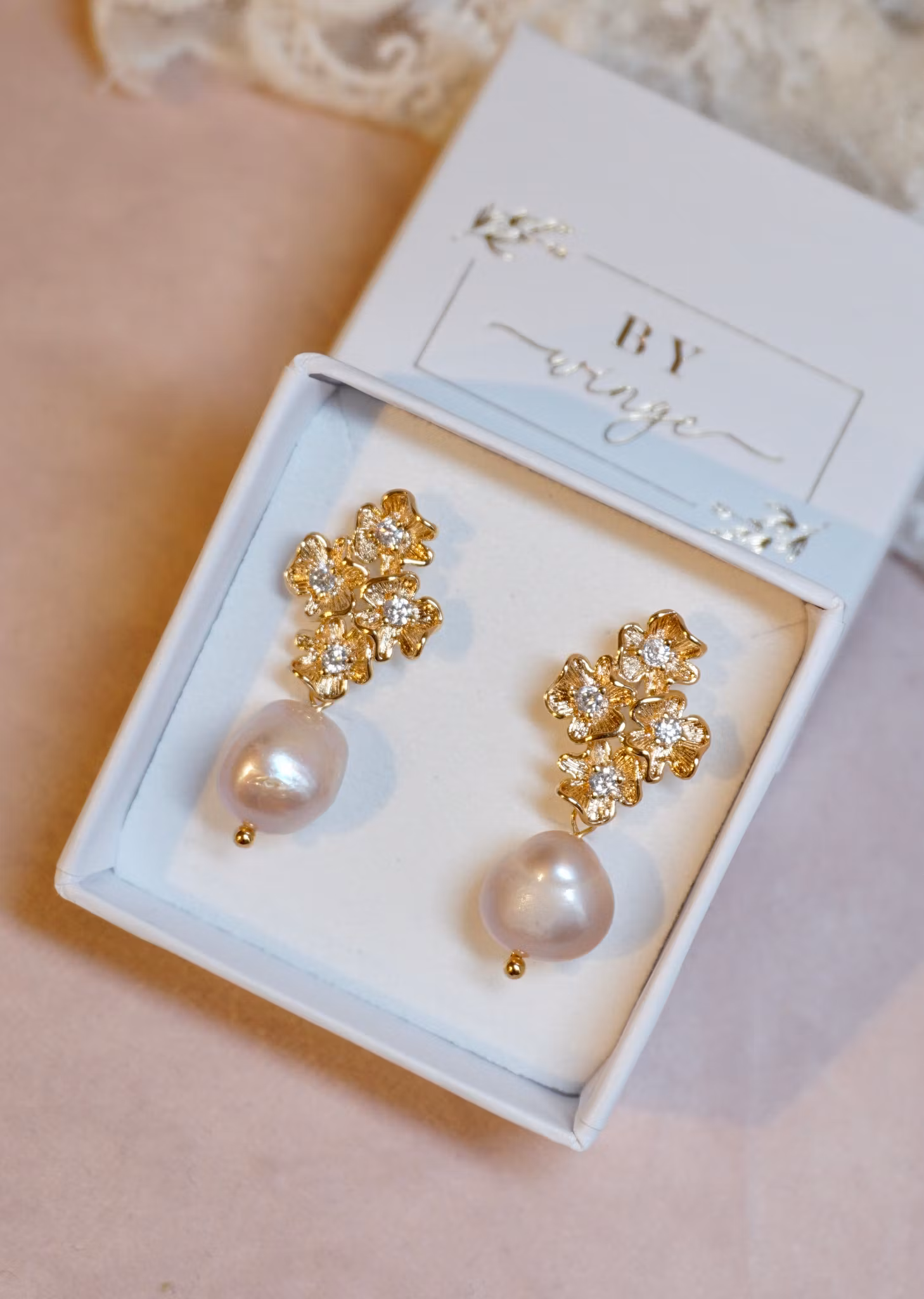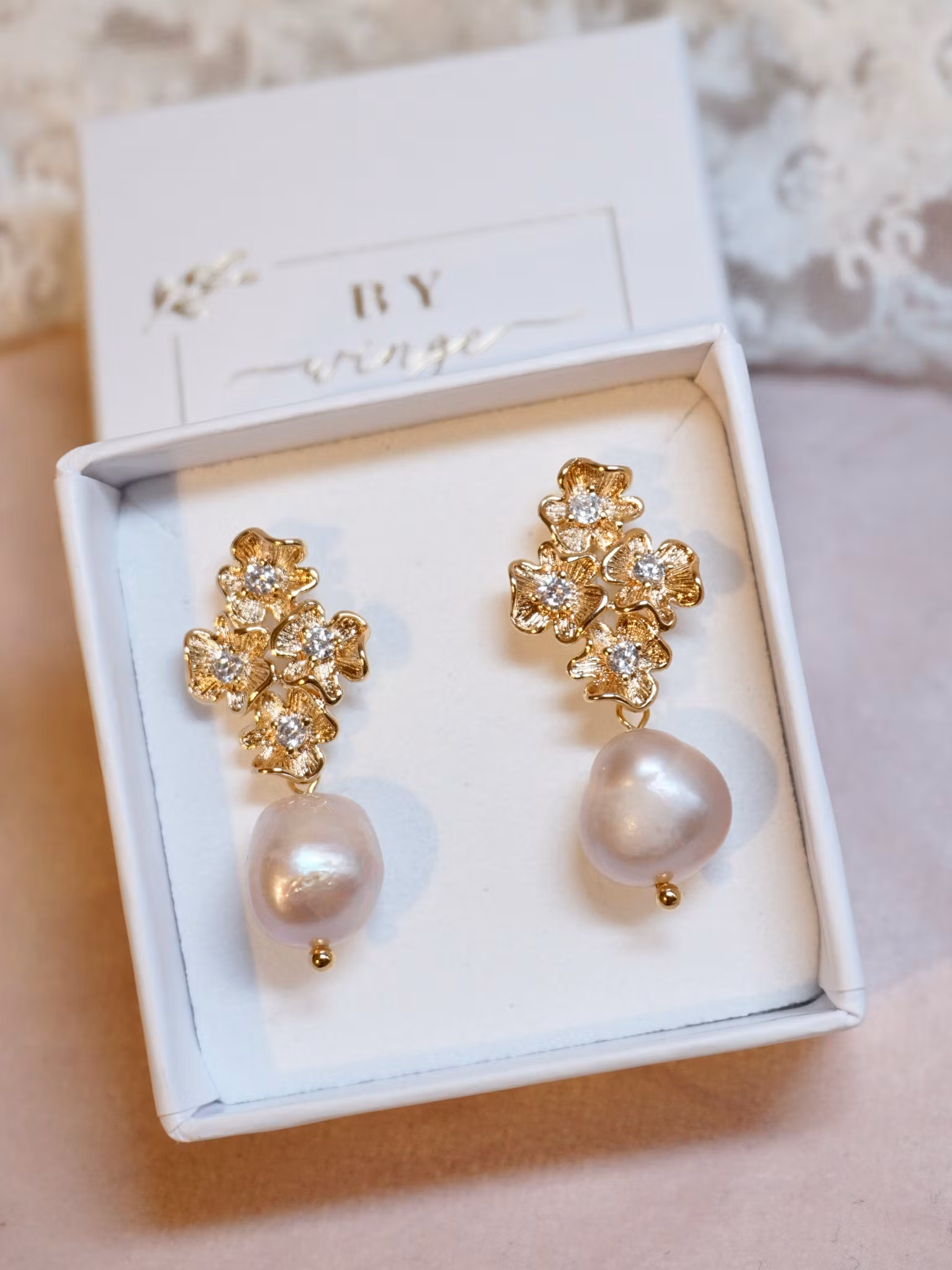 Søt gullfarget blomstertopp med hvite ferskvannsperler. Perlene er ujevne og uperfekte!