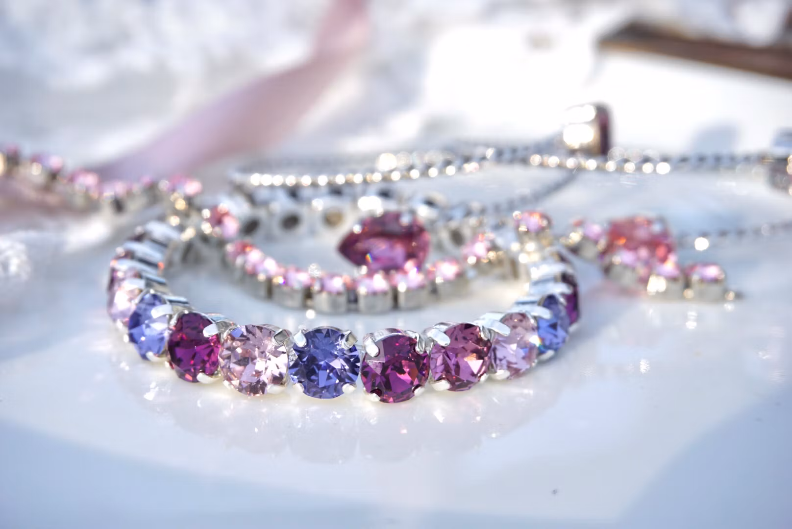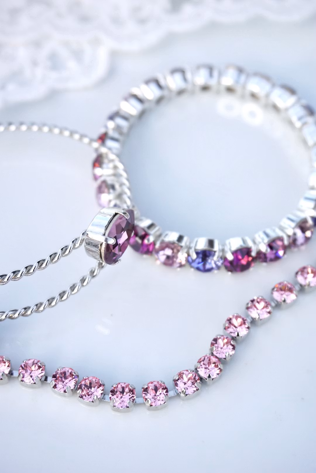 Skinnende og kult håndlaget stretcharmbånd med krystaller av beste klasse! Fargene er i forskjellige lillatoner, og metallet sølvfarget. Krystallene er 8mm.