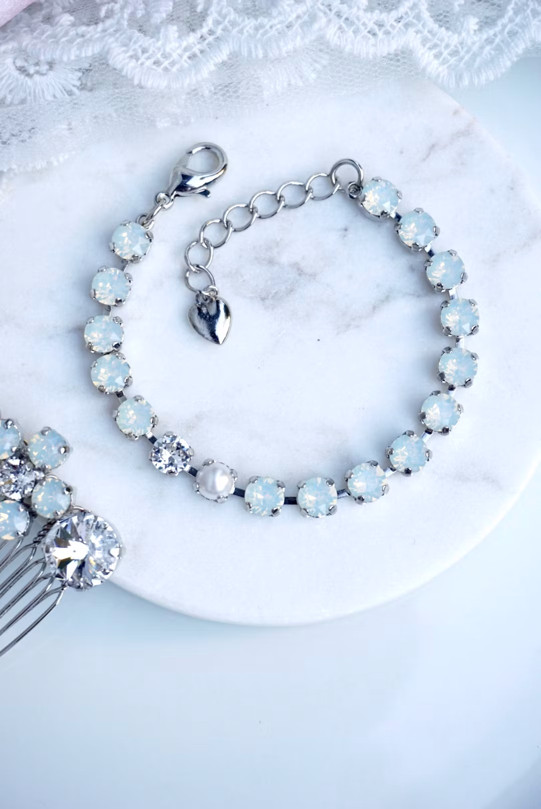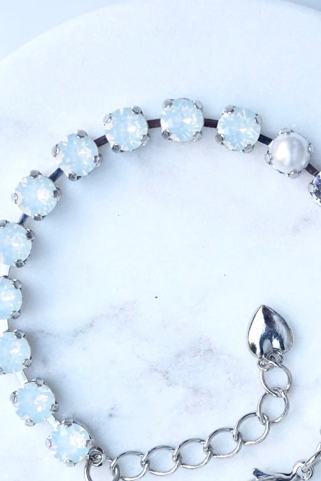 Vakkert smalt armbånd (6mm bredt) i rhodium med White Opal og en liten detalj i perle og blank krystall.