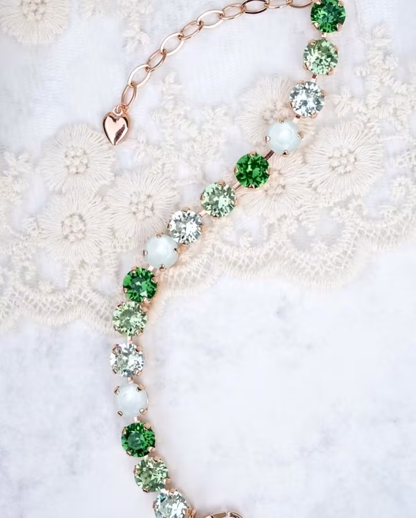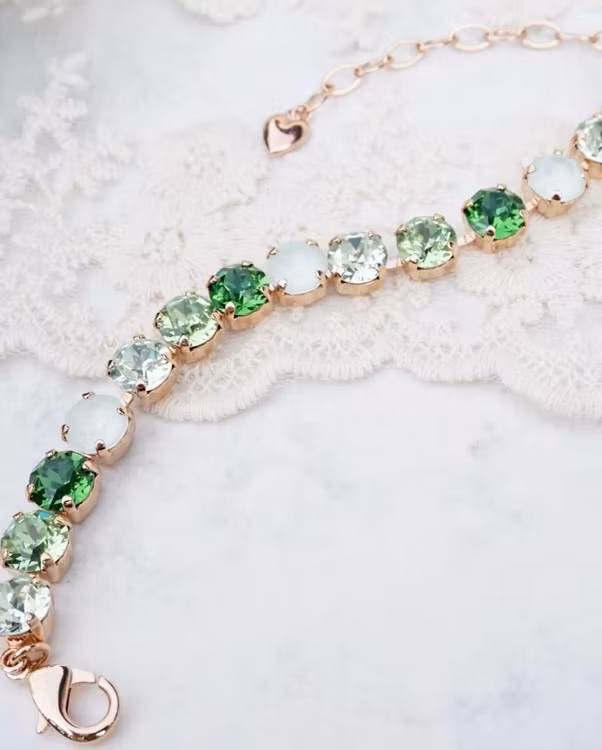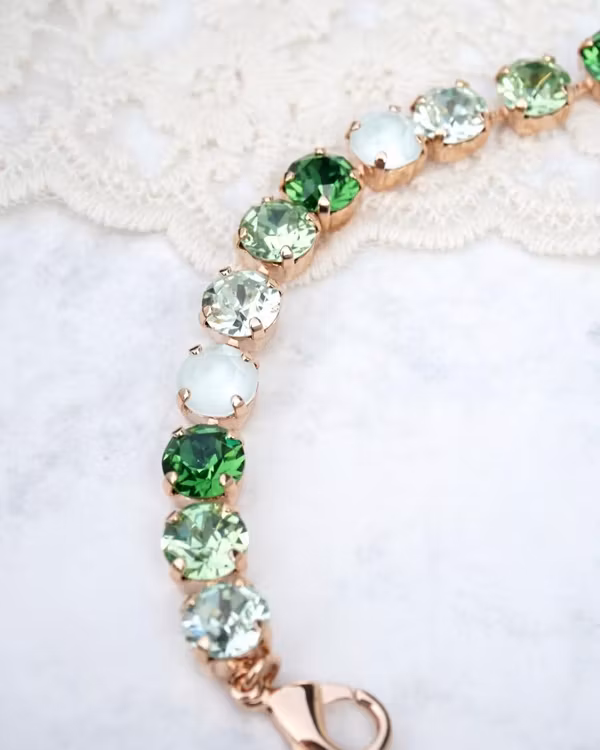 Cup-chainarmbånd i rosegull med grønn mix av krystaller. Selve armbåndet måler 17,5 cm, pluss ekstralenke 4 cm hvis du ønsker. Krystallene er 8mm.