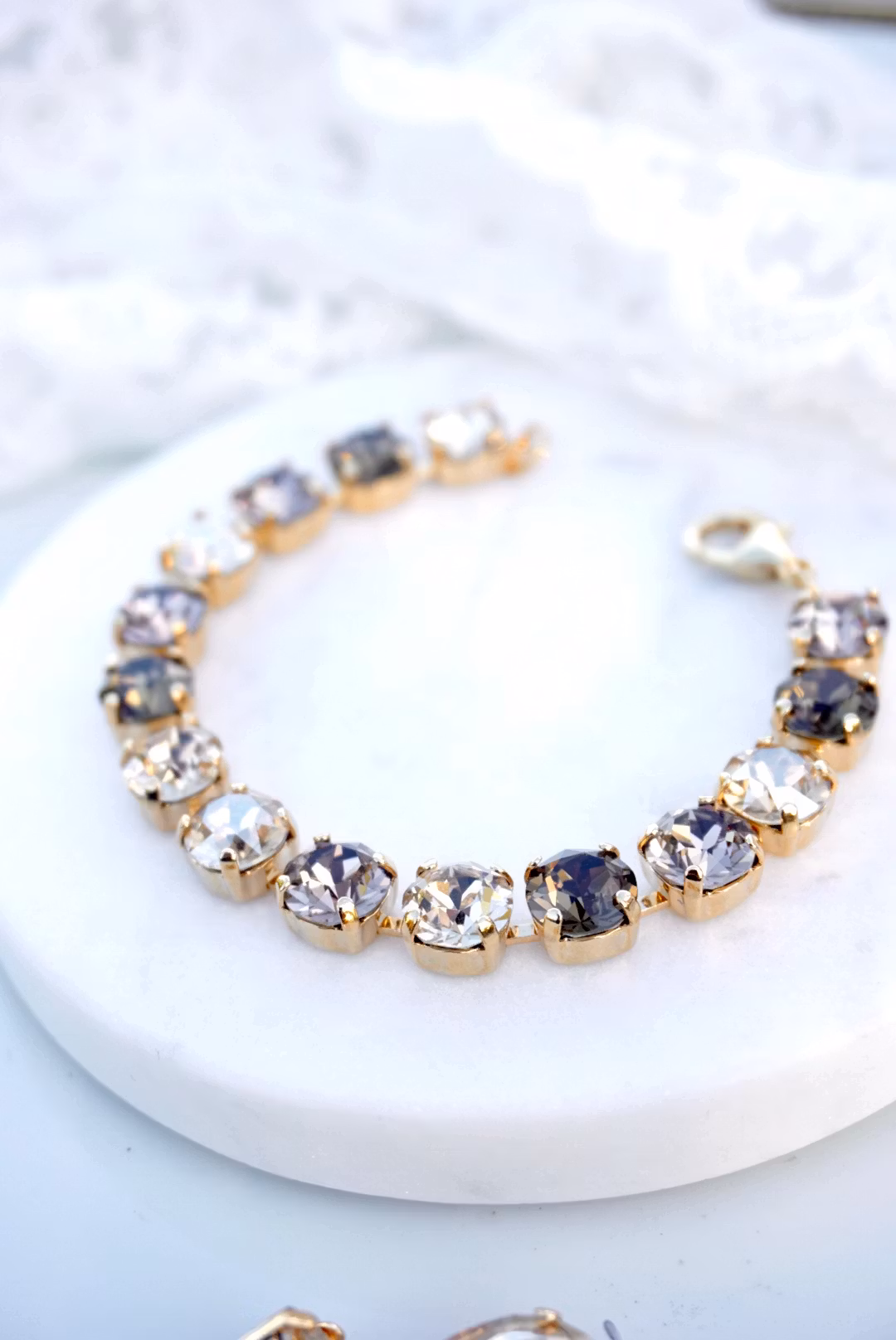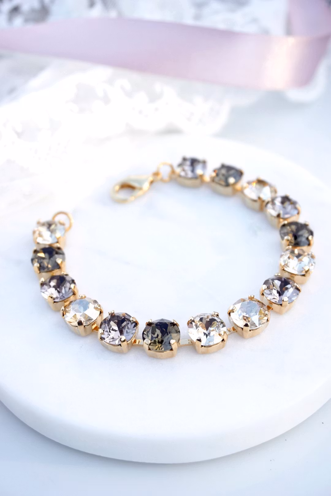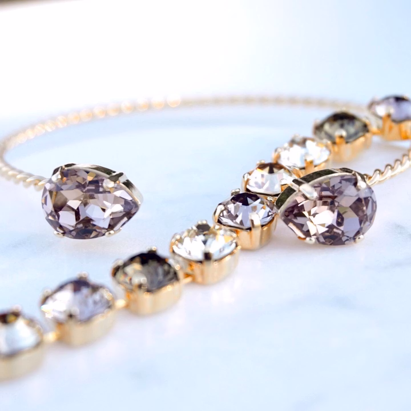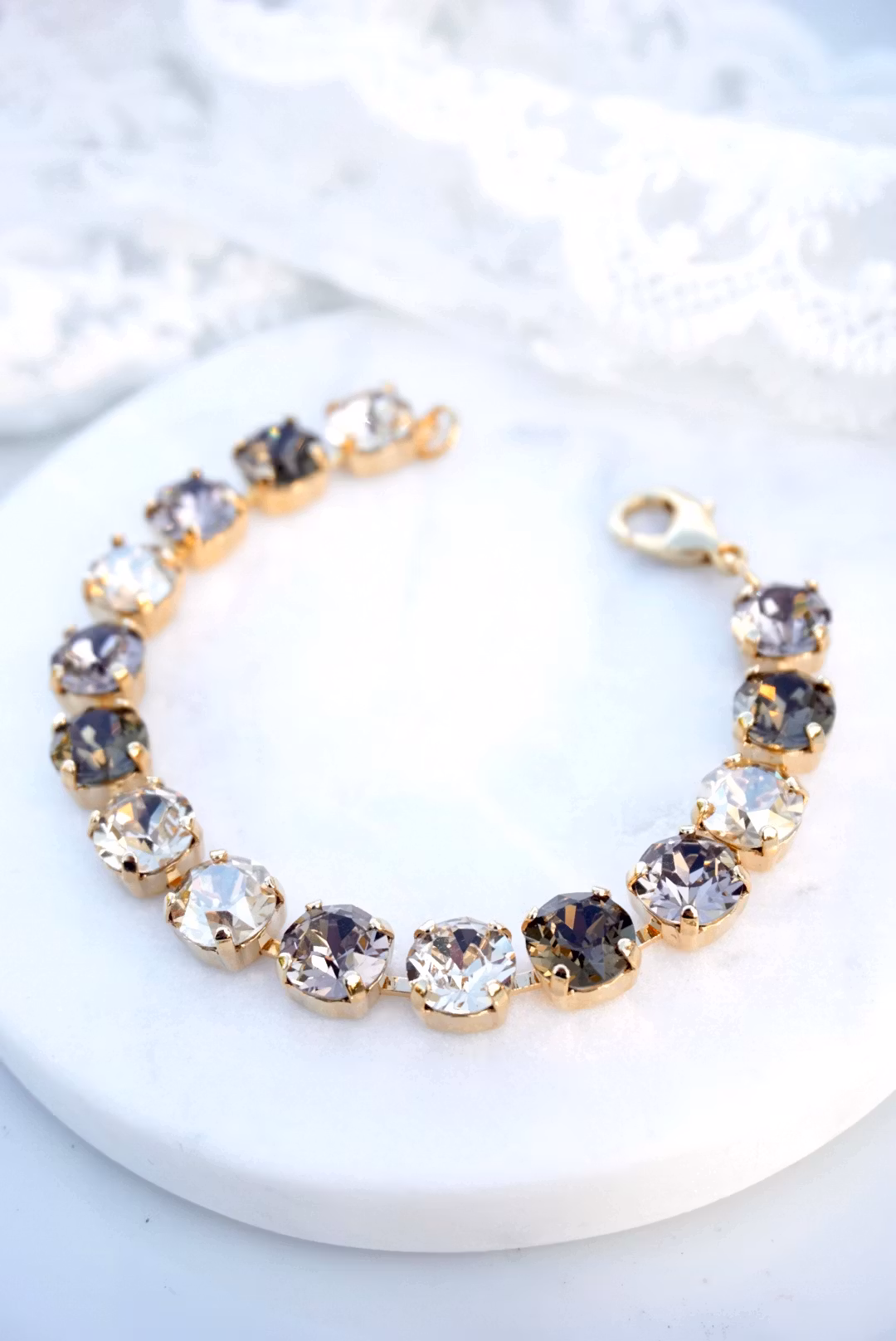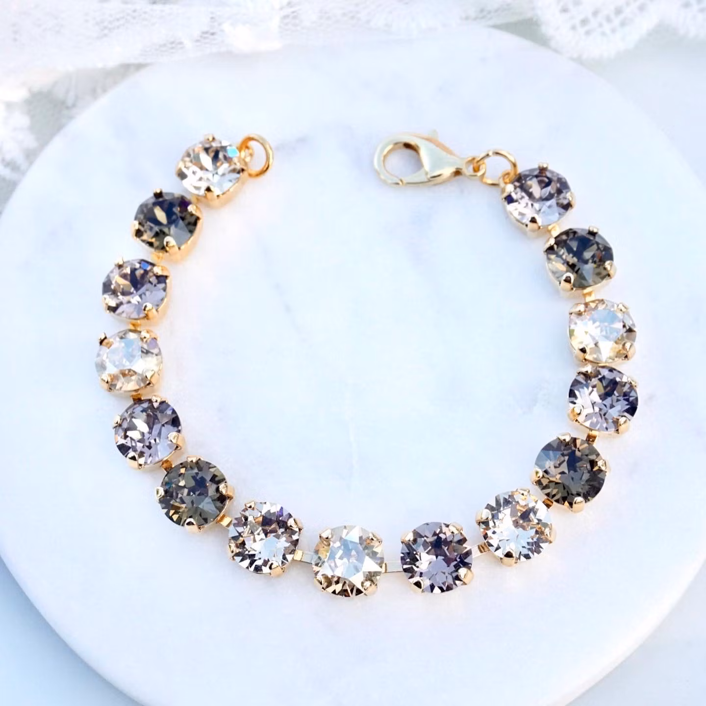 Cup-chainarmbånd i gull med krystaller i brun mix. Selve armbåndet måler 17,5 cm, pluss ekstralenke 4 cm hvis du ønsker. Krystallene er 8mm.