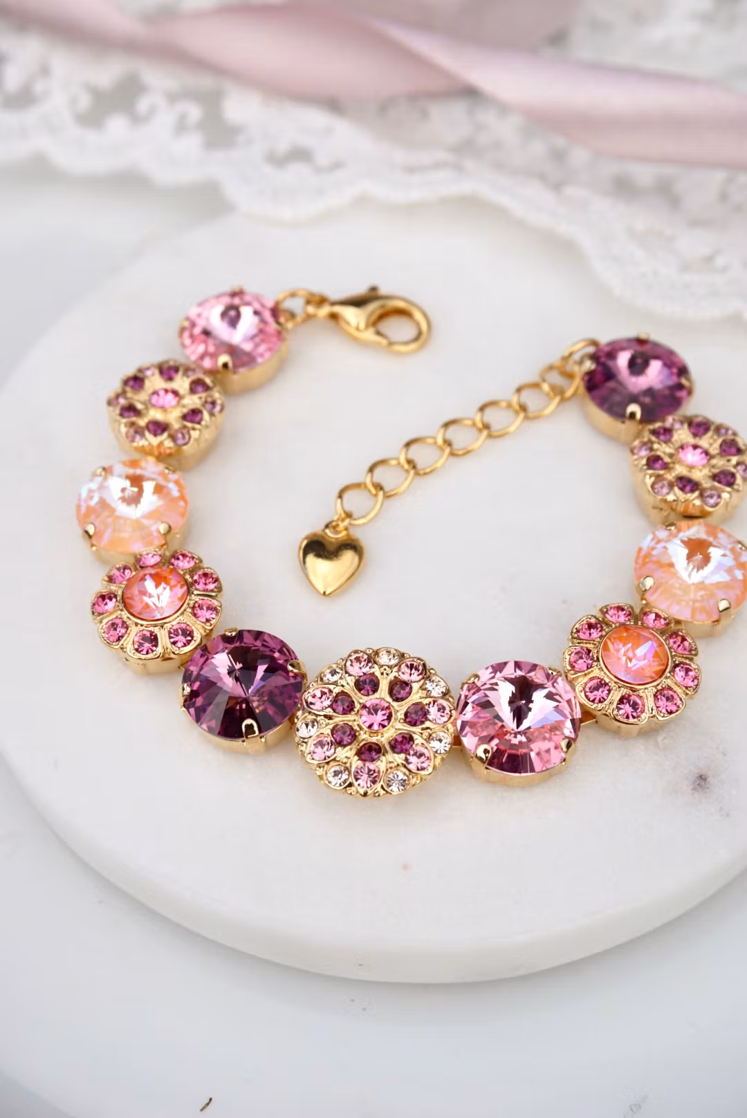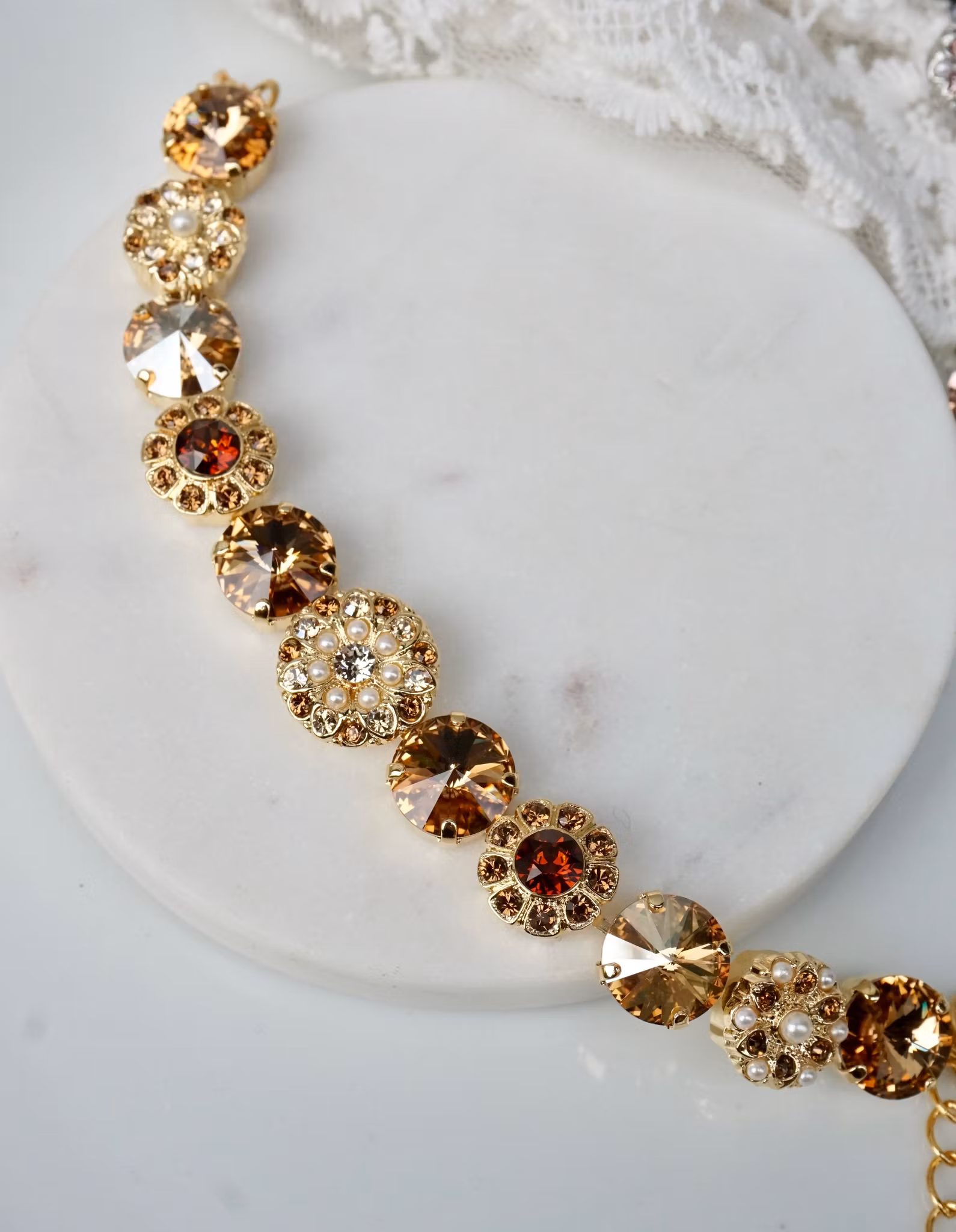 Spektakulært, detaljert og vakkert armbånd! Blanding i brunt/champagne og perler i gullinnfatning.