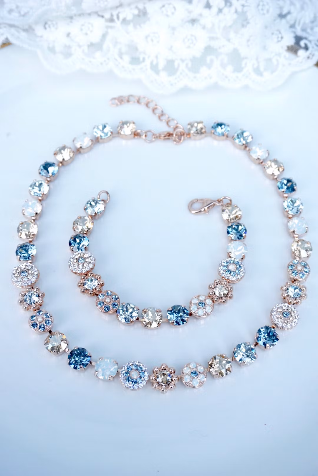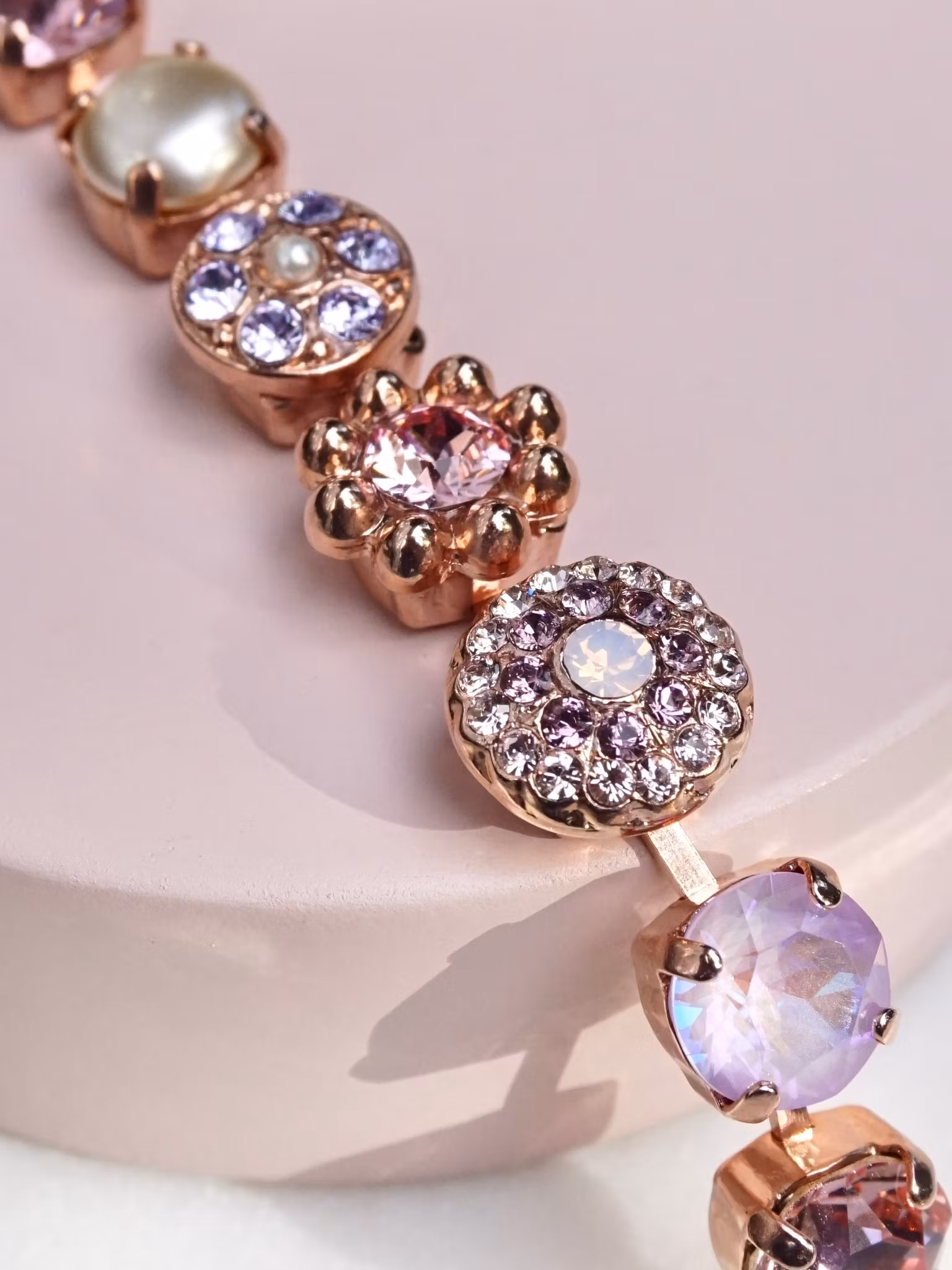 Nydelige detaljert armbånd, bestående av 8mm krystaller i duse rosa-/lillafarger og perler satt i rosegullfarget innfatning.