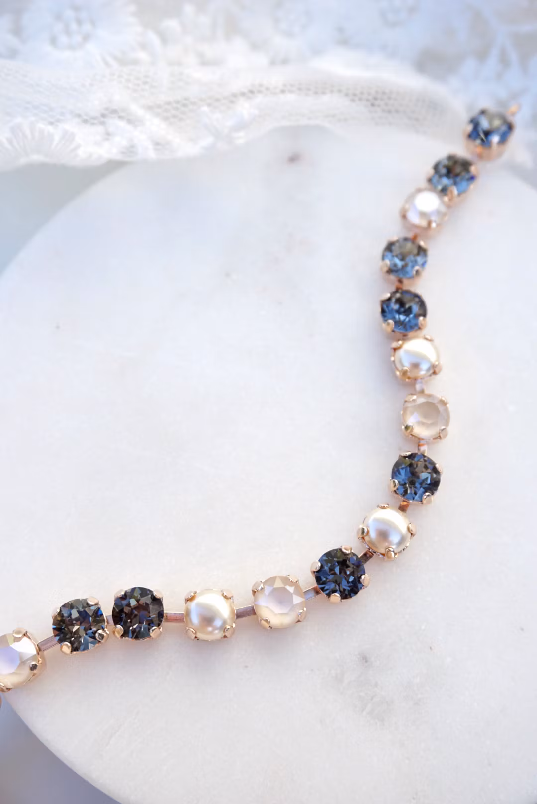 Et 6mm tykt glitrende krystallarmbånd i rosegull med krystaller i deilige gråtoner og nude, pluss vakre kremfargede perler! Dette måler ca 17cm , trenger du lenger setter jeg på ekstralenke.