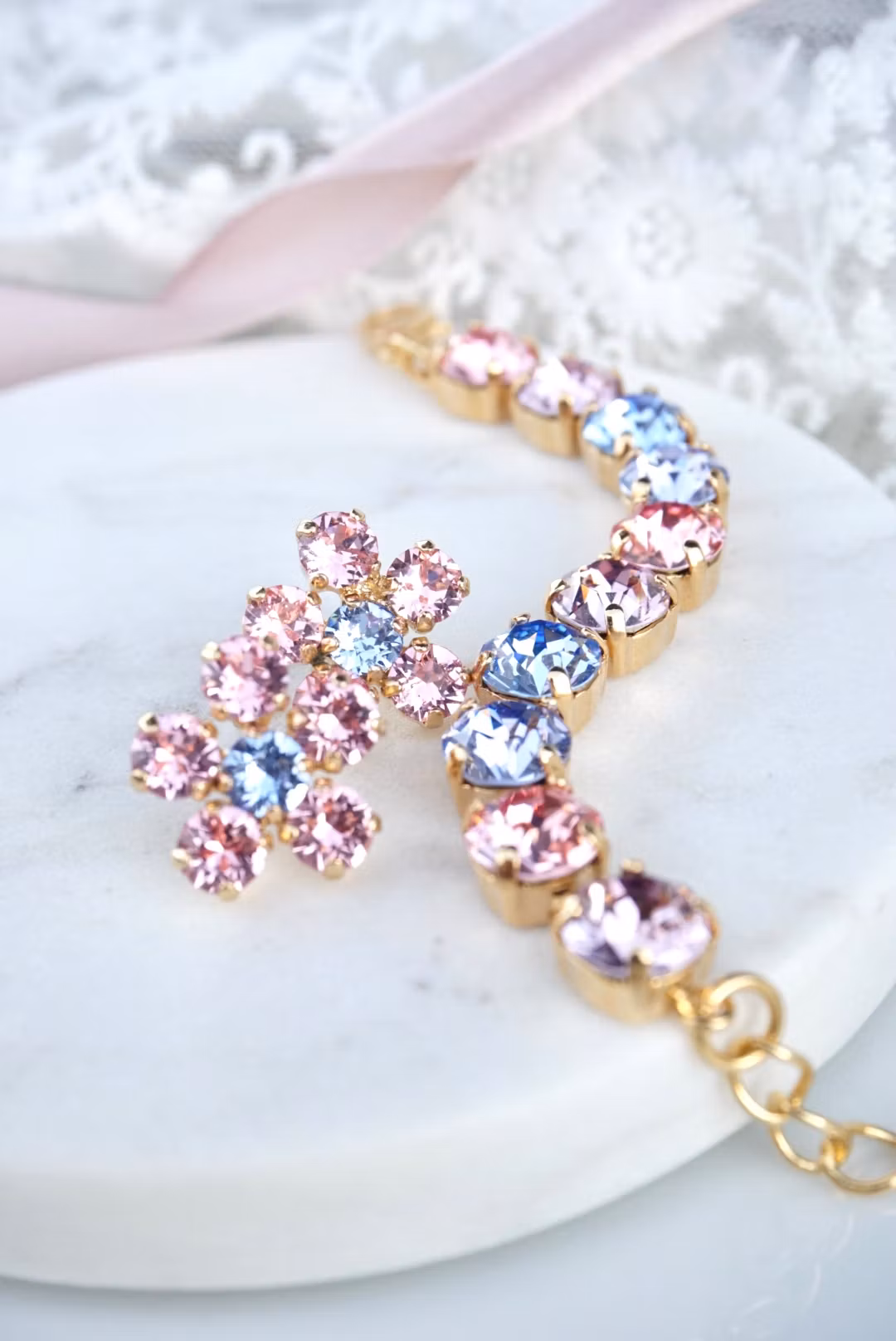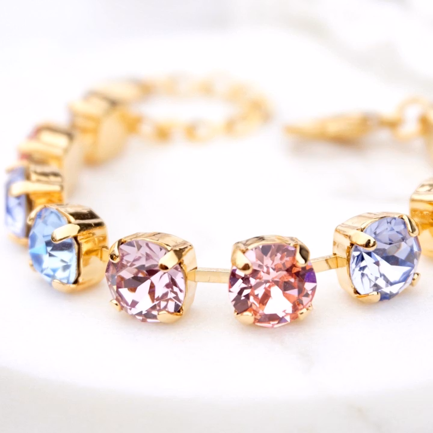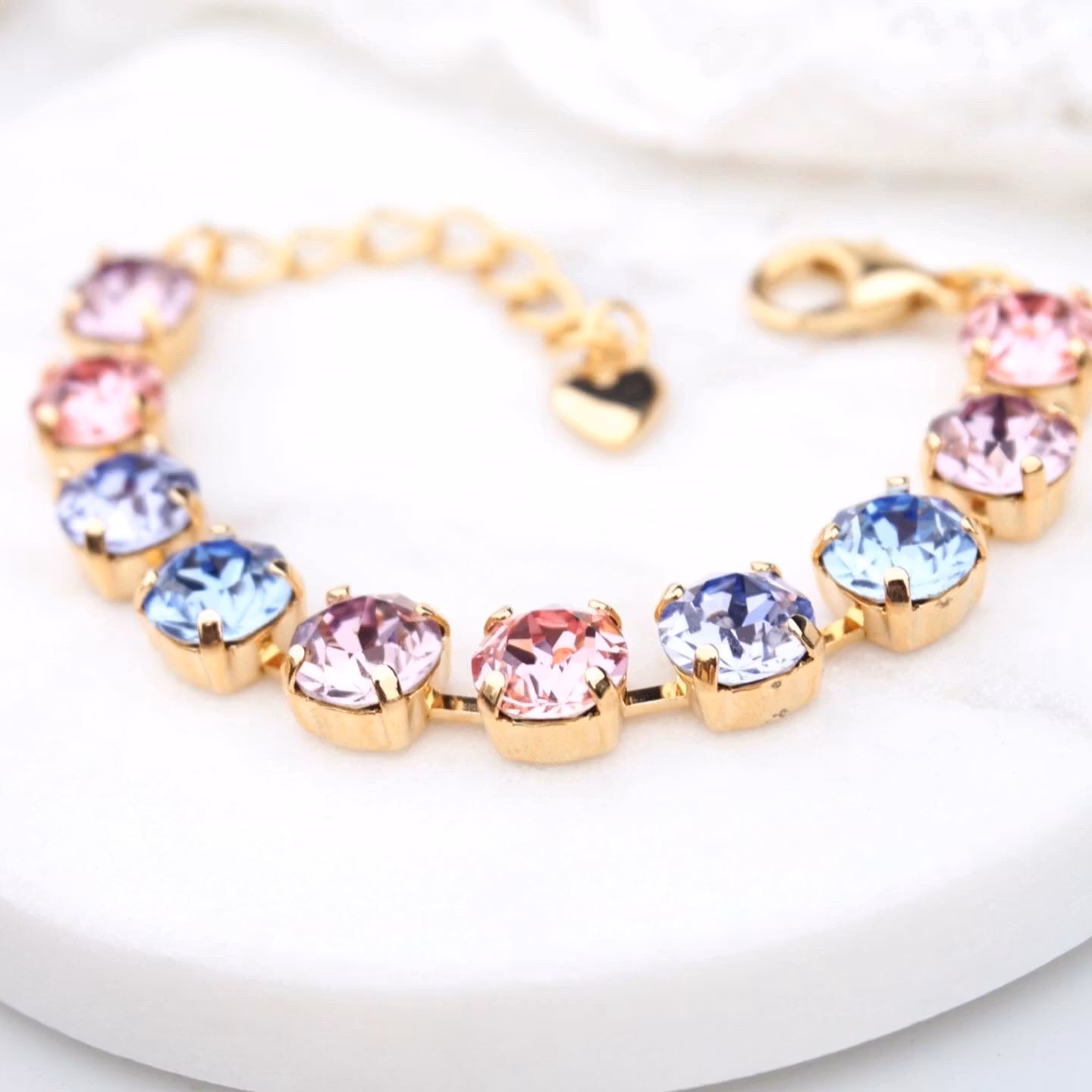 10 nydelige 8mm krystaller i vakre rosa/lillatoner i dette ekstra korte armbåndet. Det passer barn fra 5-årsalderen og oppover (pga ekstralenken).