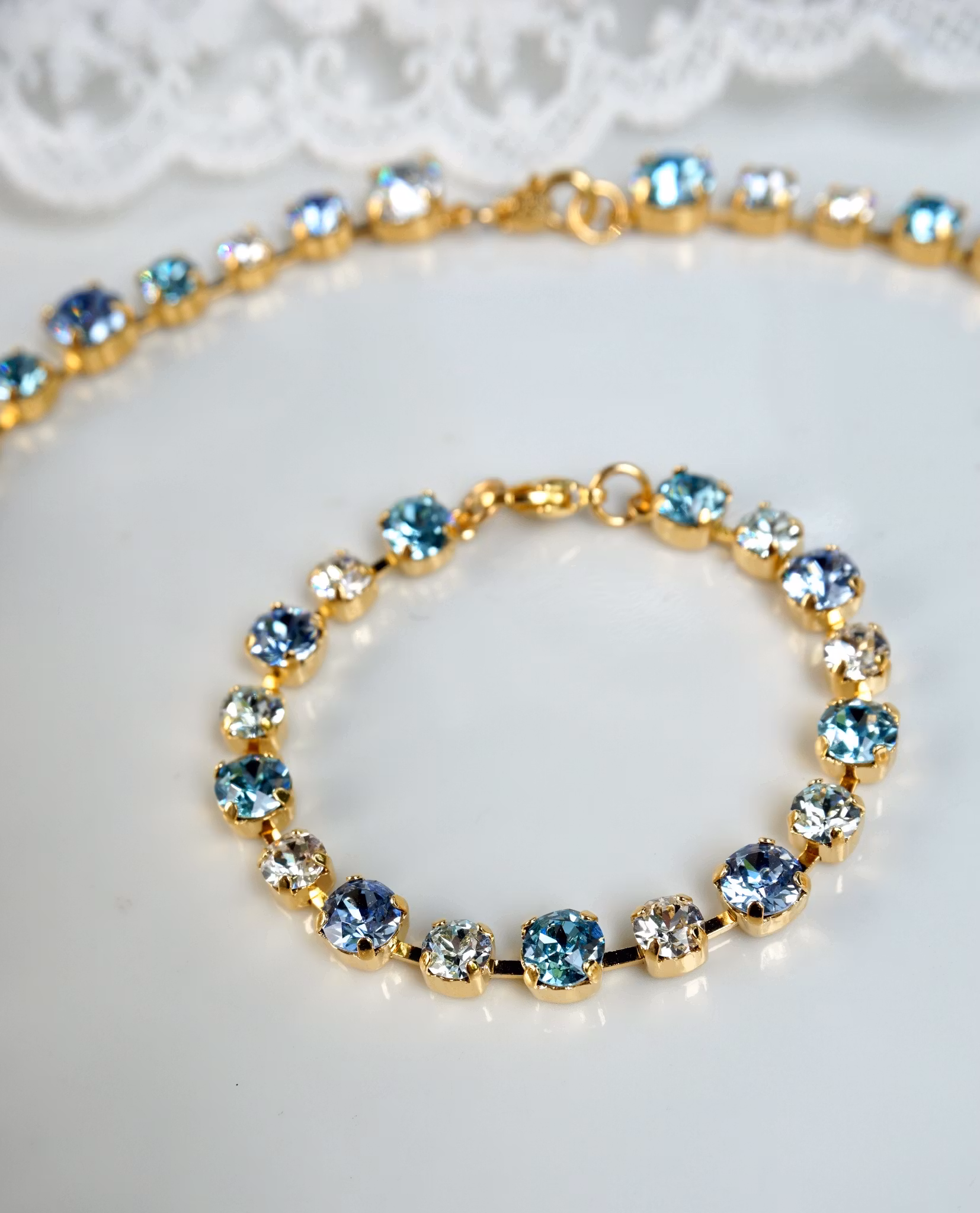 I dette armbåndet er det 5mm og 6mm krystaller i fine lyse blåfarger! Gullinnfatning.