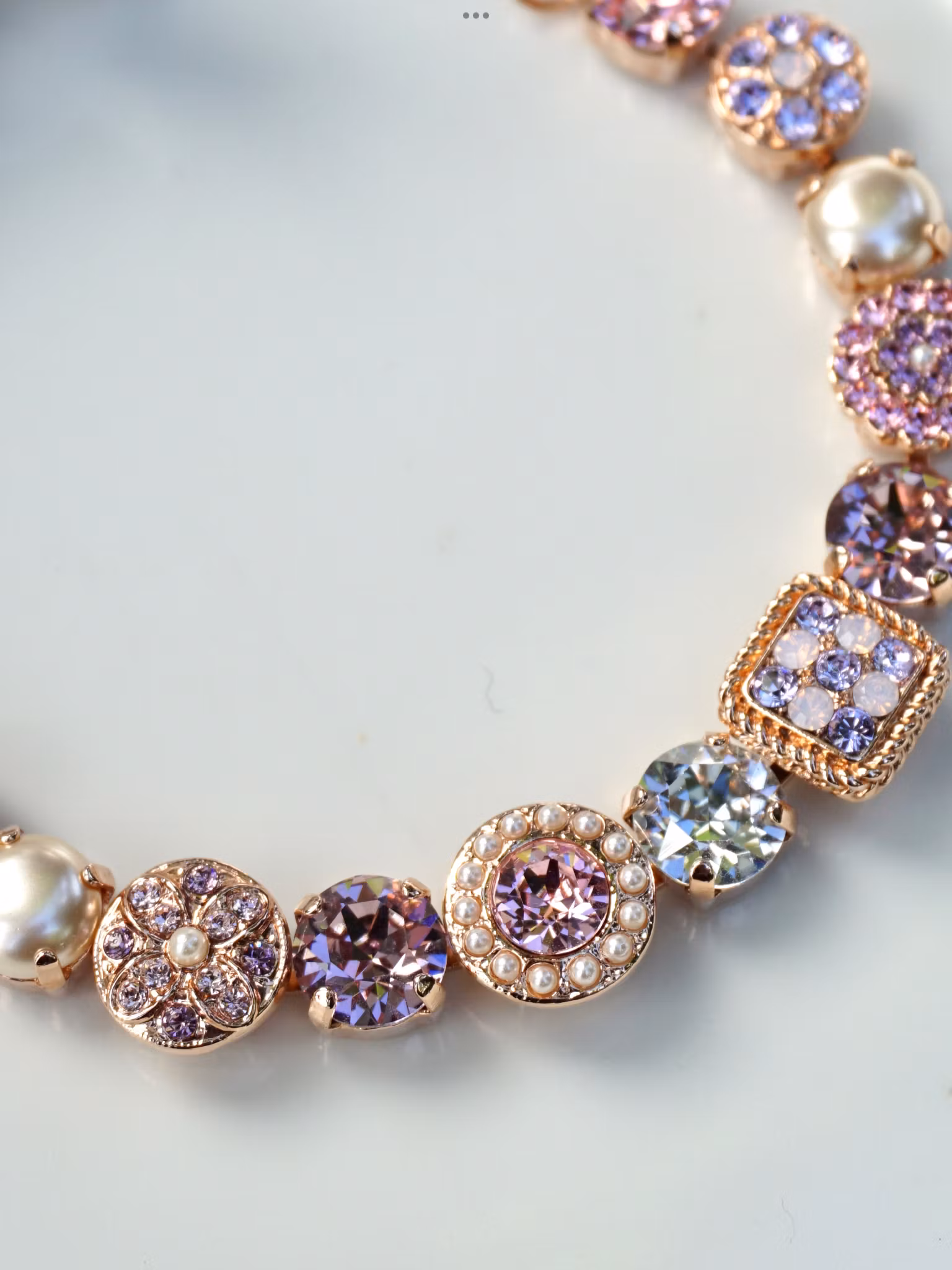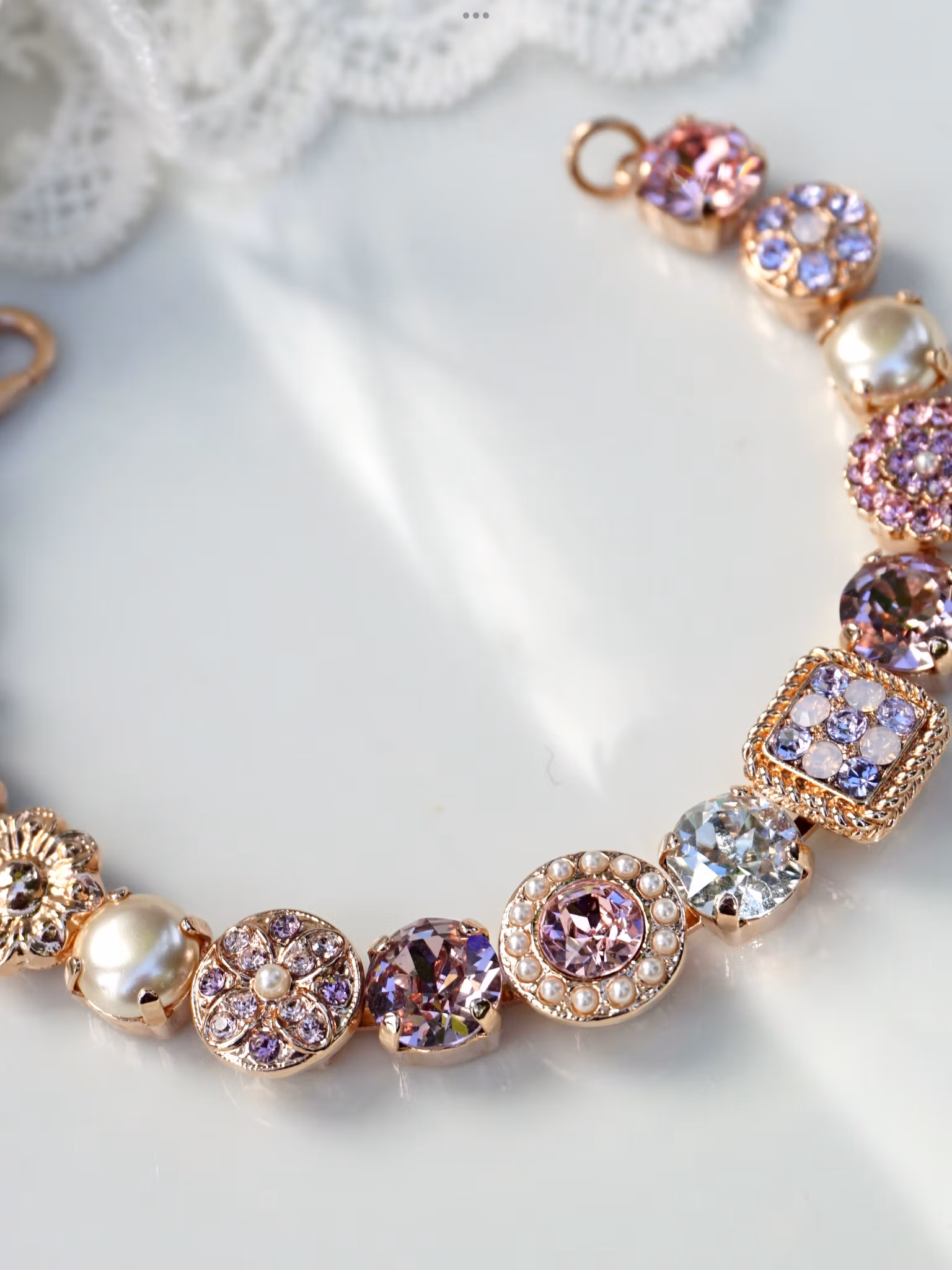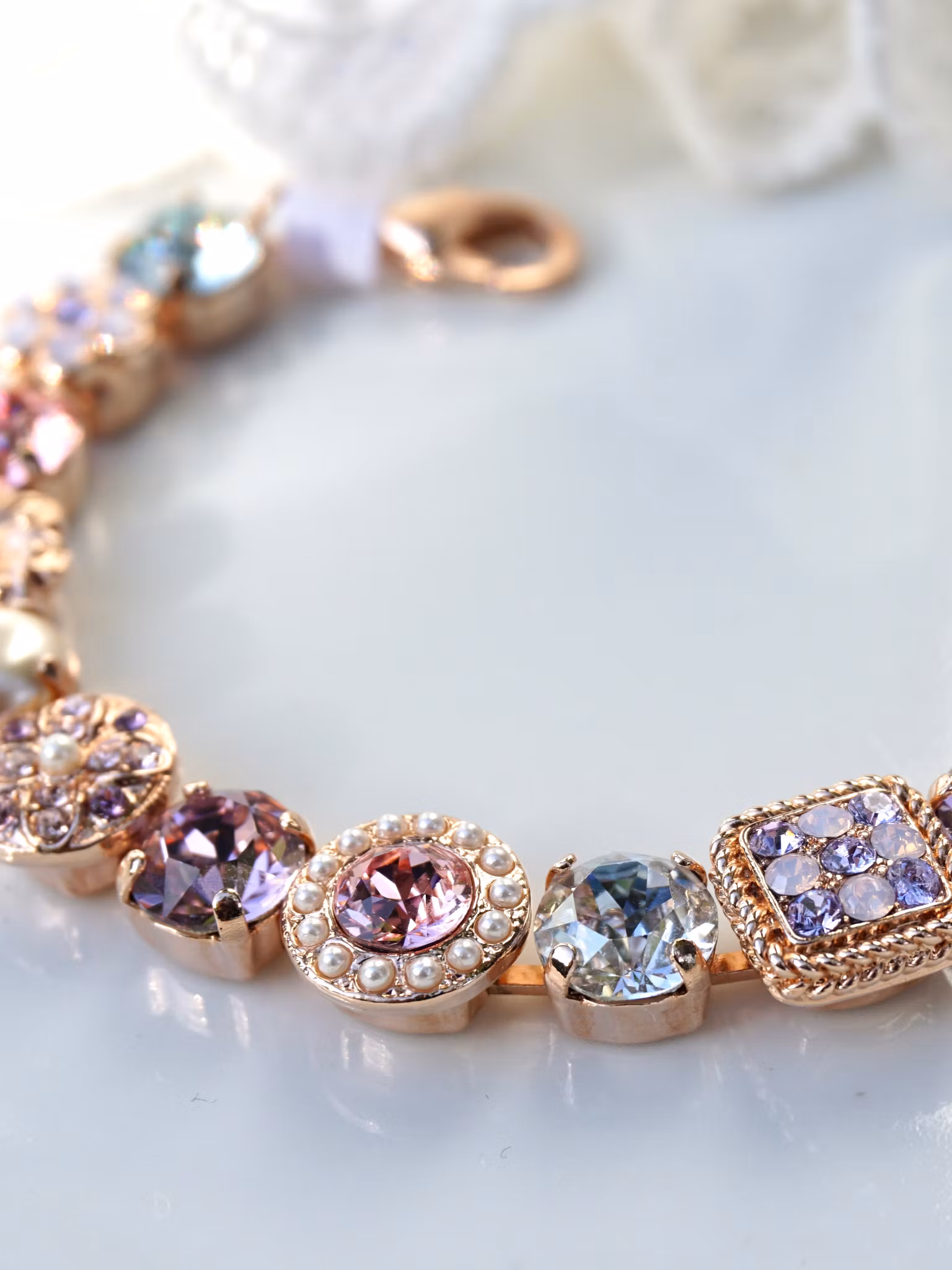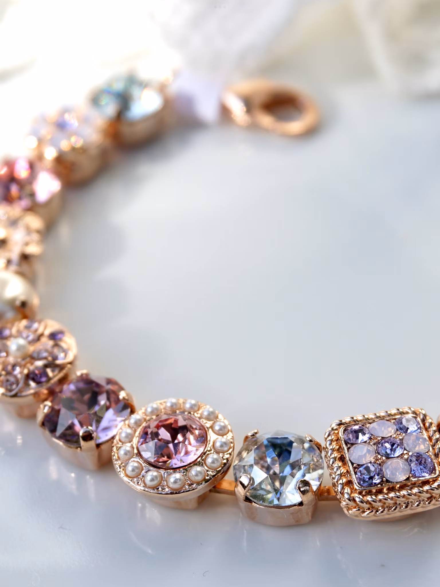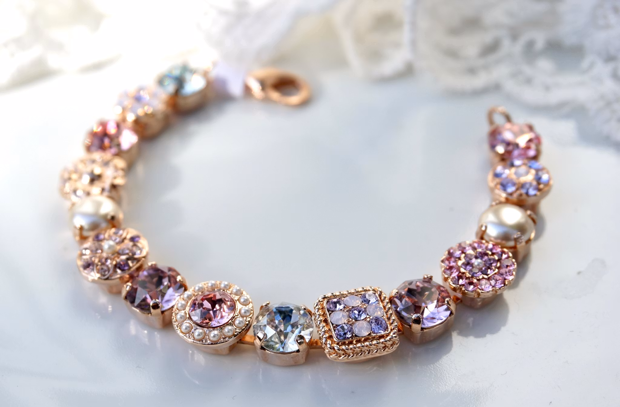 Fantastisk armbånd i rosegullinnfatning med krystaller i forskjellige rosa- og lillanyanser. De store krystallene er 8mm, og innimellom er bittesmå krystaller og perler i mange farger.