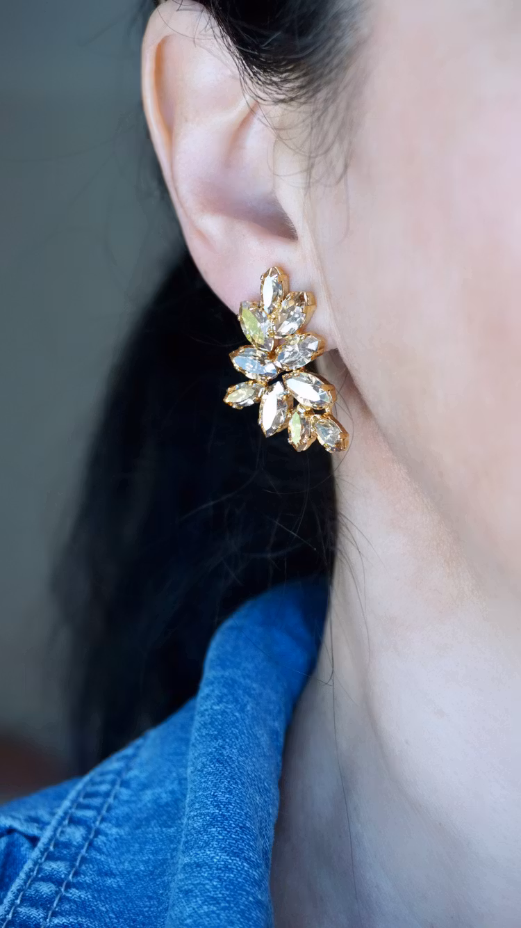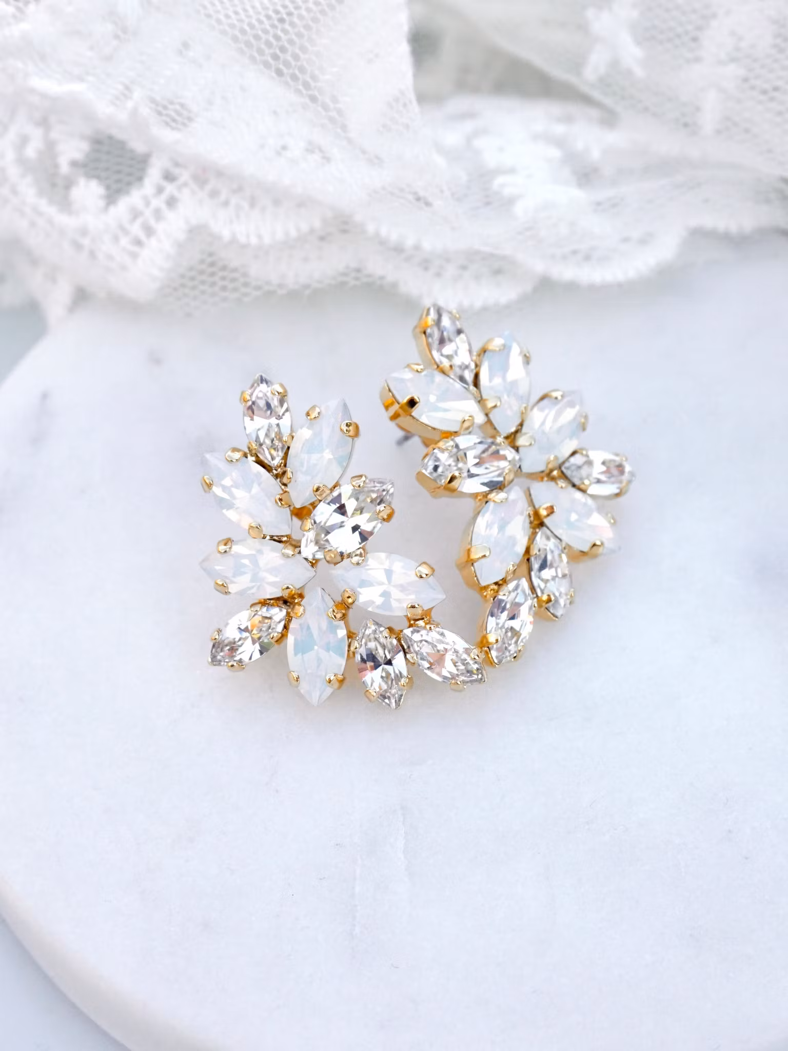 Nydelig øredobb! Små navette krystaller i en fargeblanding av White Opal og Crystal, satt i gullfarget innfatning.