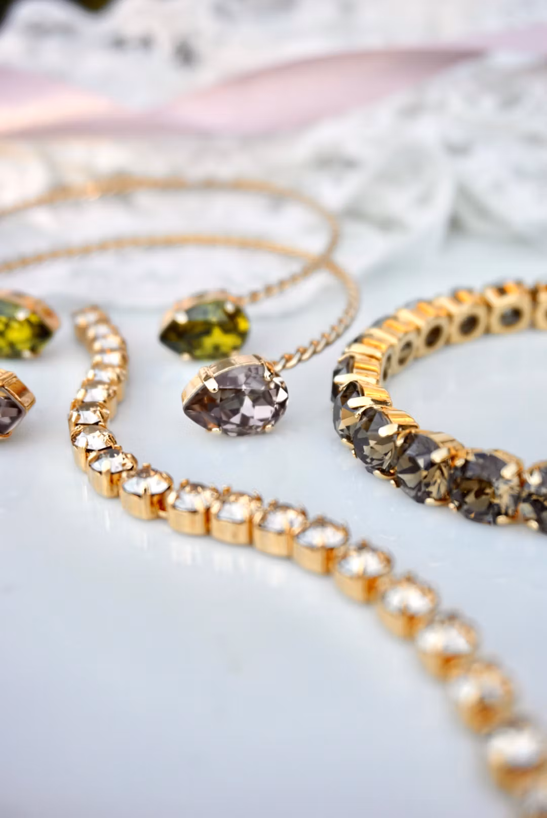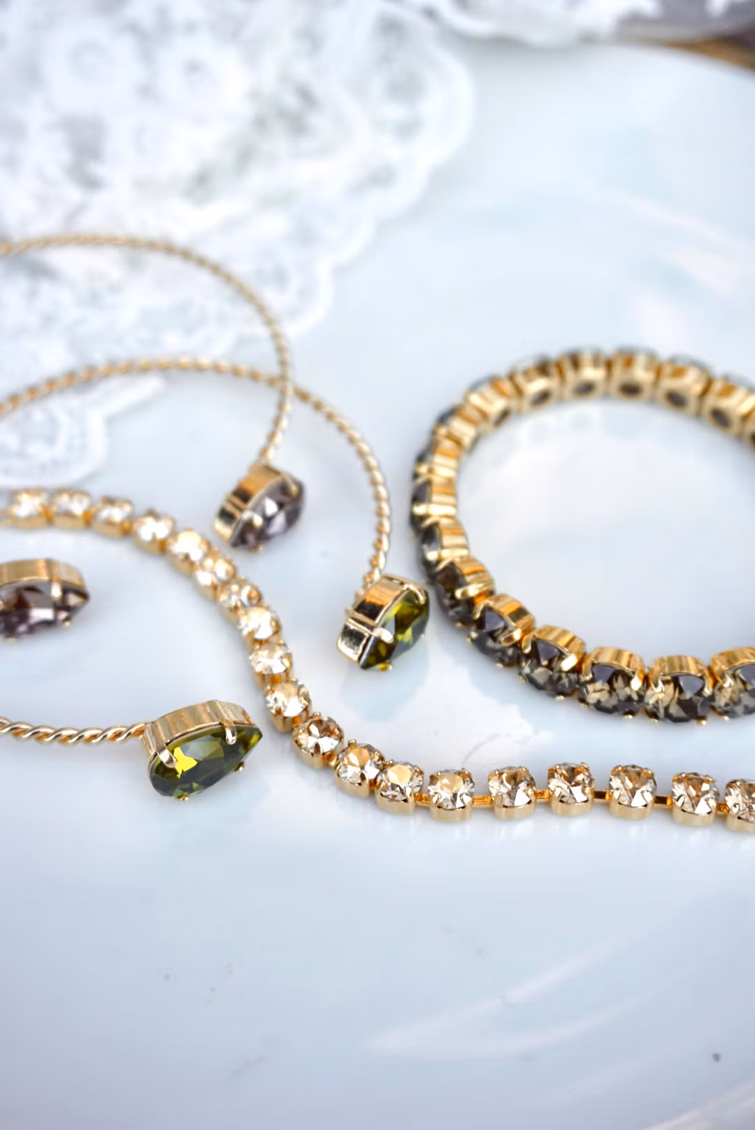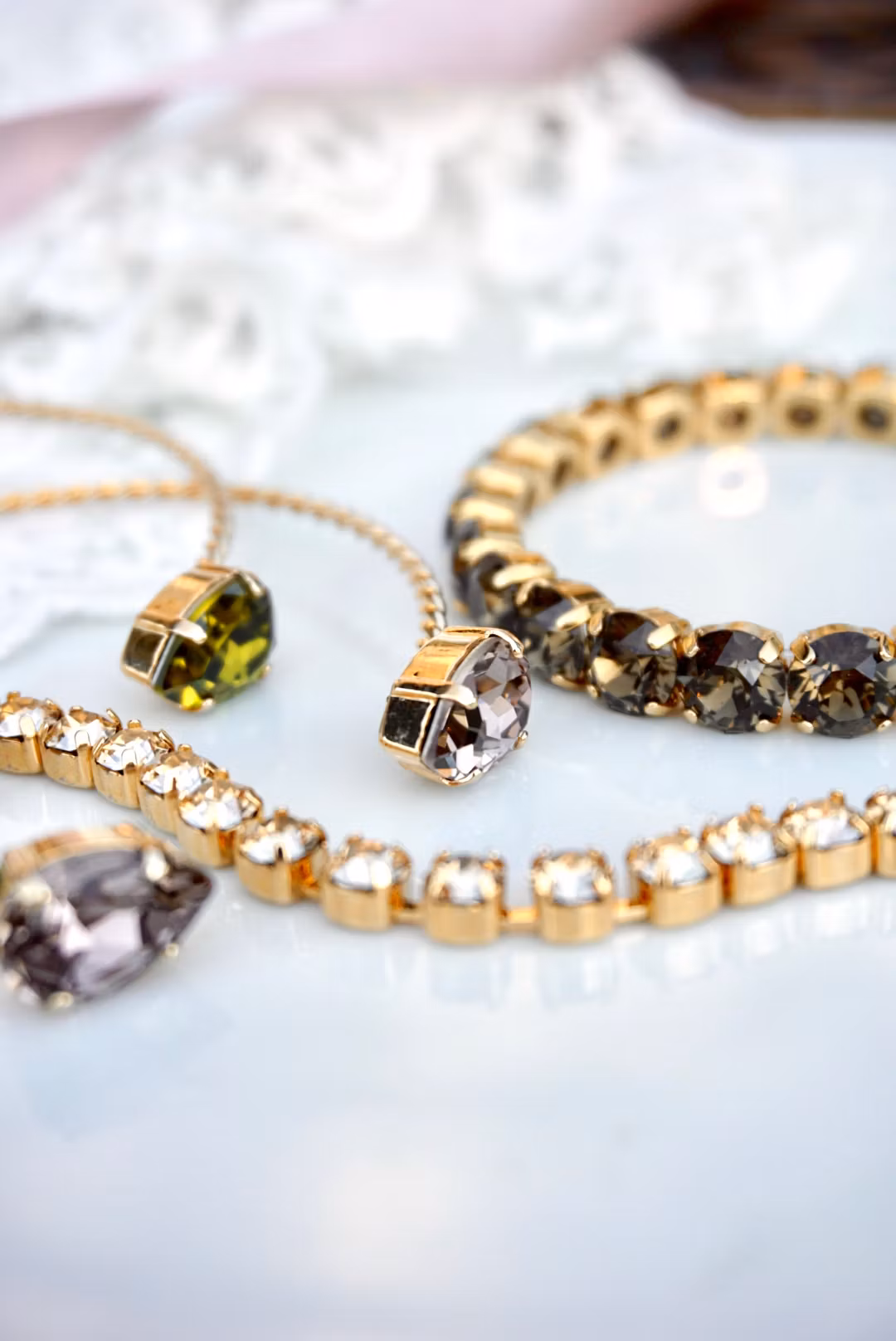 Skinnende og kult håndlaget stretcharmbånd med krystaller av beste klasse! Fargene er i Smoky Quartz som er nydelig mørk brun, og metallet gullfarget. Krystallene er 8mm.