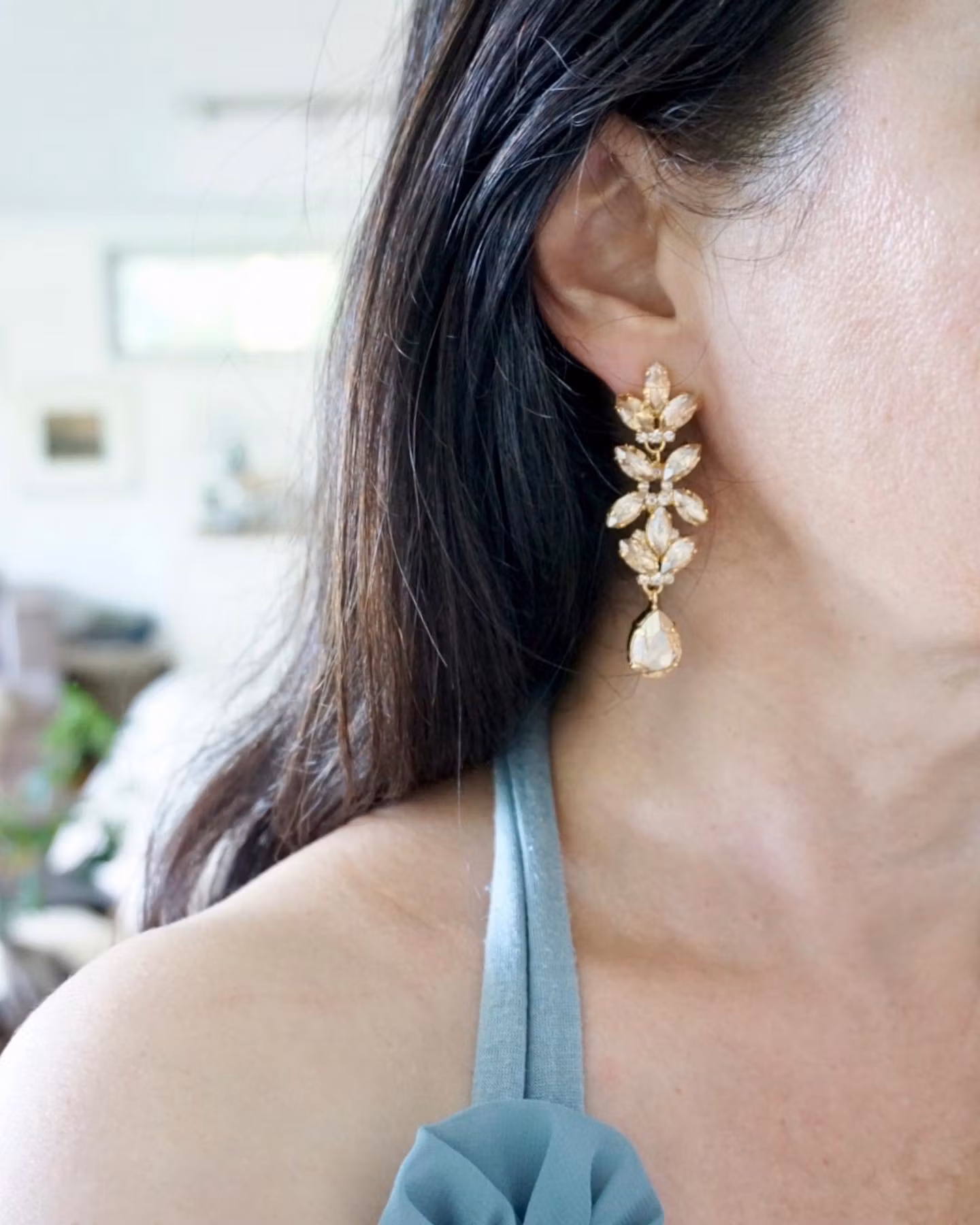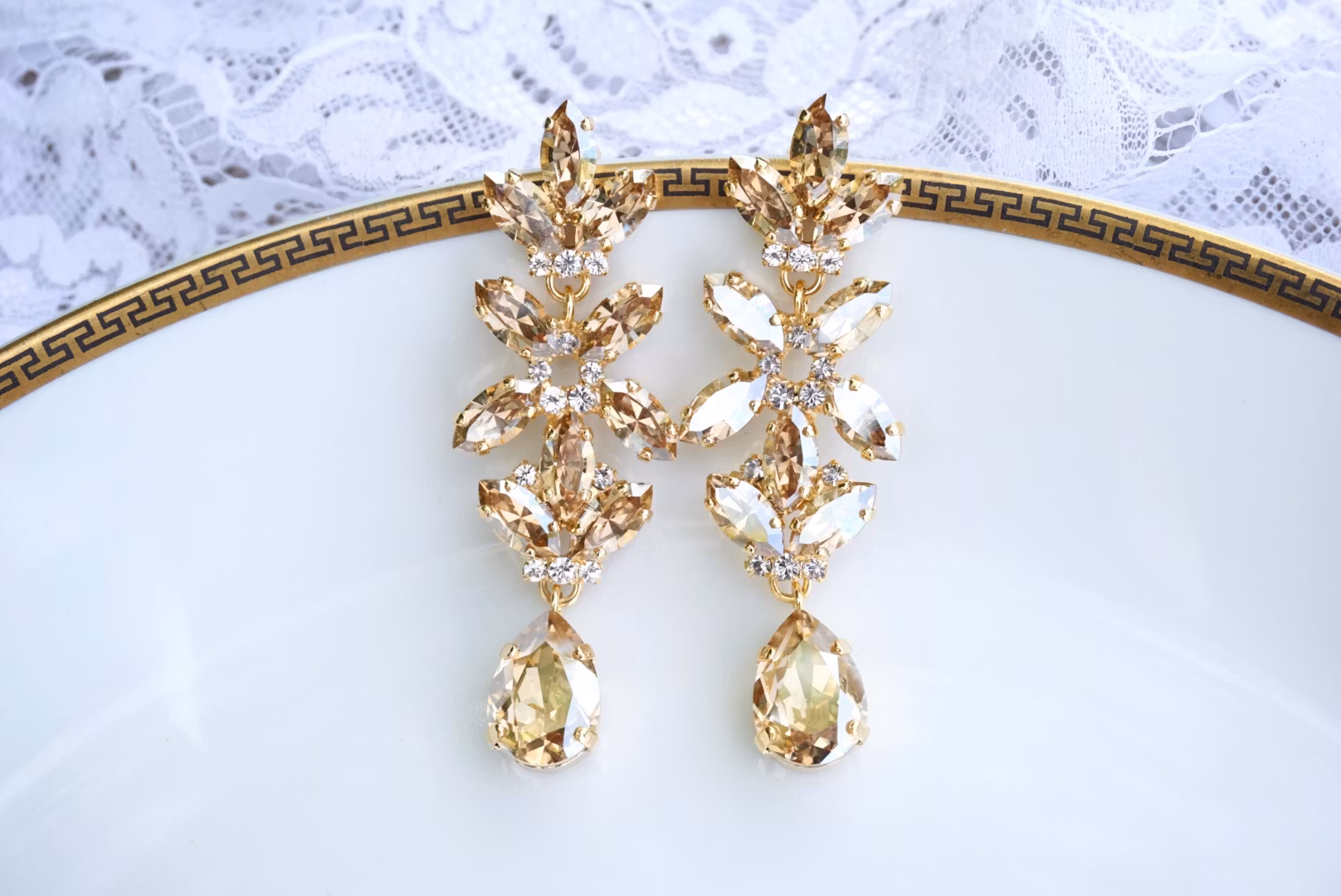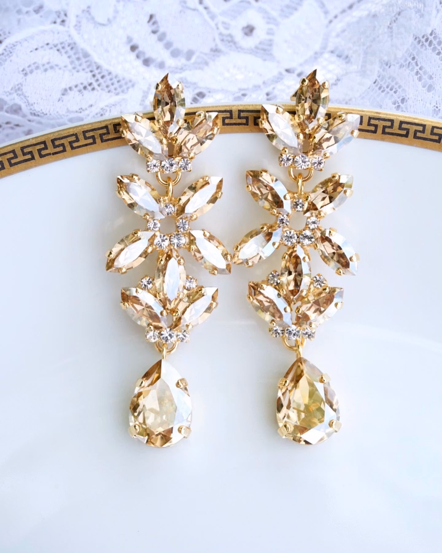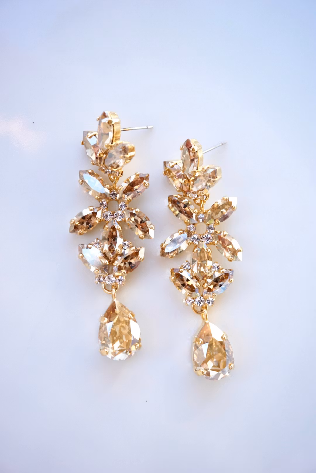 Fantastiske øredobber med mange nydelige detaljer. Her i gull med krystallfargen Golden Shadow. Bittesmå blanke krystaller innimellom. De er slanke og føles ikke tunge. Har kun denne ene i disse fargene. One of a kind!