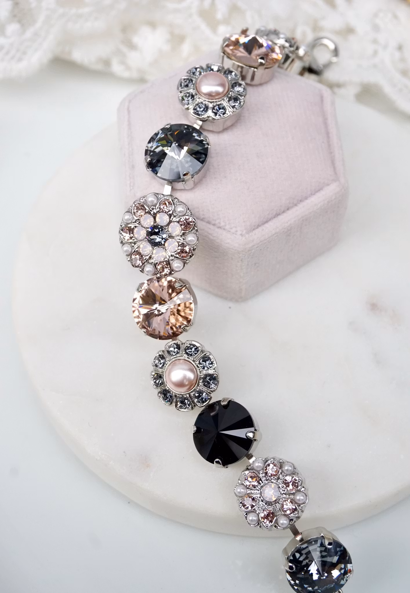 Spektakulært, detaljert og vakkert armbånd! Denne har krystaller i sort/grått og Vintage Rose, mixet med forskjellige bittesmå krystaller og perler i rhodiuminnfatning.