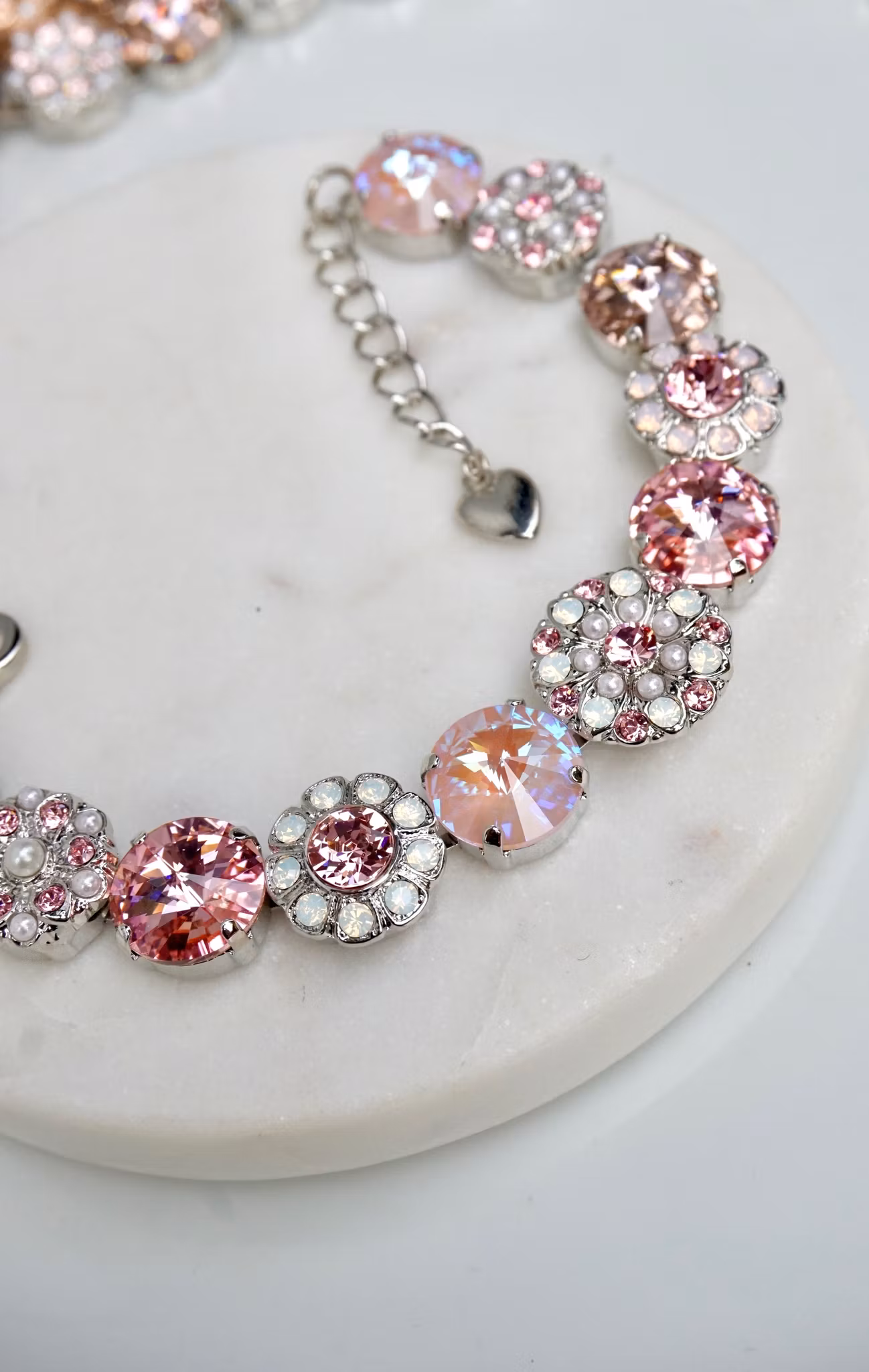 Spektakulært, detaljert og vakkert armbånd! Denne har krystaller i Light Rose og White Opal, mixet med forskjellige bittesmå krystaller og perler i rhodiuminnfatning.