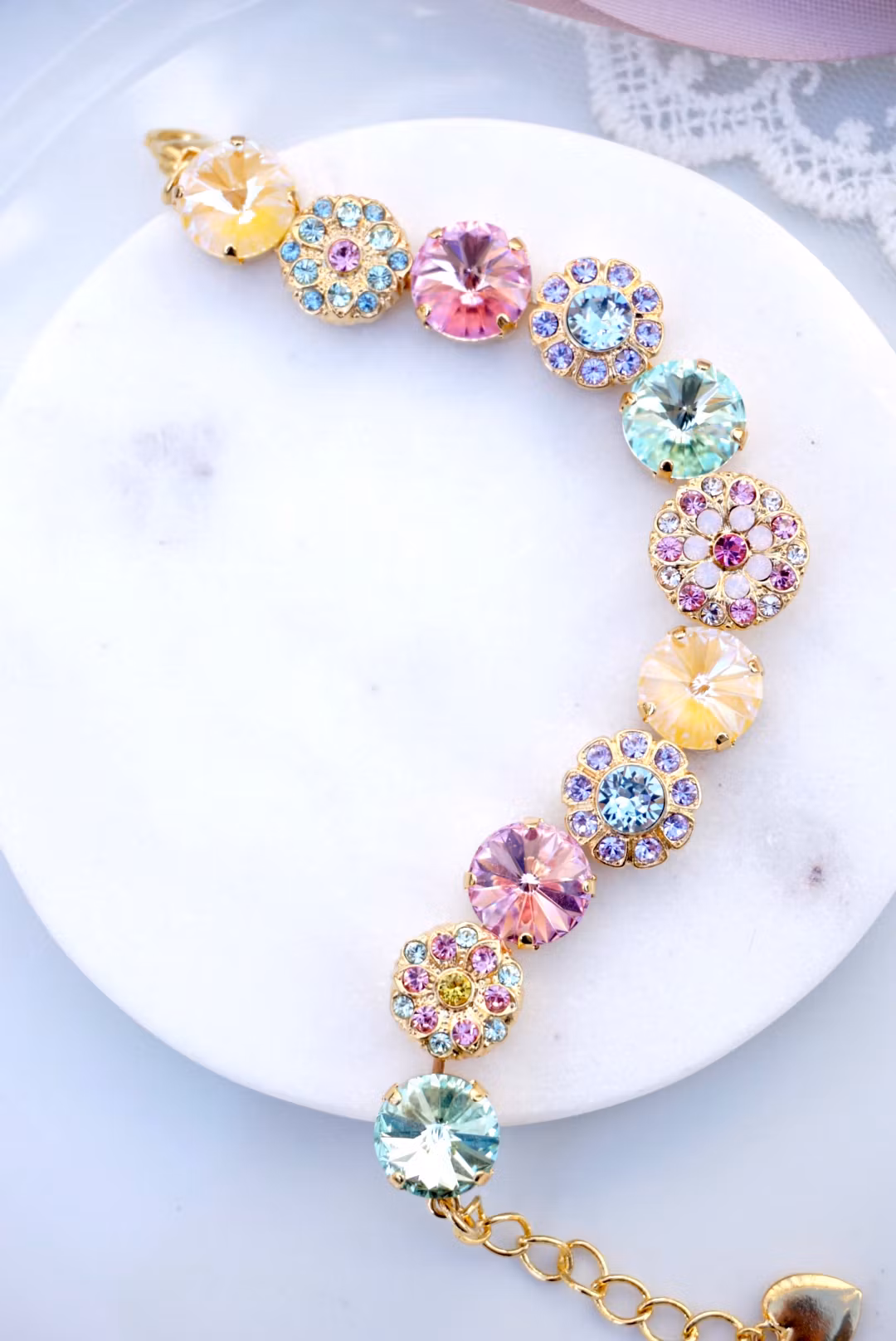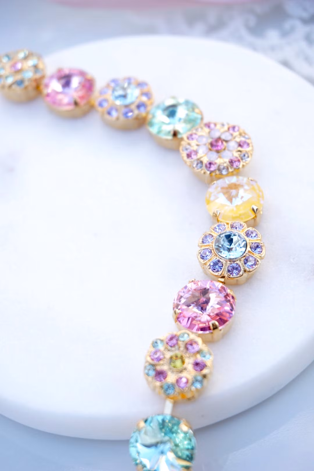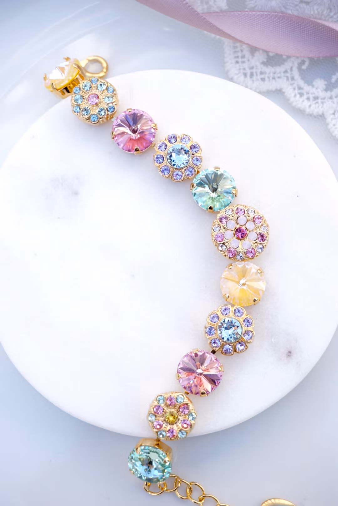 Spektakulært, detaljert og vakkert armbånd! Blanding av forskjellige nydelige pastellfarger, satt i gullinnfatning eller evt rosegullinnfatning. One of a kind!