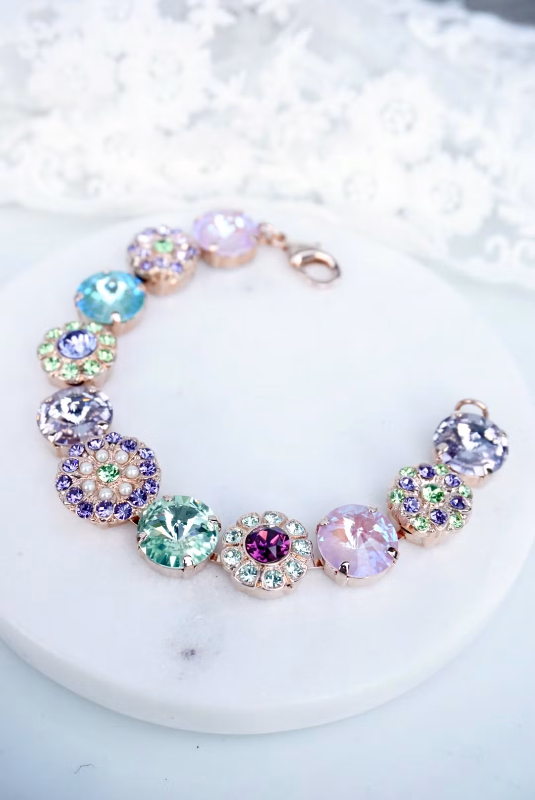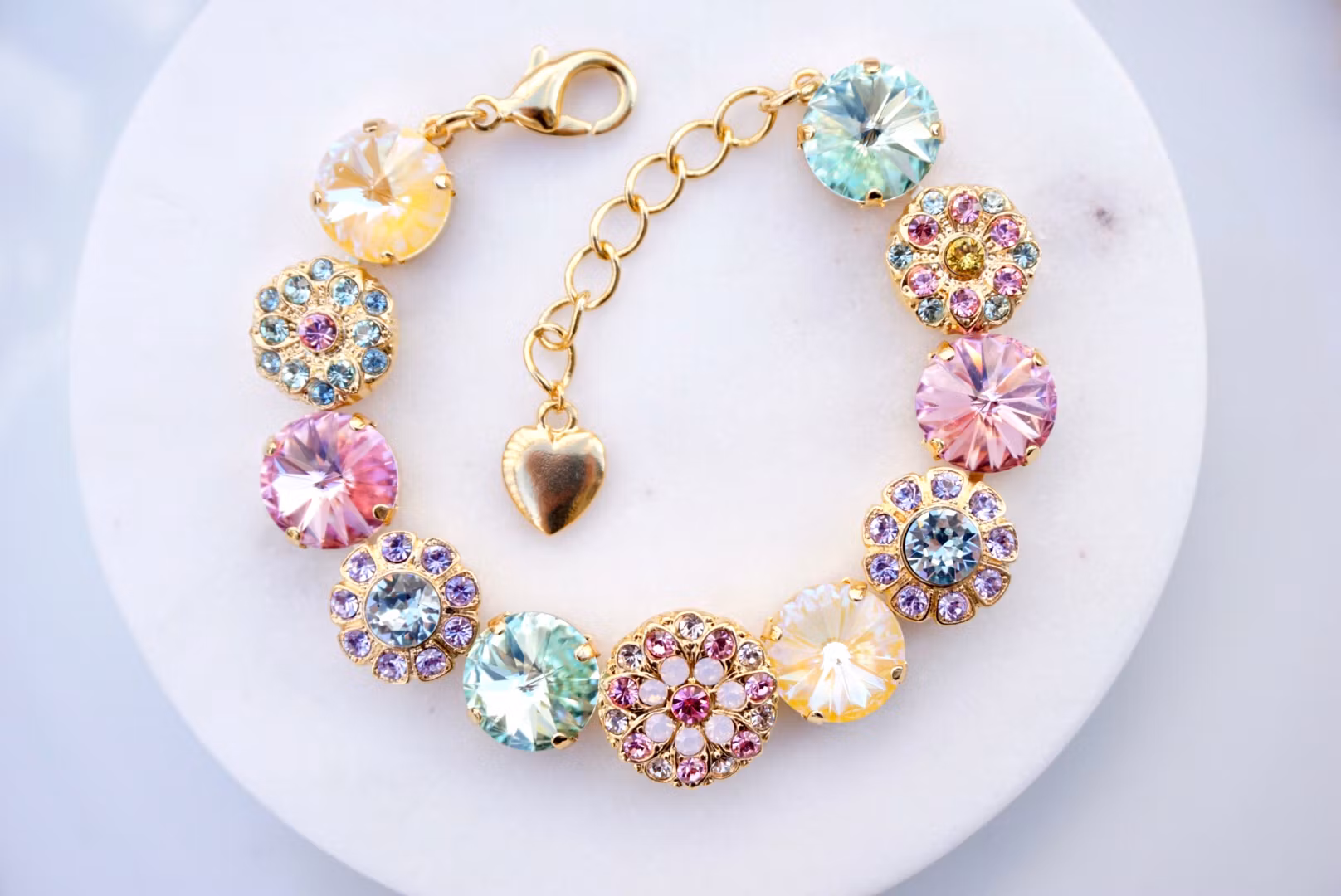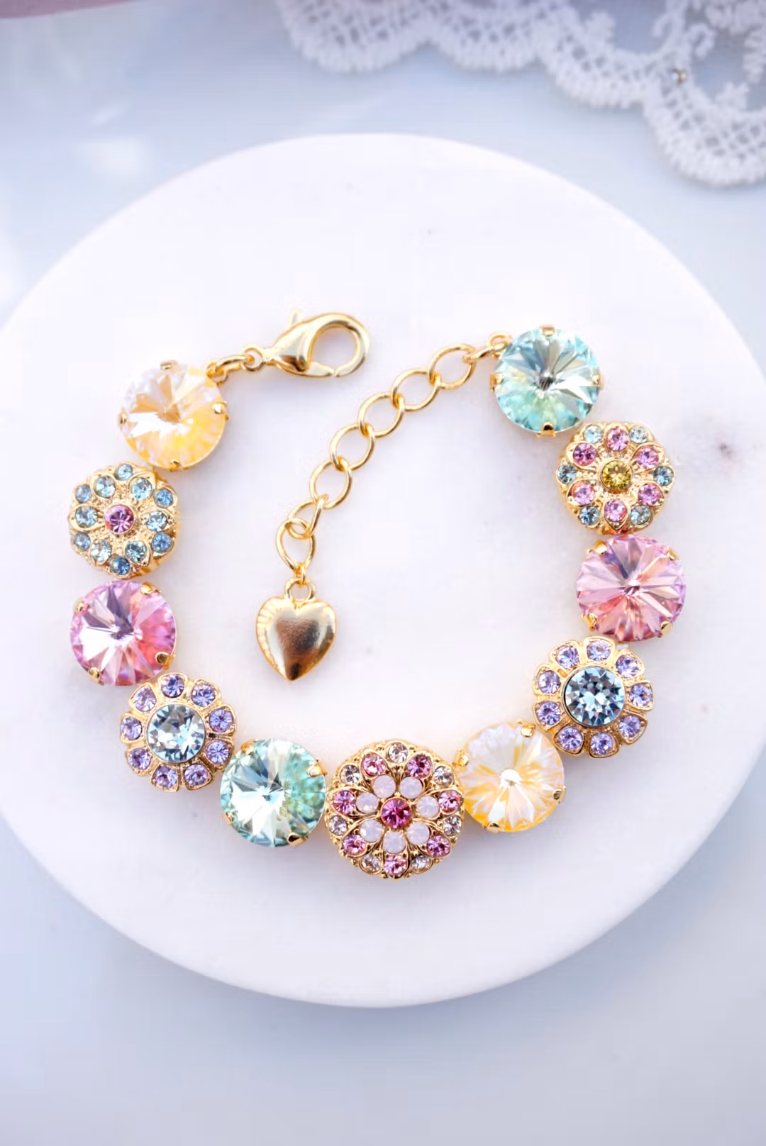 Spektakulært, detaljert og vakkert armbånd! Blanding av forskjellige nydelige pastellfarger, satt i gullinnfatning eller evt rosegullinnfatning. One of a kind!