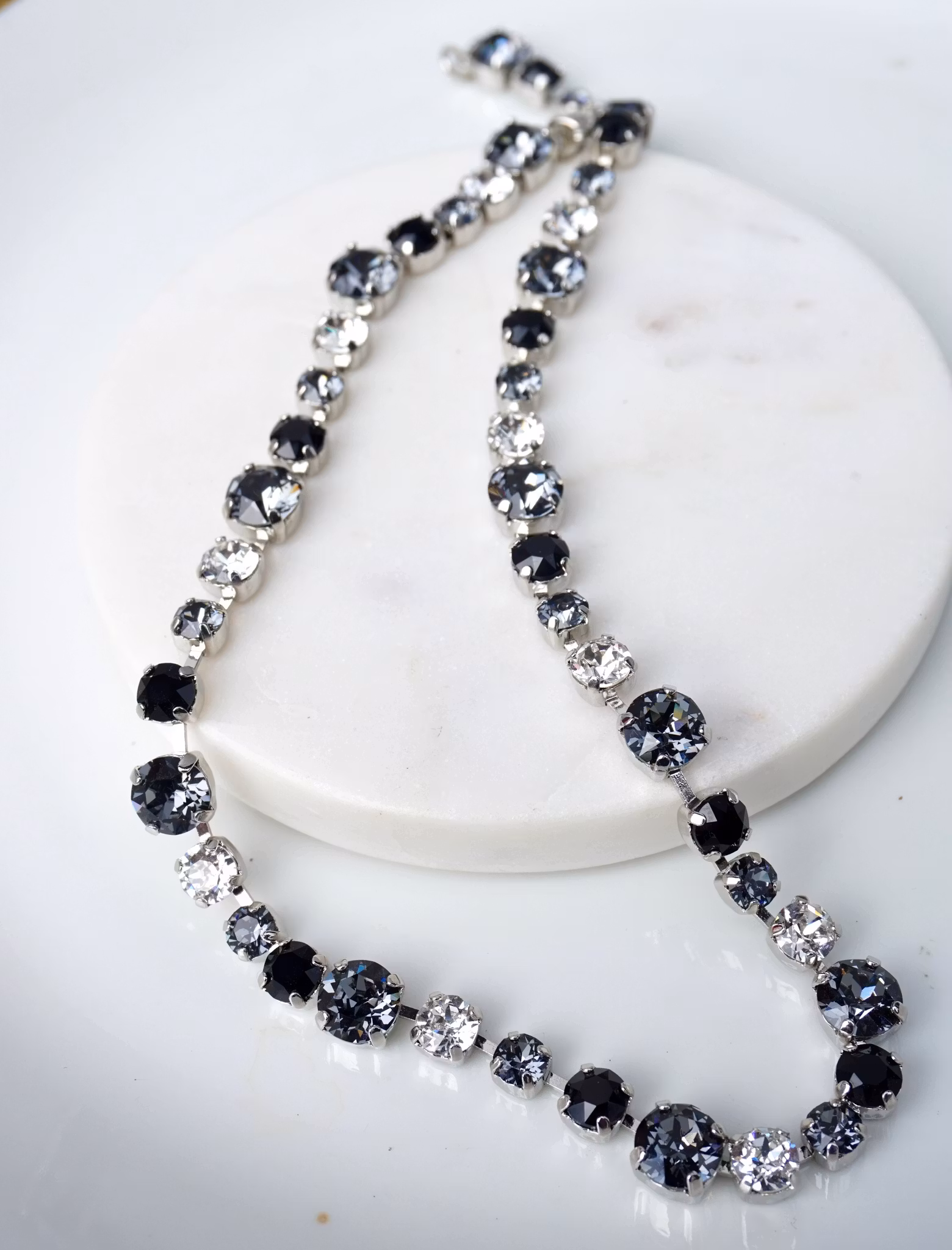 Kjedet har blanke krystaller i 8/6/5mm og er ca 42 cm langt.