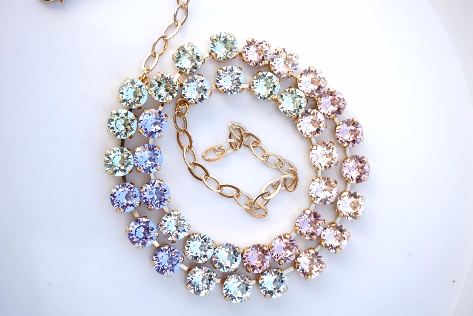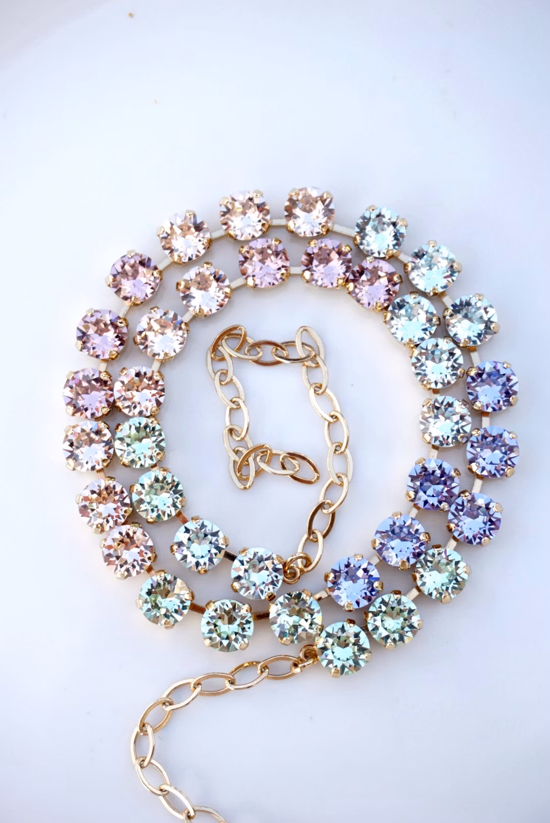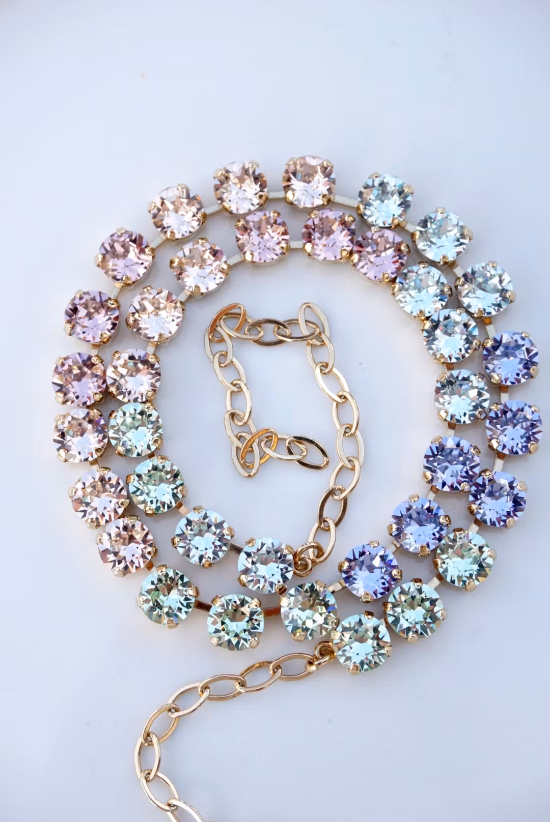 Lyse fine pasteller i dette kjedet! Du velger hvordan det skal henge, siden det kan være fra 45 til 56 cm langt pga lang ekstralenke.