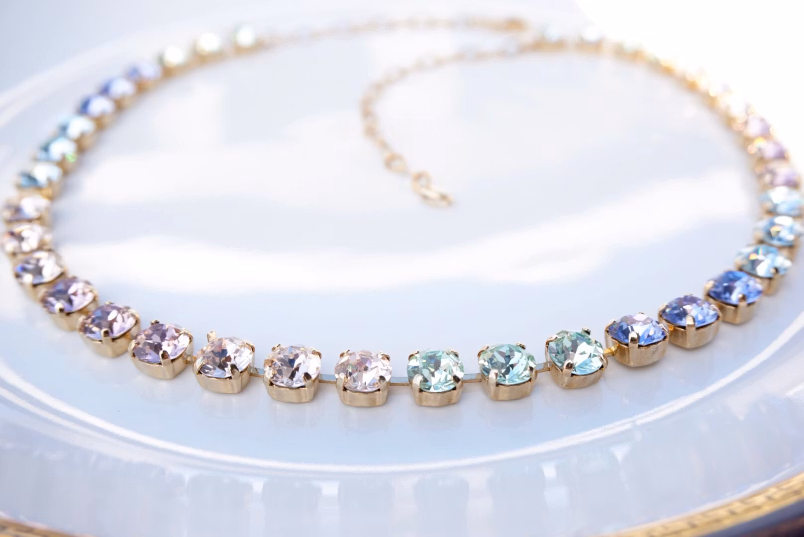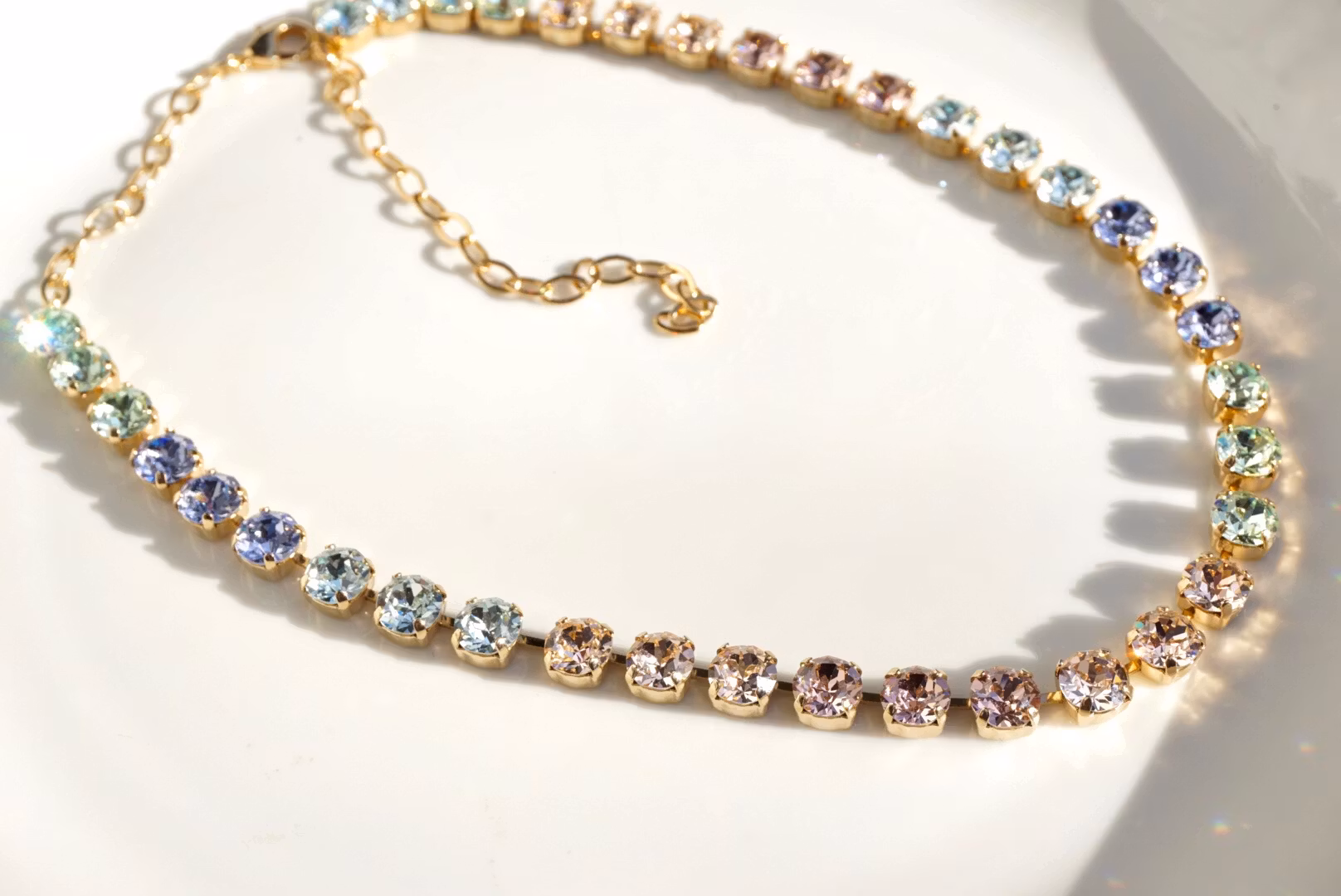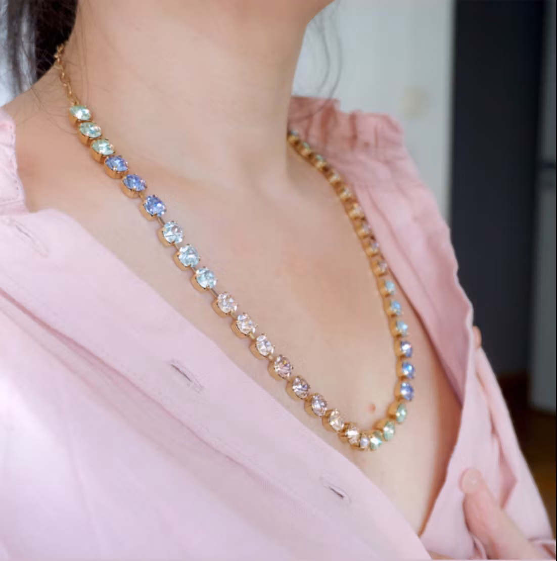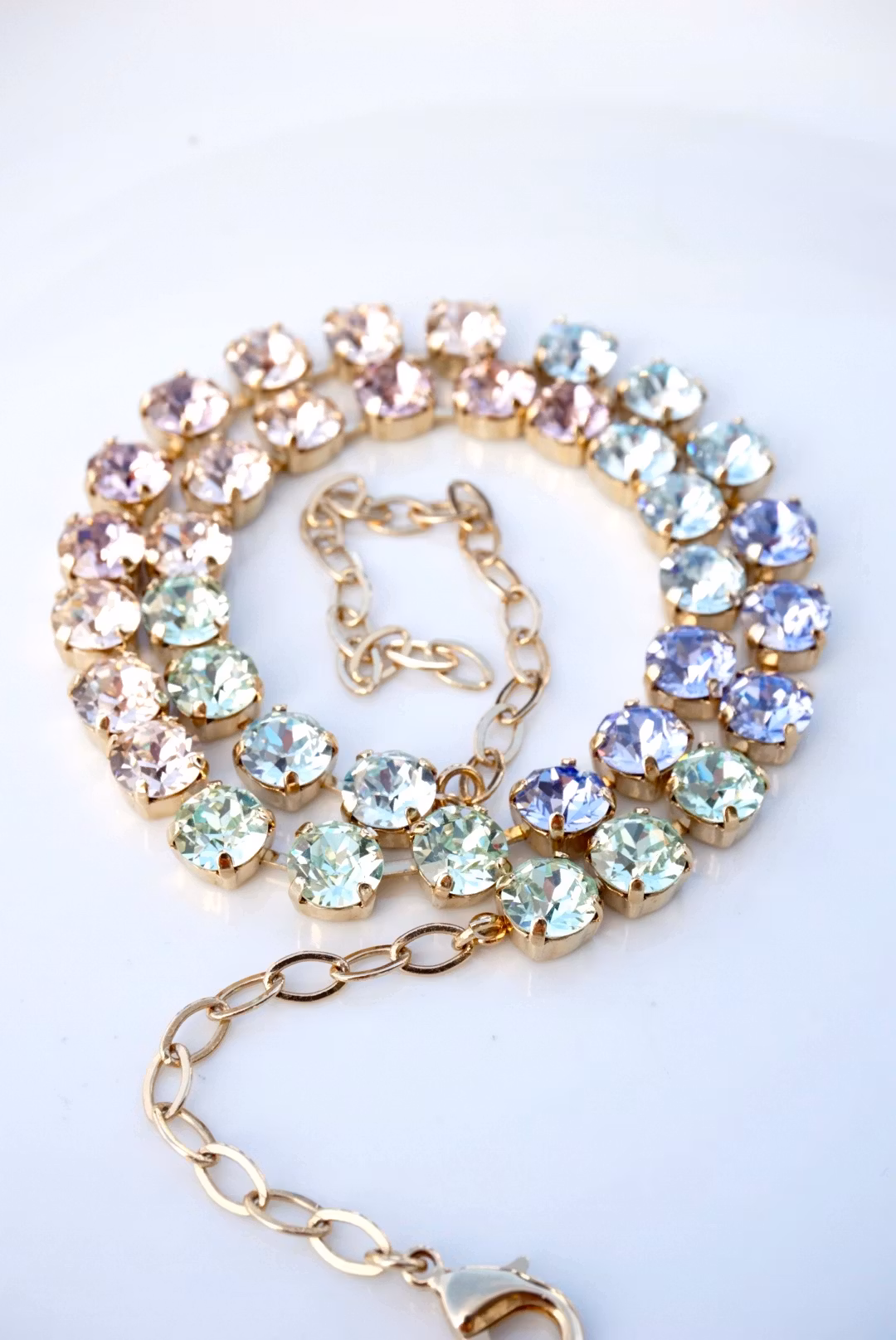 Lyse fine pasteller i dette kjedet! Du velger hvordan det skal henge, siden det kan være fra 45 til 56 cm langt pga lang ekstralenke.
