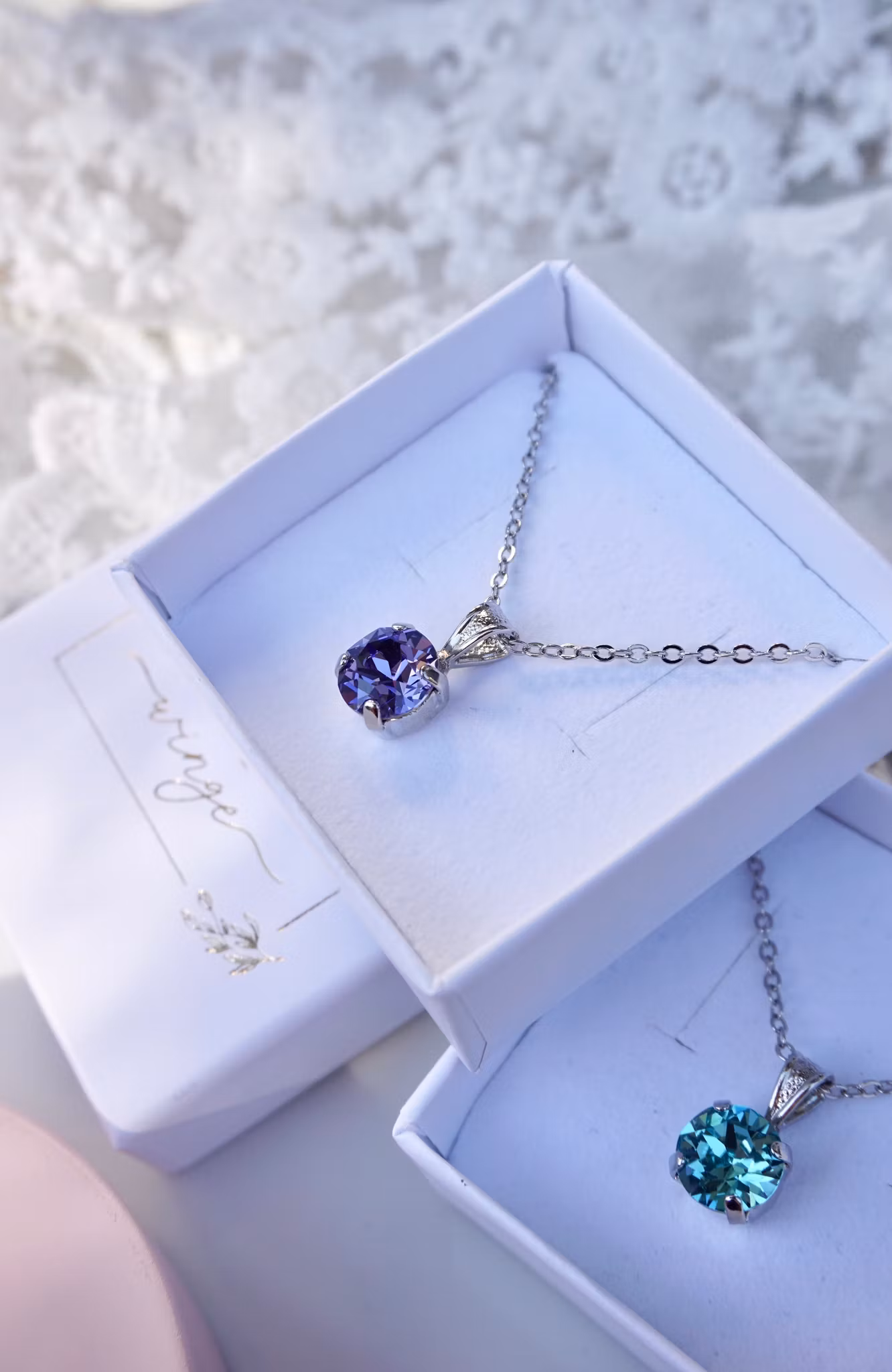 Søtt kjede i tynn rhodium- eller gullfarget lenke (ca 46cm) med en 8mm stor krystall i anhenget.