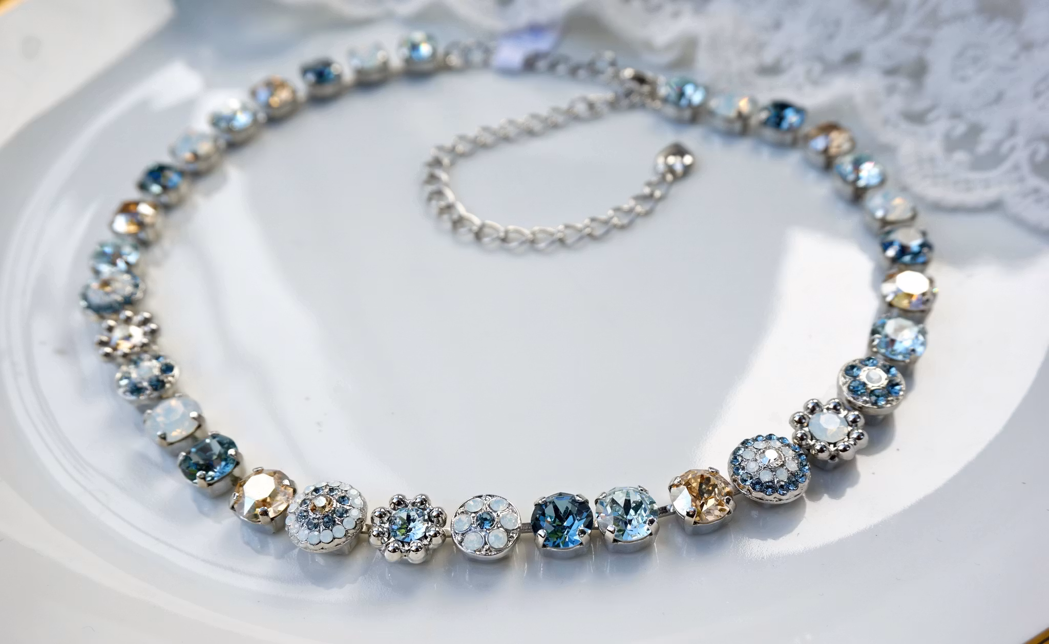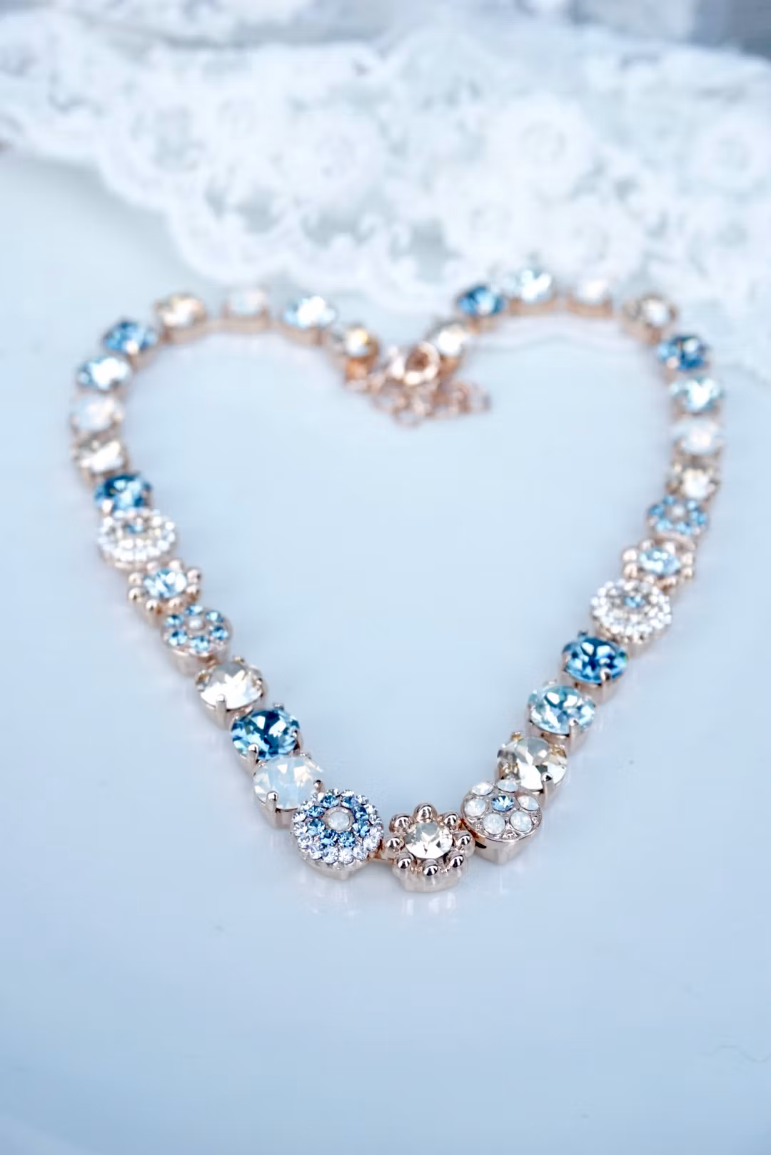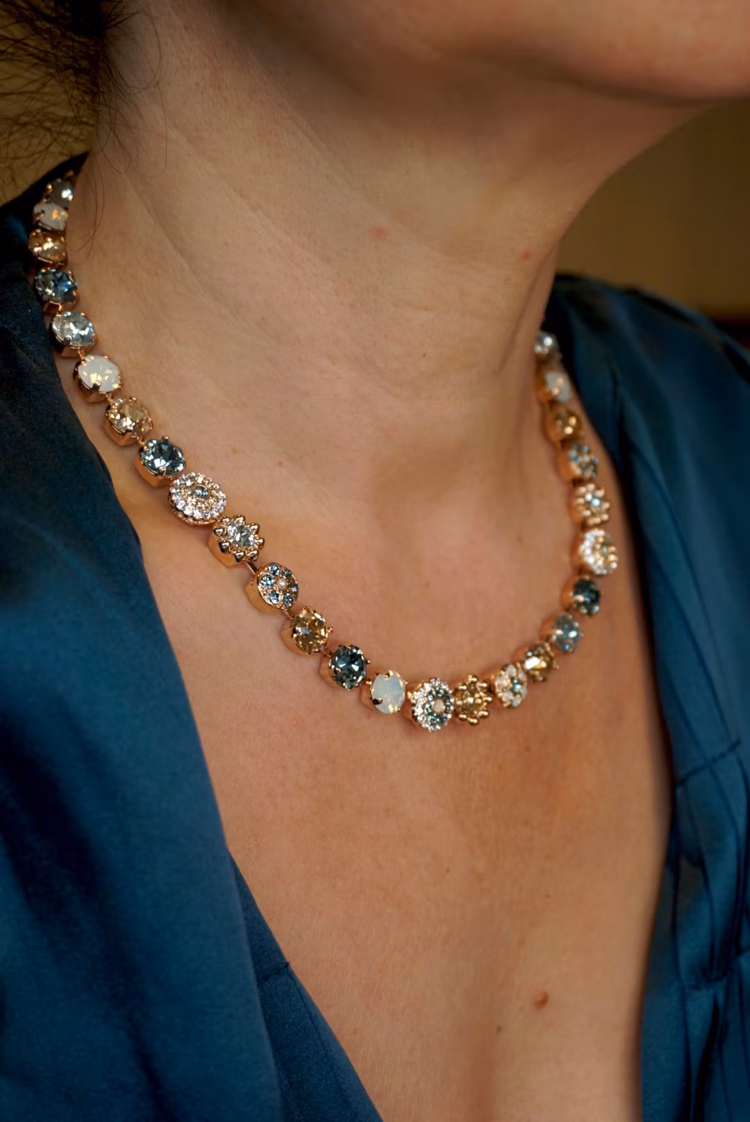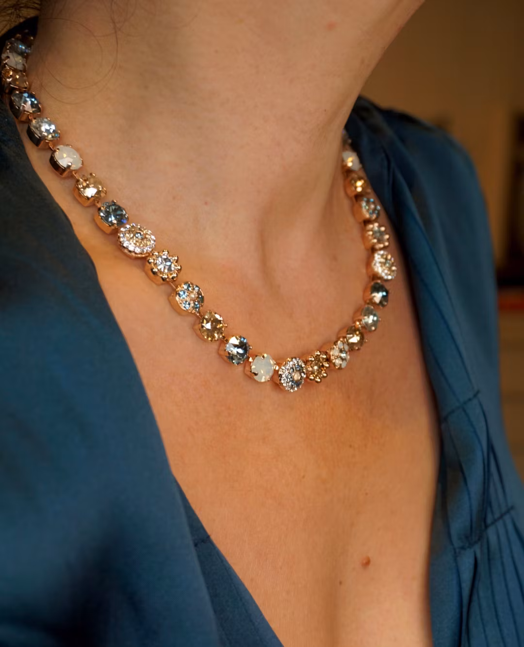 Nydelige farger i detaljert fantastisk halskjede, bestående av 8mm krystaller i bl.a. Indian Sapphire og Golden Shadow, blandet med bittesmå krystaller. Kjedet er i rhodium.