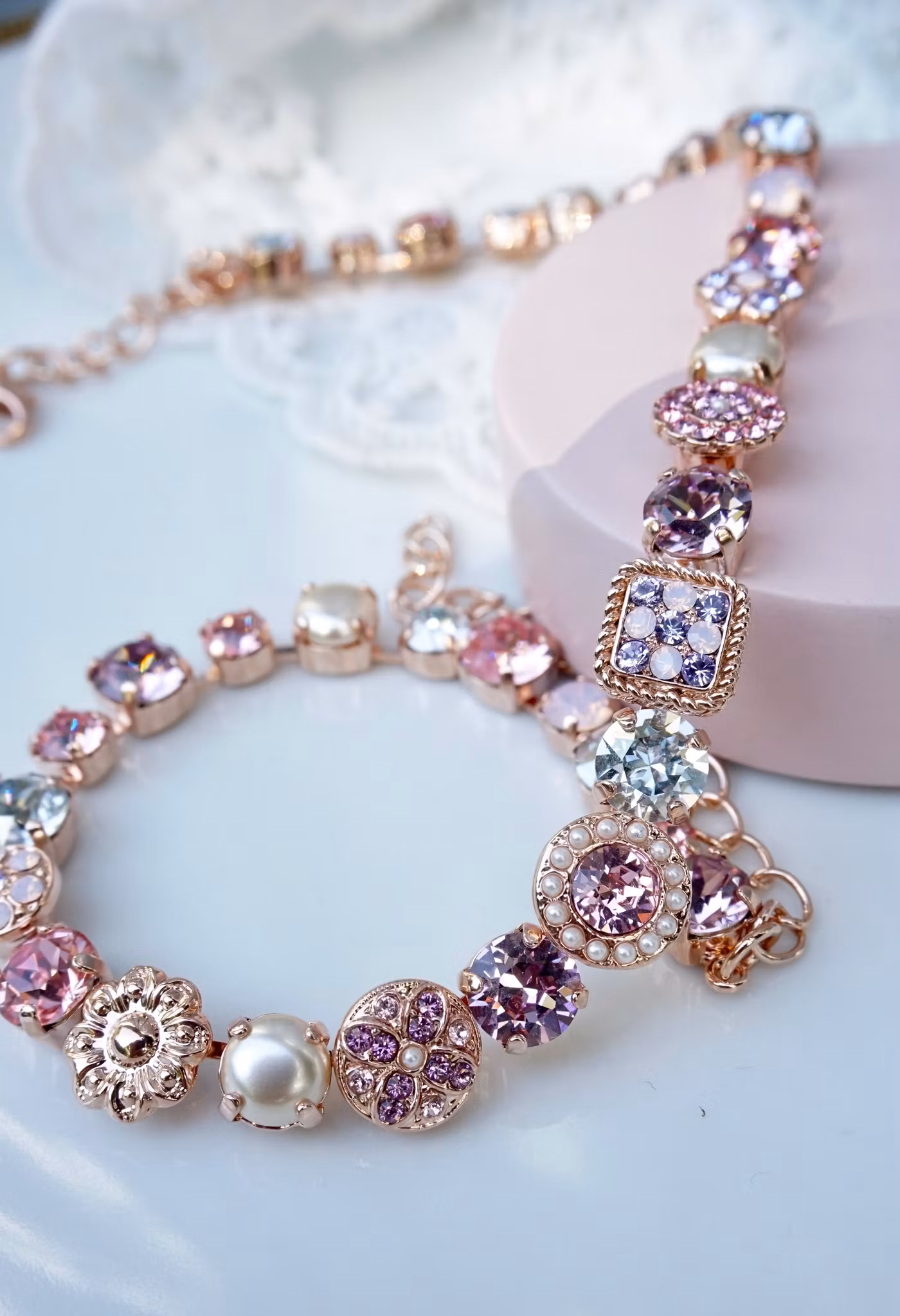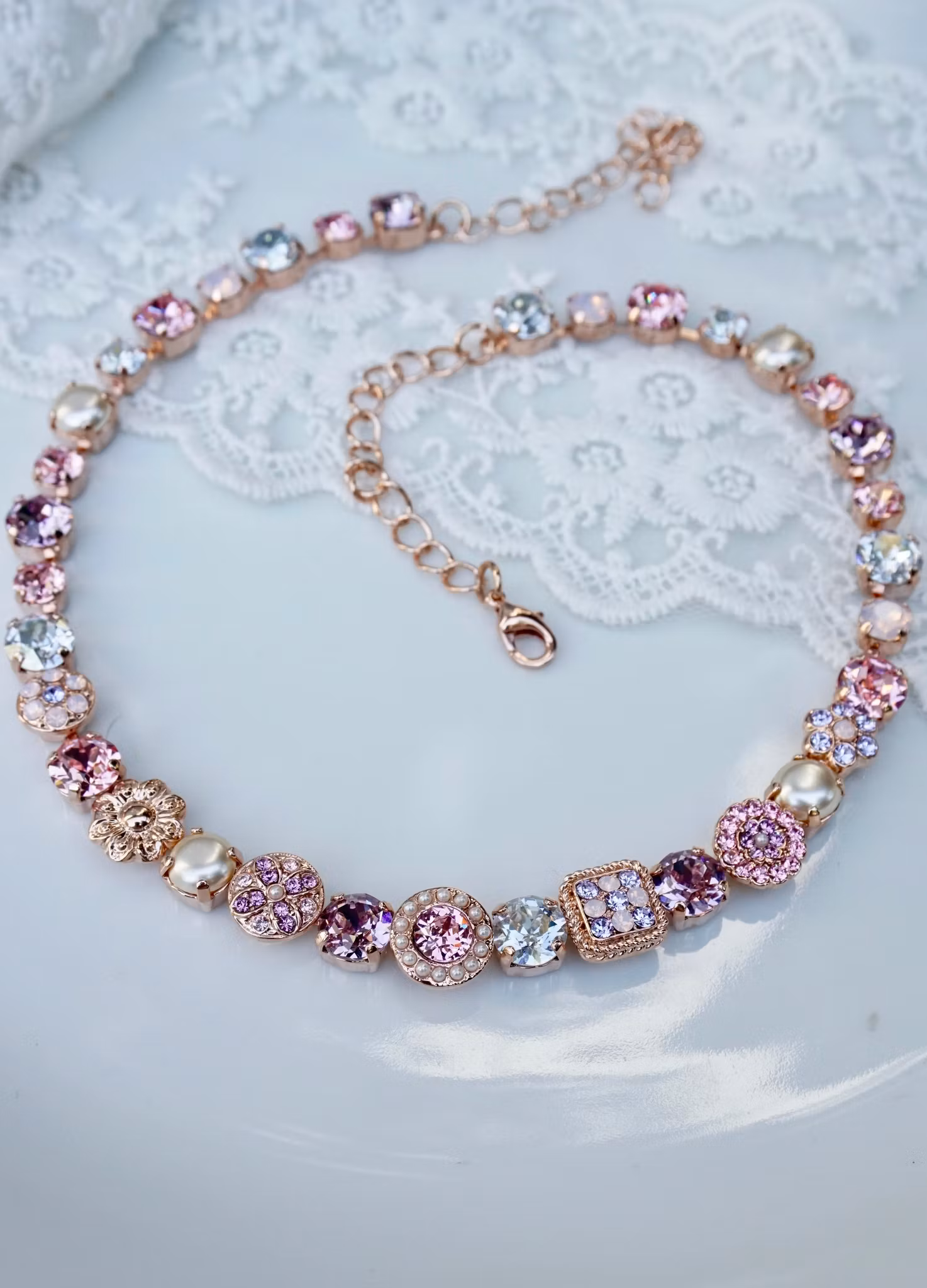 De vakreste farger i dette kjedet! Krystaller og krystallperler i mange forskjellige størrelser, fra 8mm til 1mm, satt i rosegull innfatning. Bak er det lenke slik at lengden kan varieres.