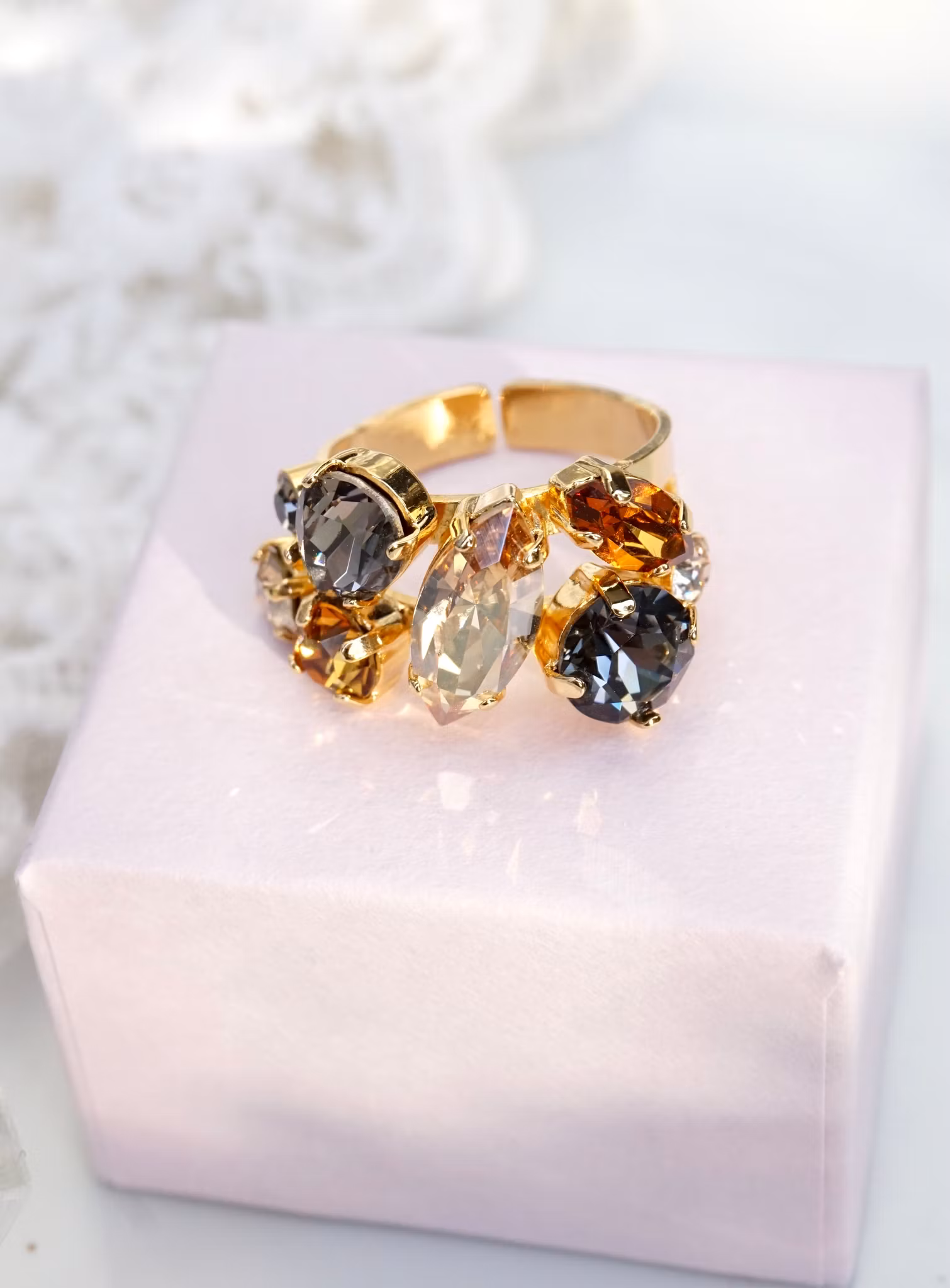 Den vakreste ringen! Forskjellige grå- og varmbrune fargede krystaller blandet, i gullinnfatning. Den er åpen bak slik at den kan reguleres.
