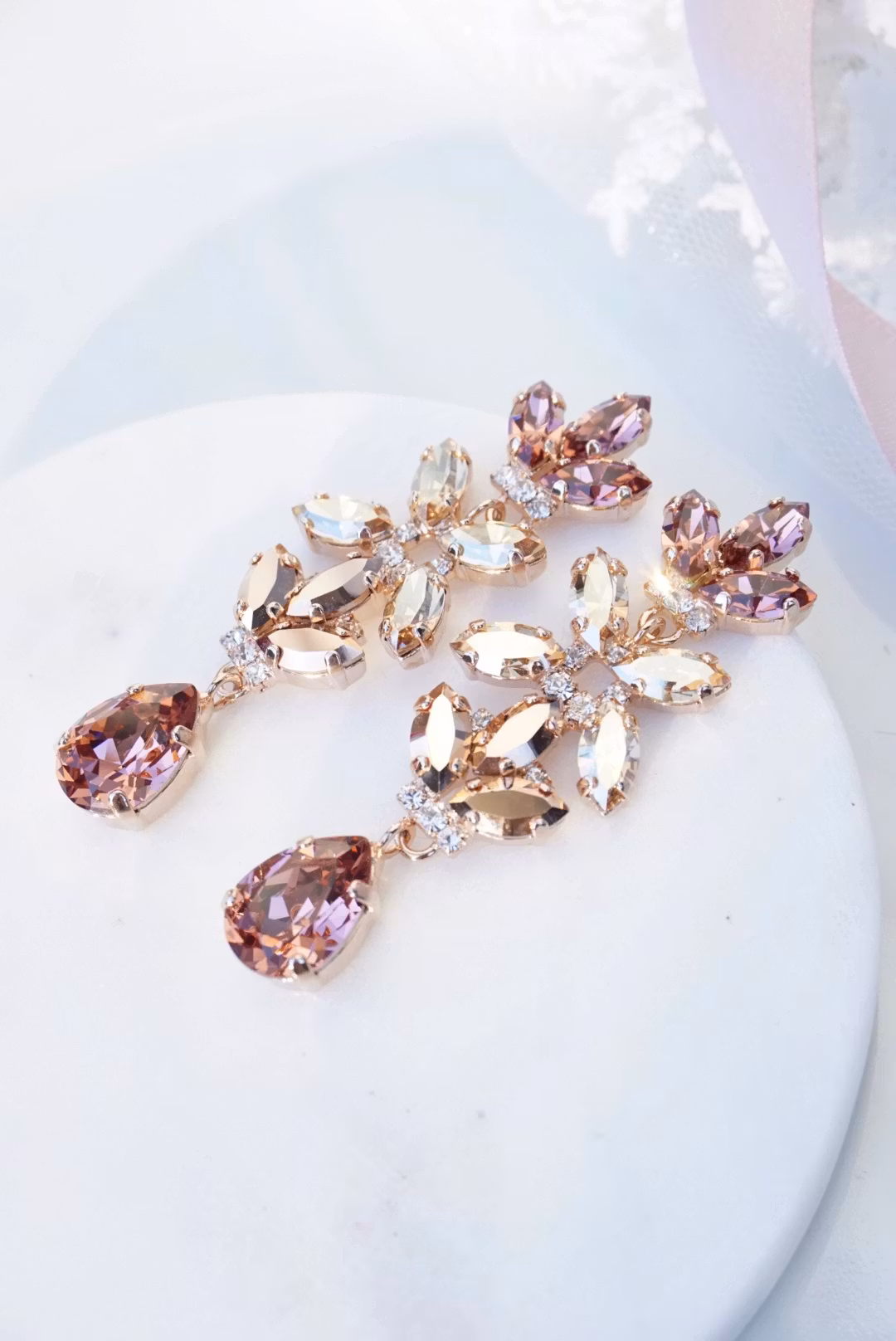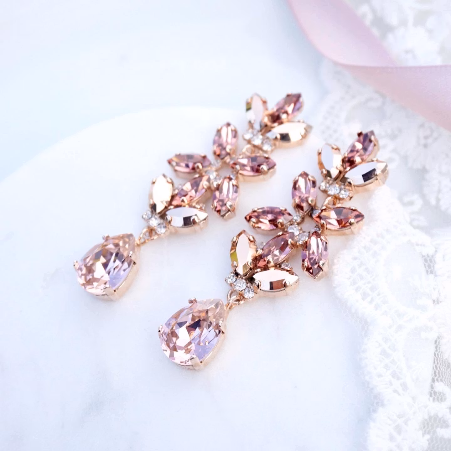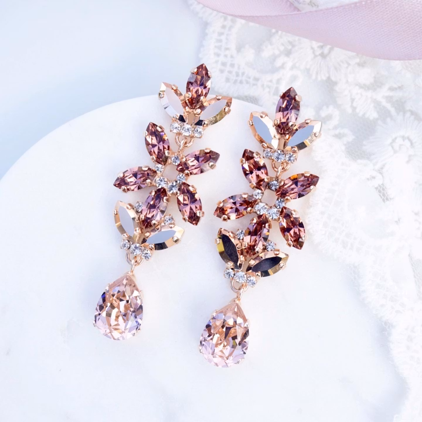 Fantastiske øredobber med mange nydelige detaljer. Her i rosegull med krystaller i blush. Bittesmå blanke krystaller innimellom. De er slanke og føles ikke tunge.