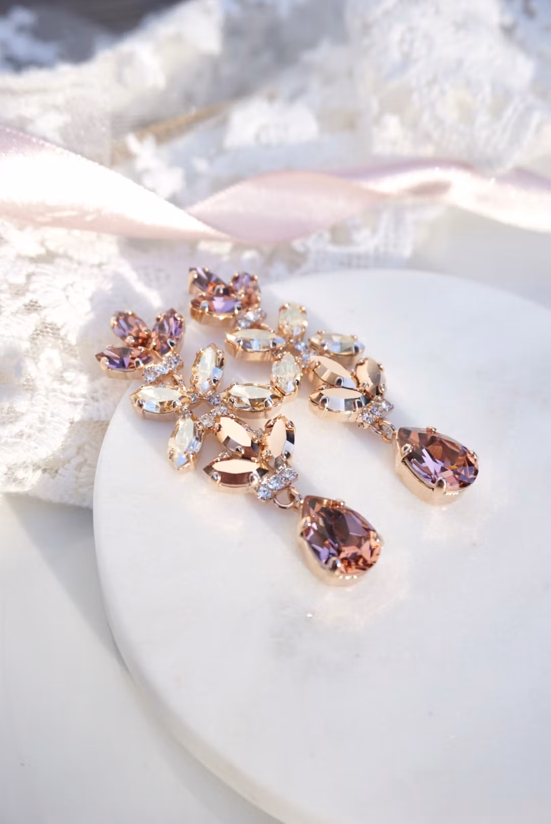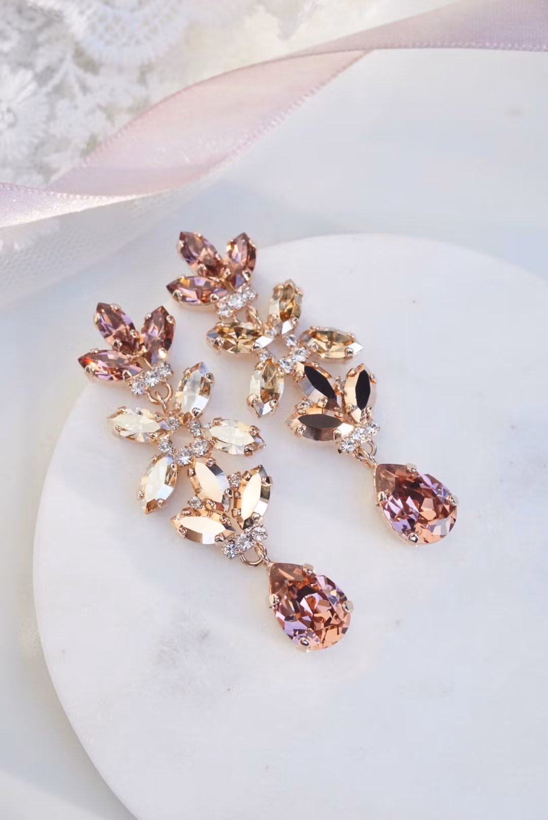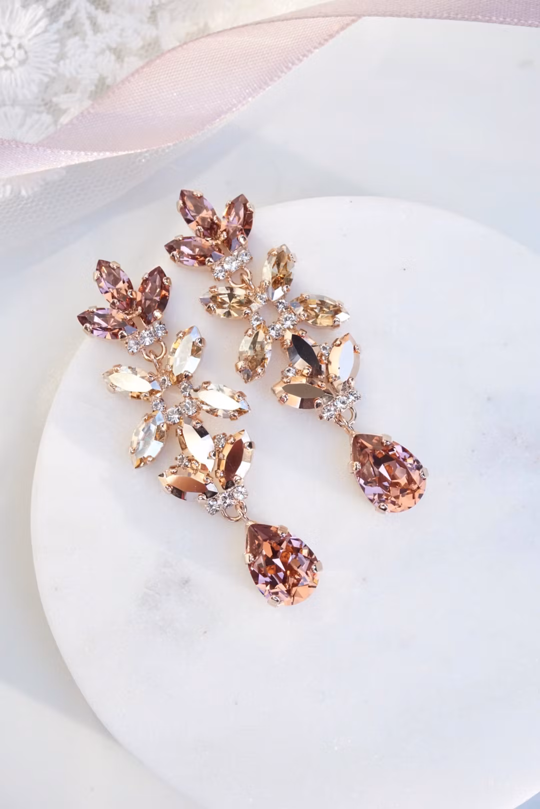 Fantastiske øredobber med mange nydelige detaljer. Her i rosegull med krystaller i blush. Bittesmå blanke krystaller innimellom. De er slanke og føles ikke tunge.