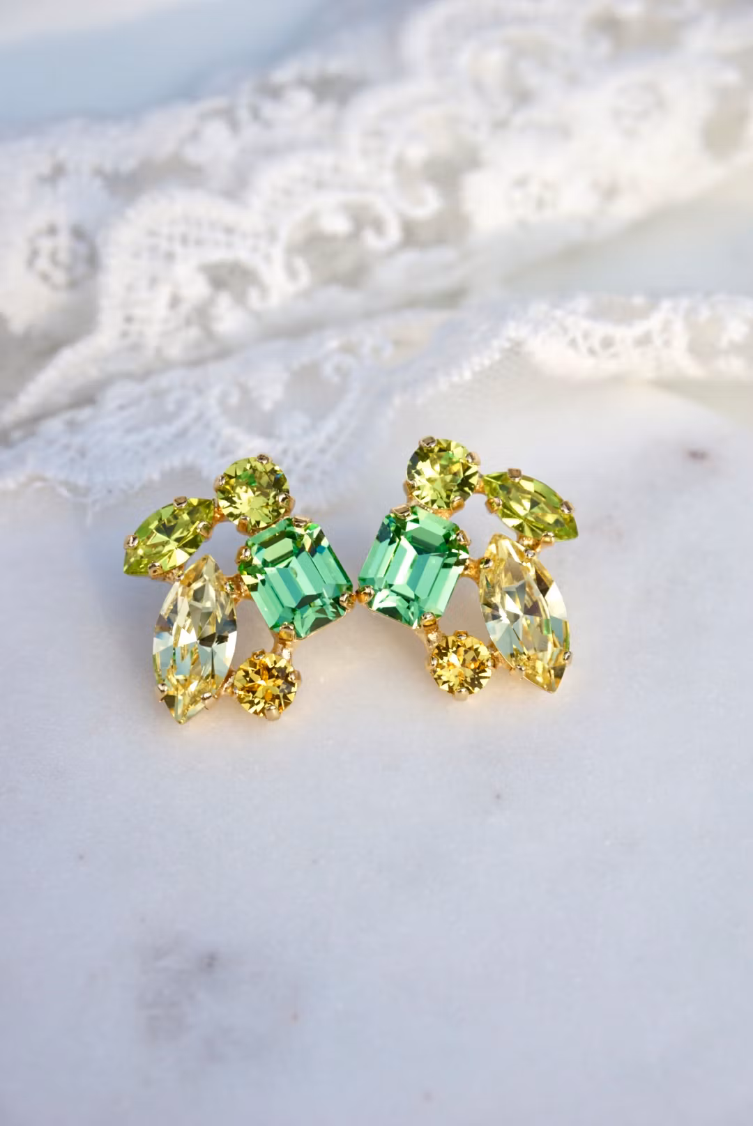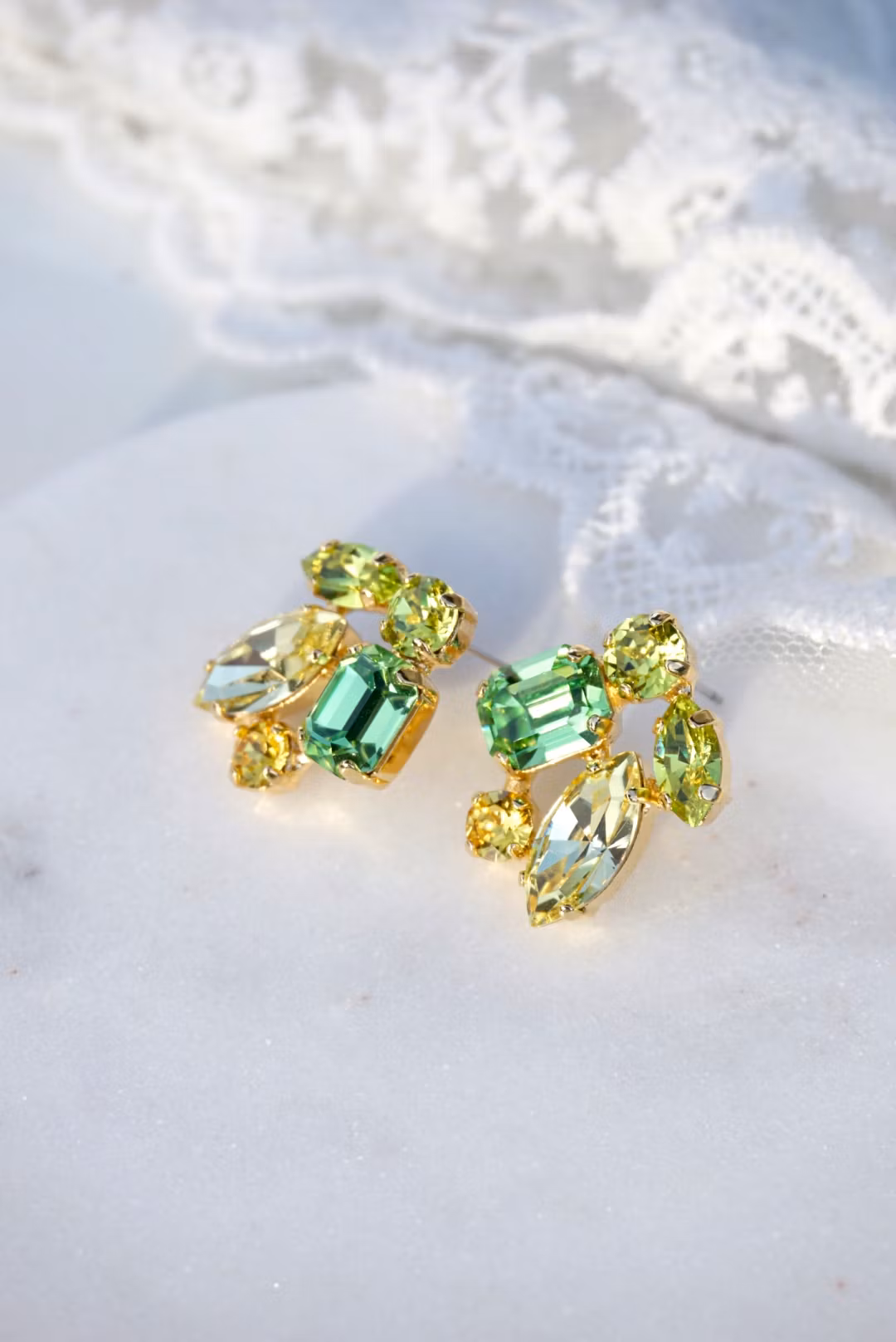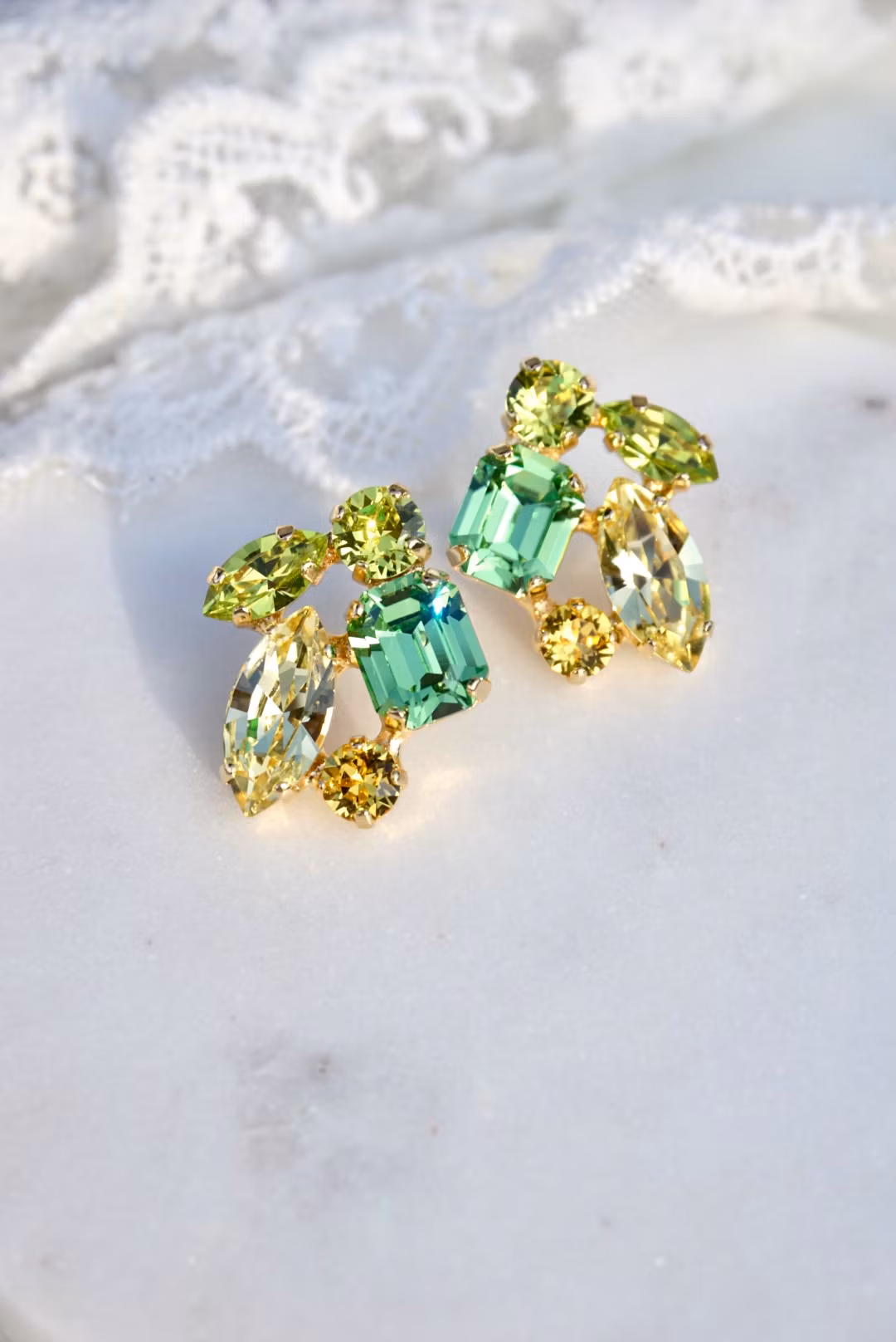 Fine detaljerte øredobber med citrusfargede krystaller i gullinnfatning. Passer alle som vil skinne litt en dag! Kan lages med andre farger.