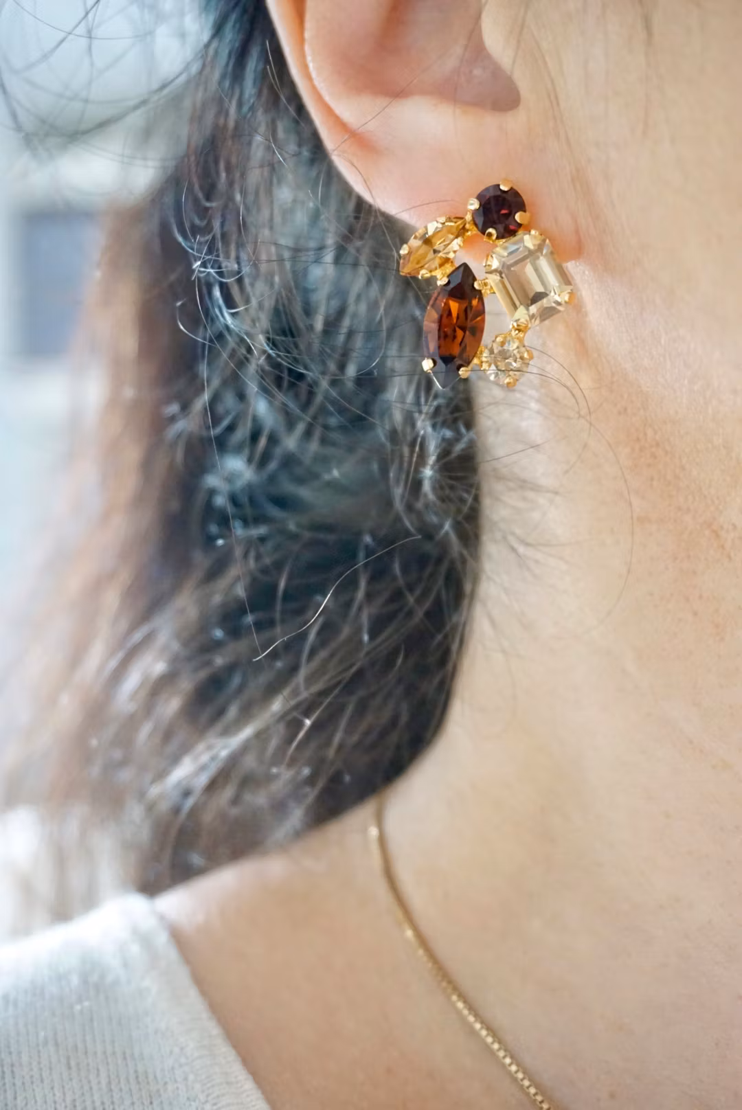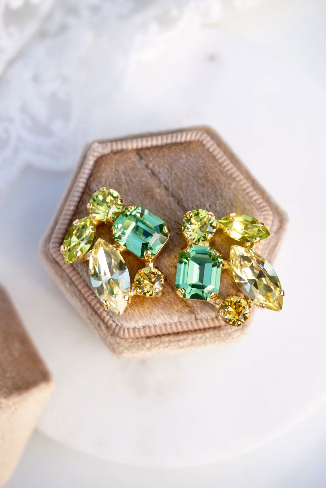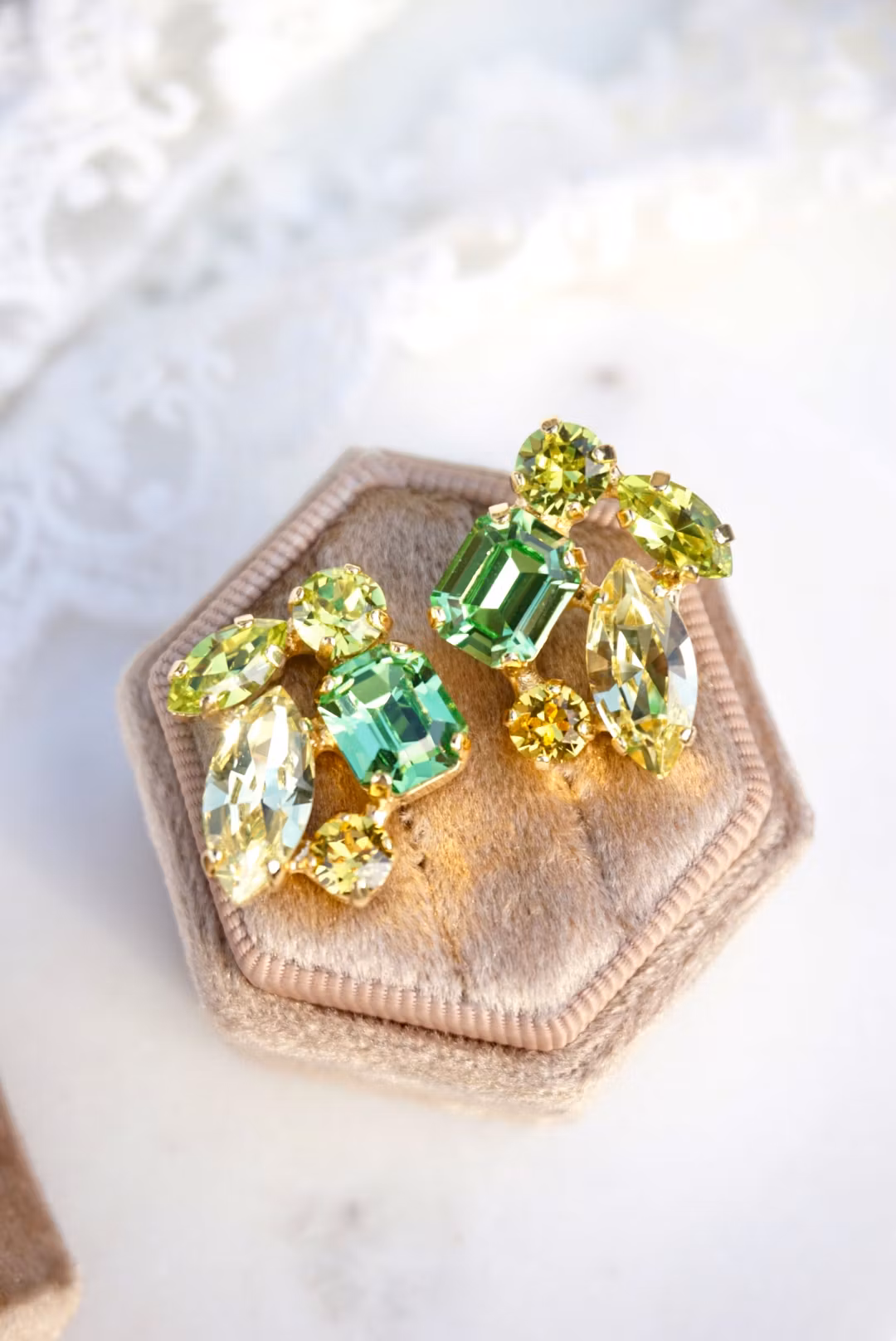 Fine detaljerte øredobber med citrusfargede krystaller i gullinnfatning. Passer alle som vil skinne litt en dag! Kan lages med andre farger.