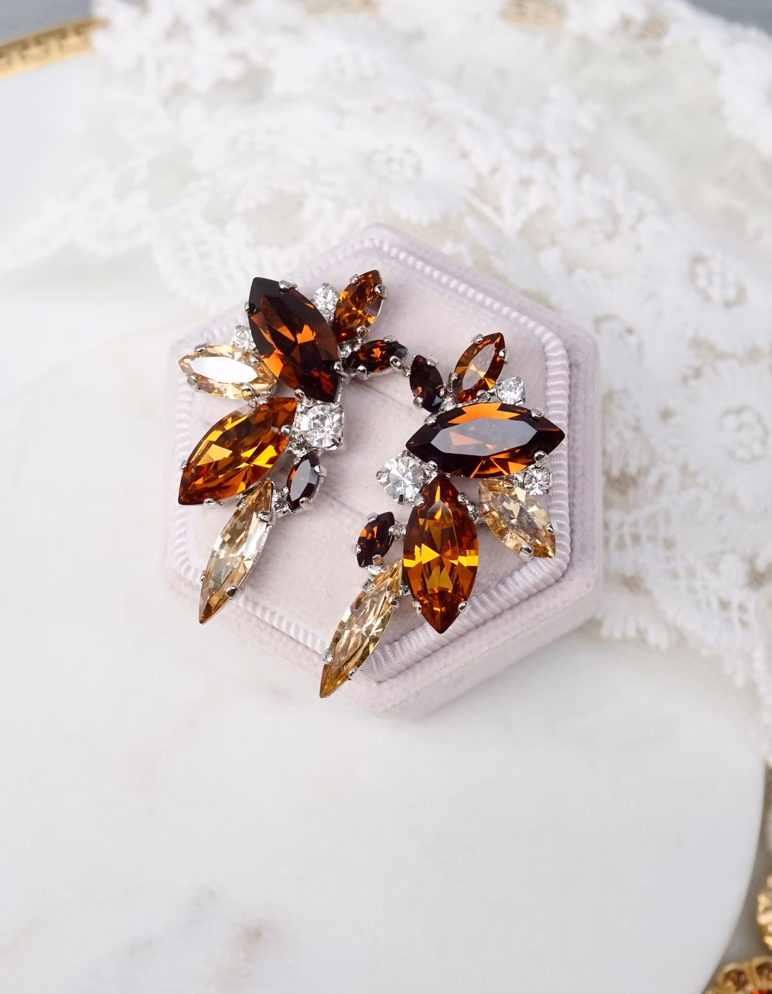Staselige øredobber i dype brunfarger og champagne, og rhodium innfatning.