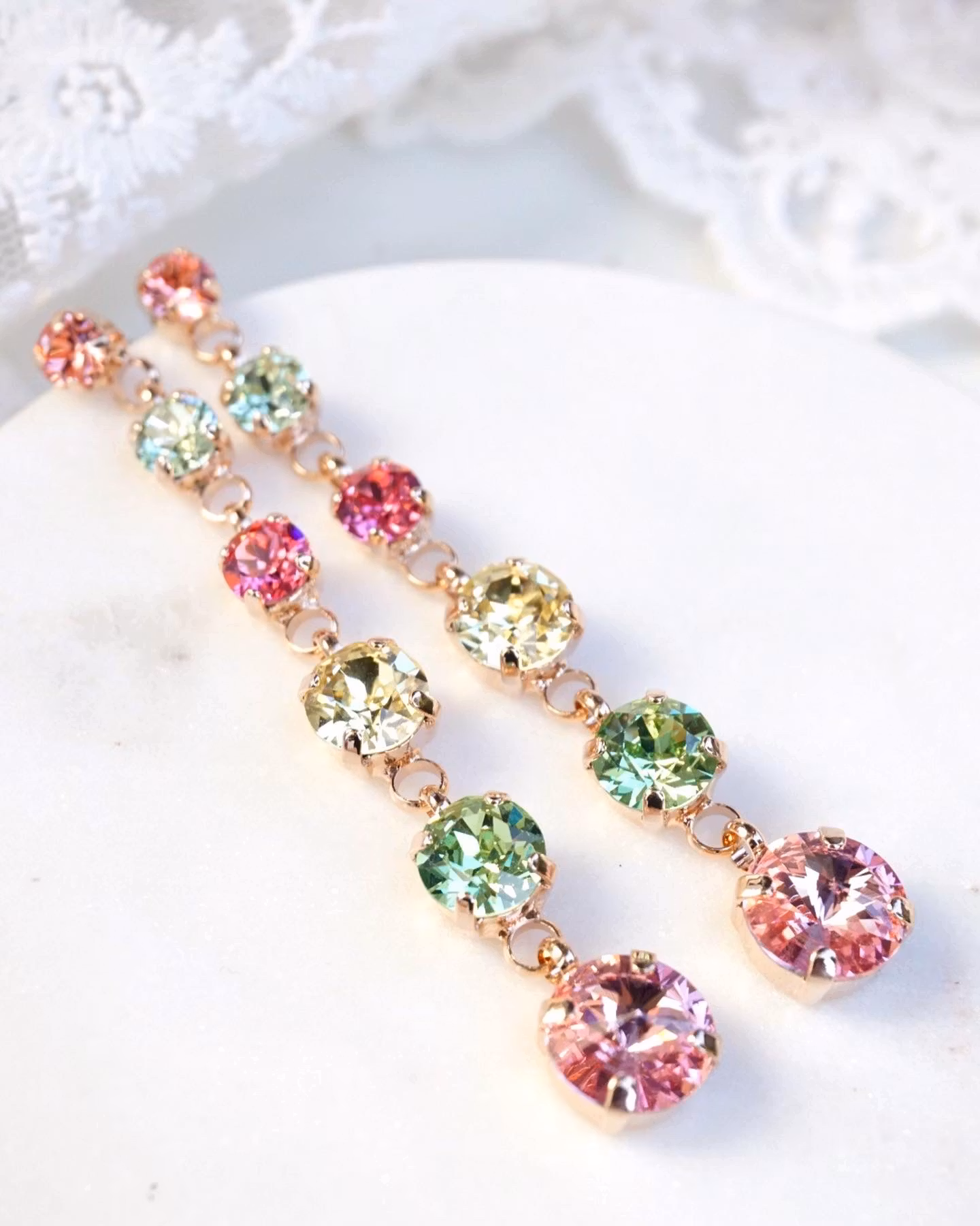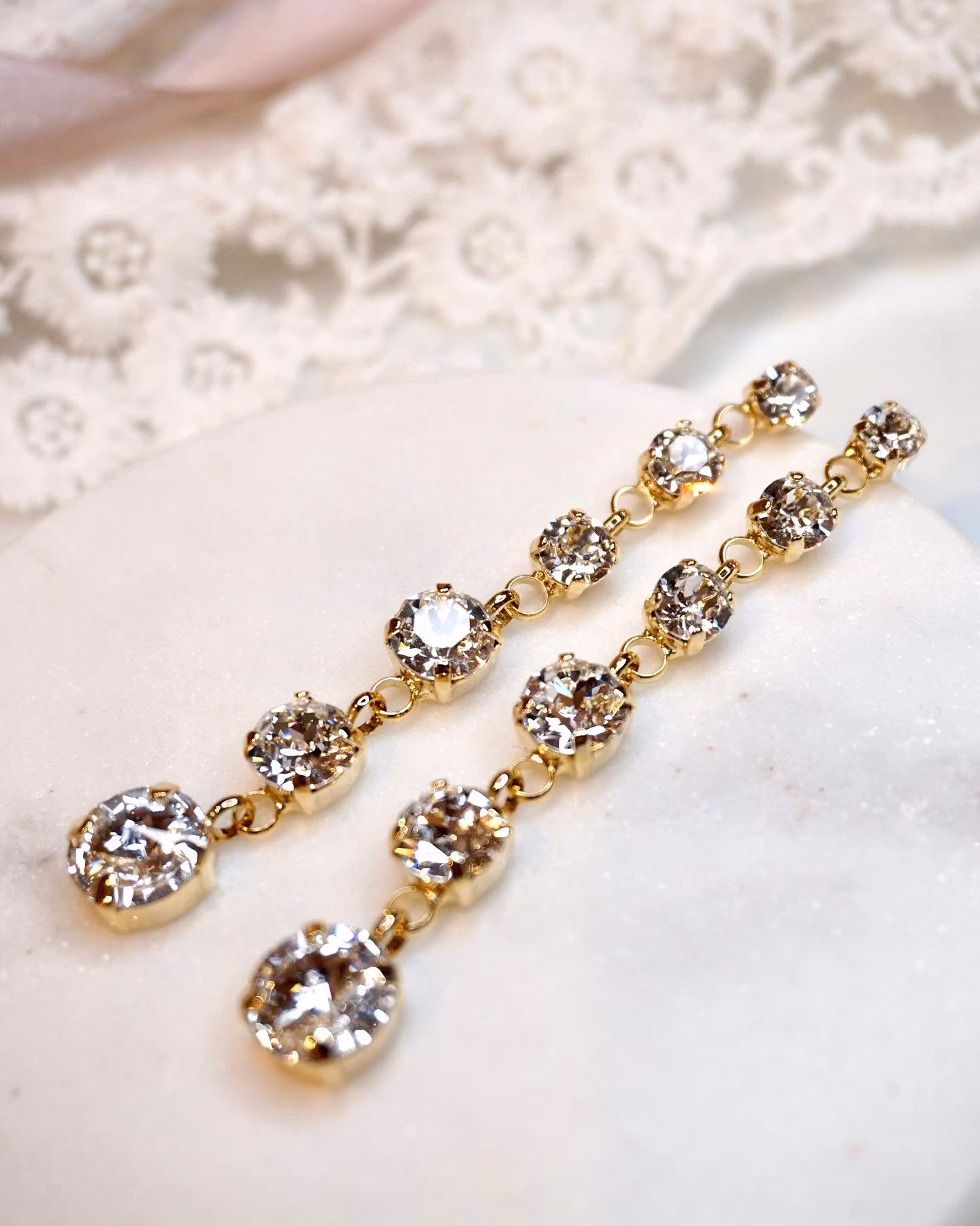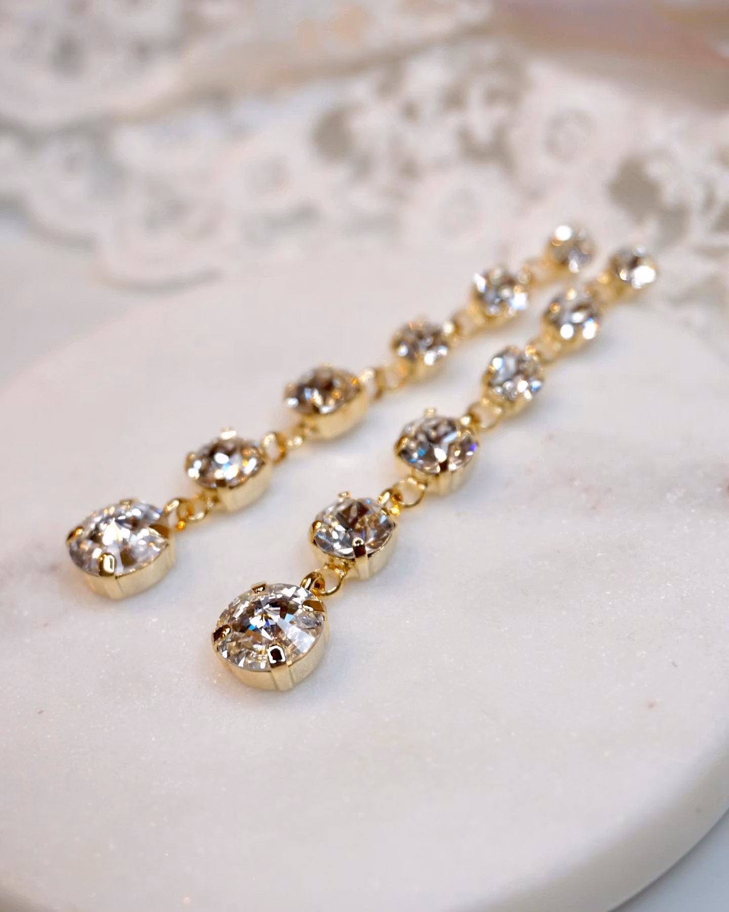 Lange, smale og glitrende! Lys sølv- eller gullinnfatning og blanke krystaller som passer en brud som vil skinne eller til et gøyalt festantrekk.