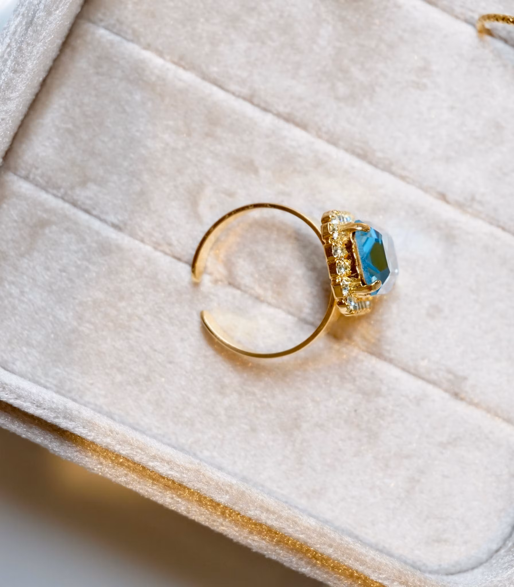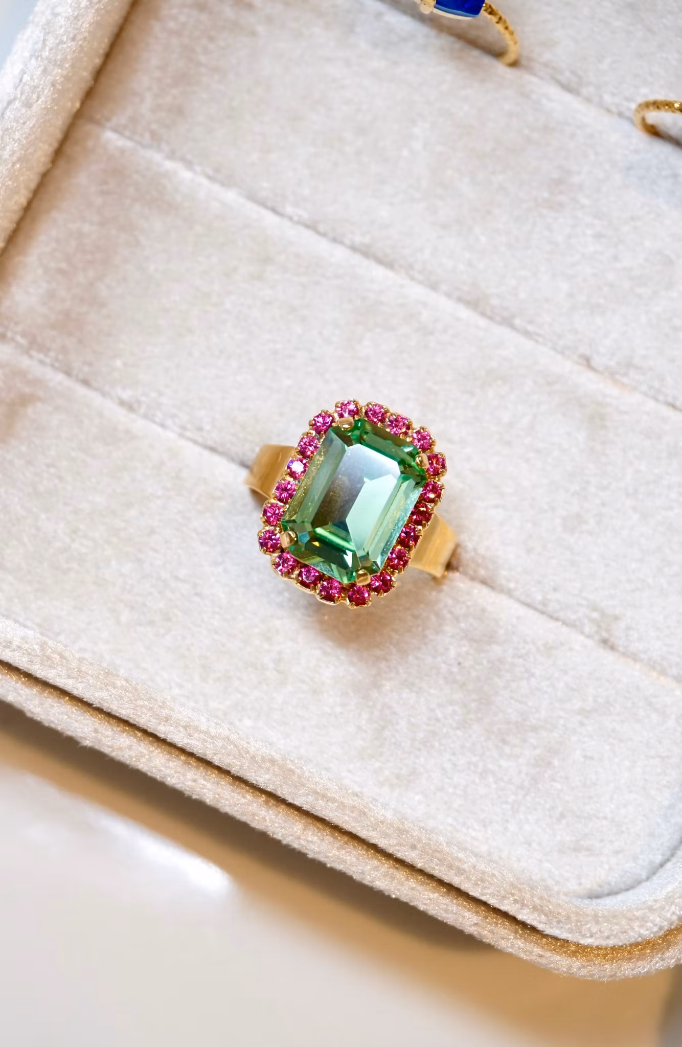 Søt ring med rektangelformet krystall og blingkant med farge. Åpen bak så den kan klemmes ut eller inn. Krystallen måler 14x10mm.