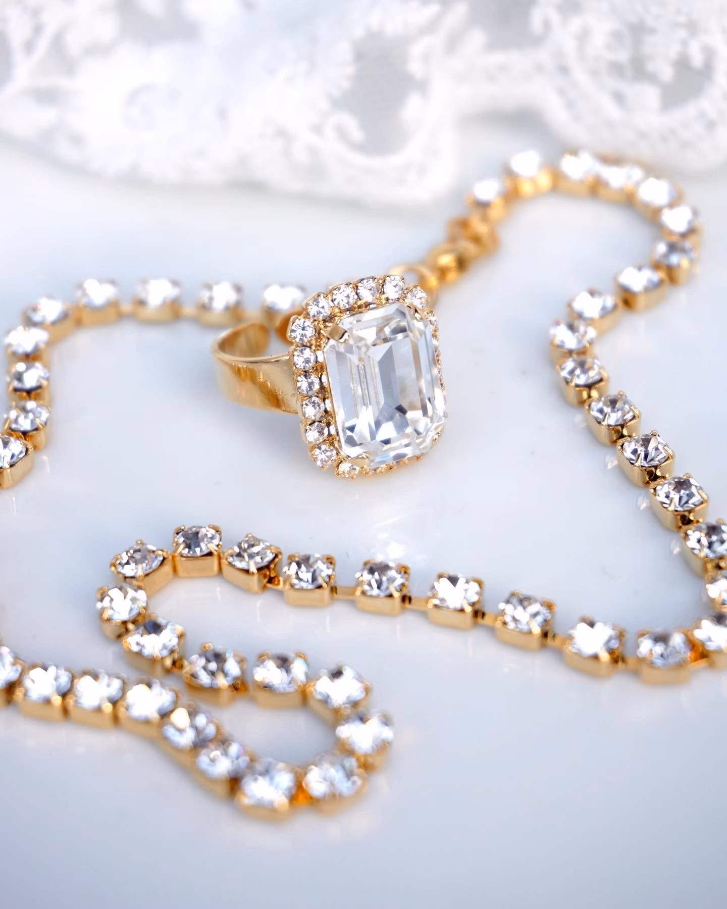Elisabeth ring 0,- 515,- Produktet finnes dessverre ikke på lager. Søt ring med rektangelformet krystall og blingkant. Åpen bak så den kan klemmes ut eller inn. Krystallen måler 14x10mm.Velg mellom: 1. Crystal/gull2. Emerald/gull Nikkelfritt Flere populære produkter Melisande ring Utsolgt Melisande ring Utsolgt Poppea ring dråpe 450,- Poppea ring dråpe Utsolgt Sophie ring 590,- Hjertering 380,-